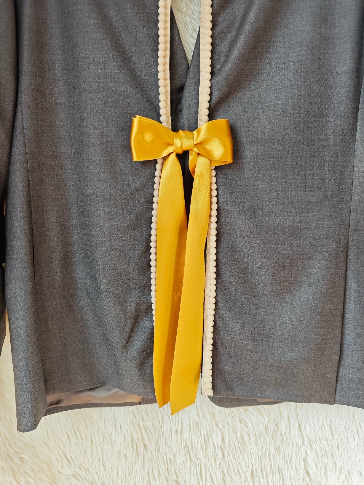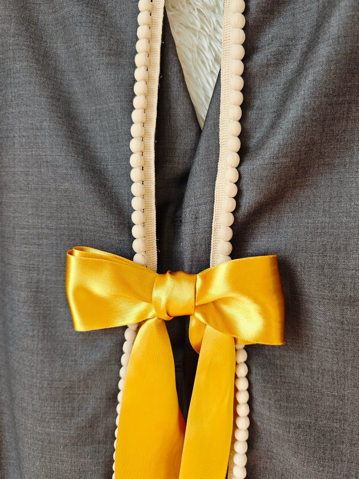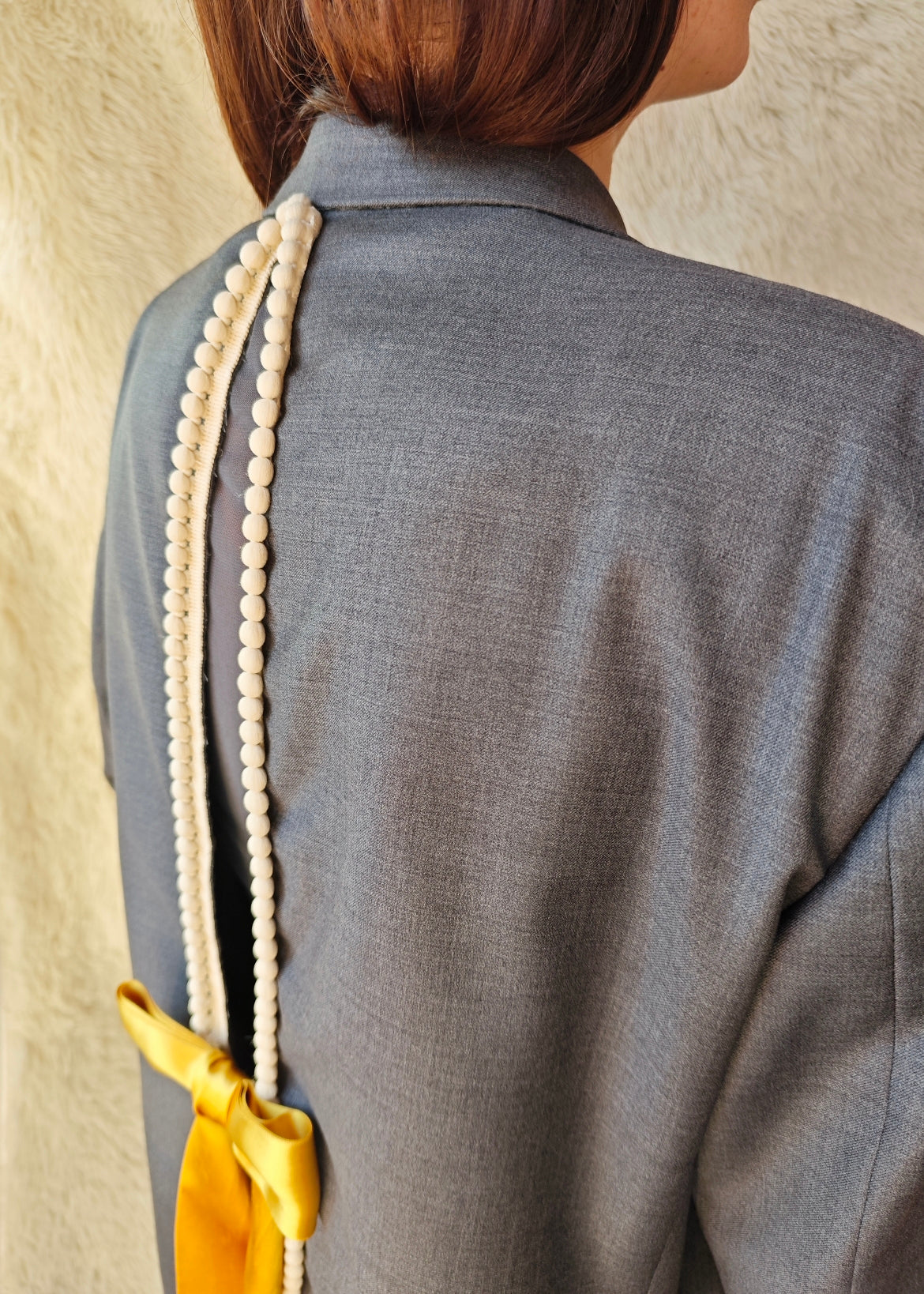 Sul retro, un’apertura verticale è rifinita con pompon écru e completata da un nastro in raso senape che termina con un fiocco