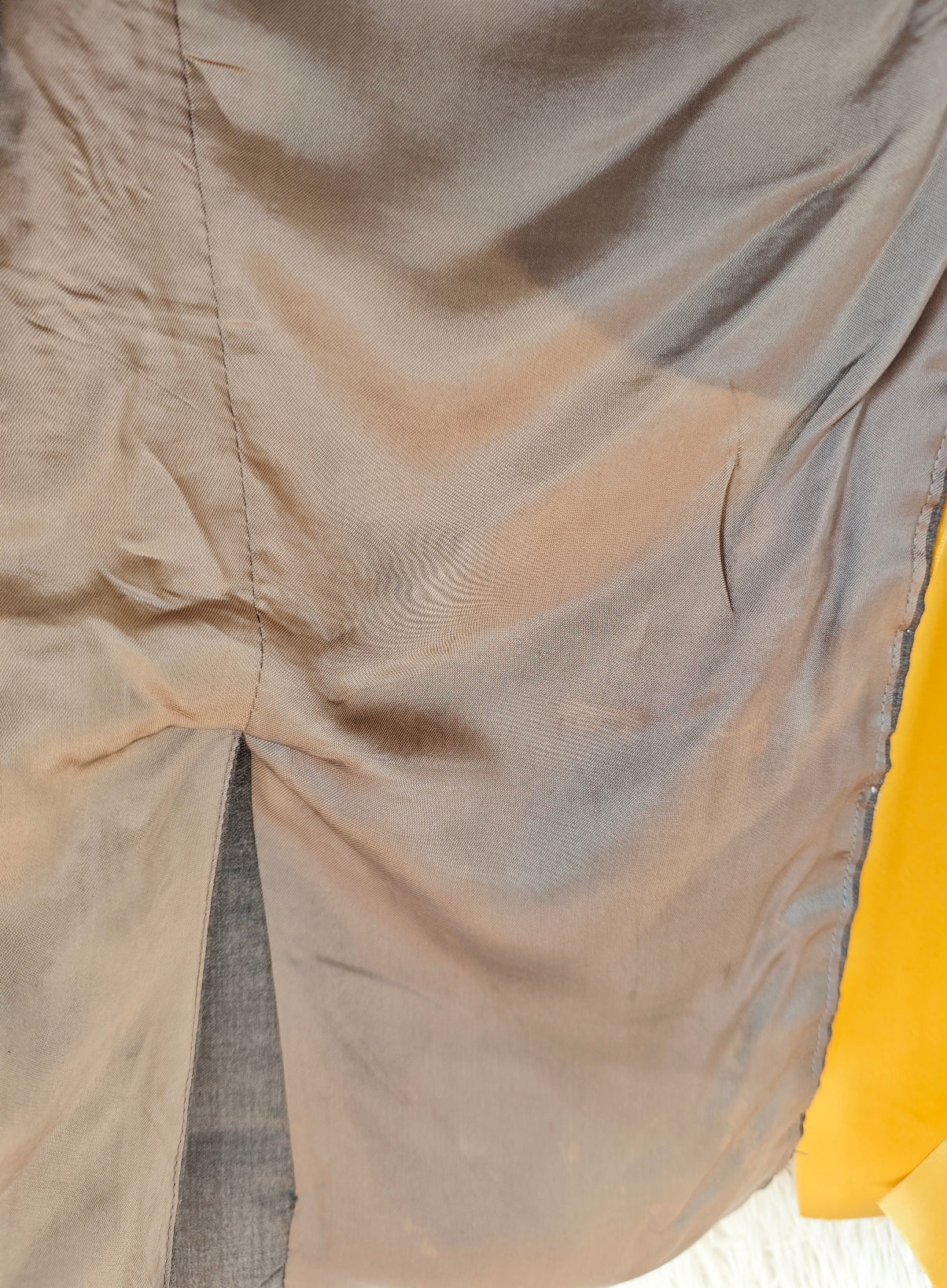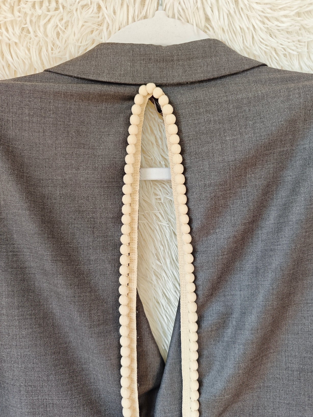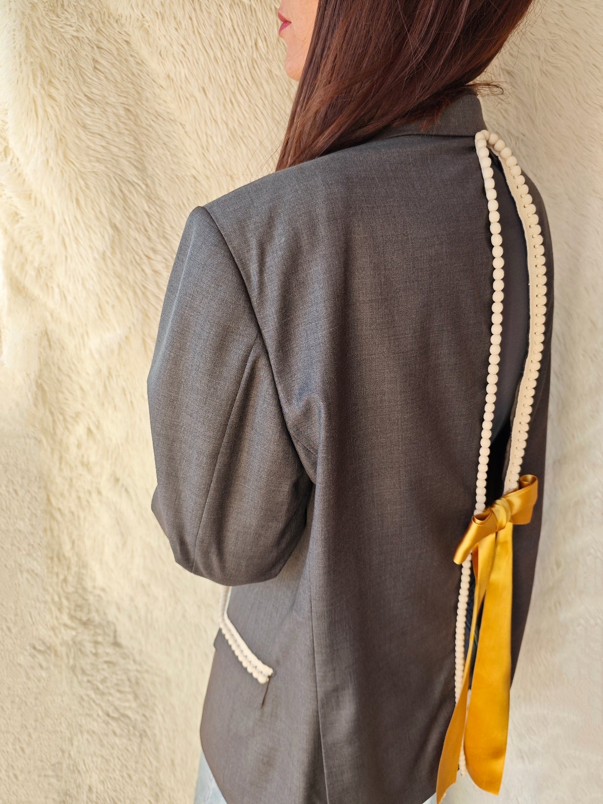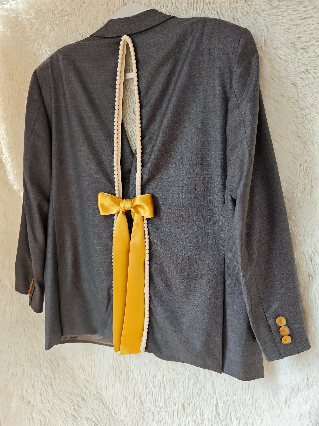 Sul retro, un’apertura verticale è rifinita con pompon écru e completata da un nastro in raso senape che termina con un fiocco