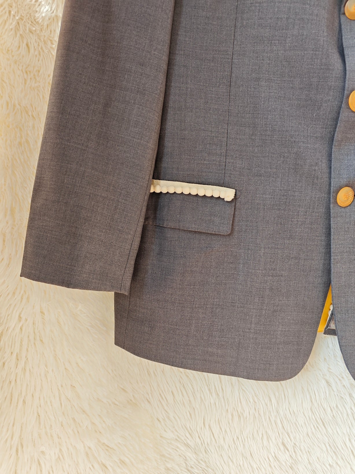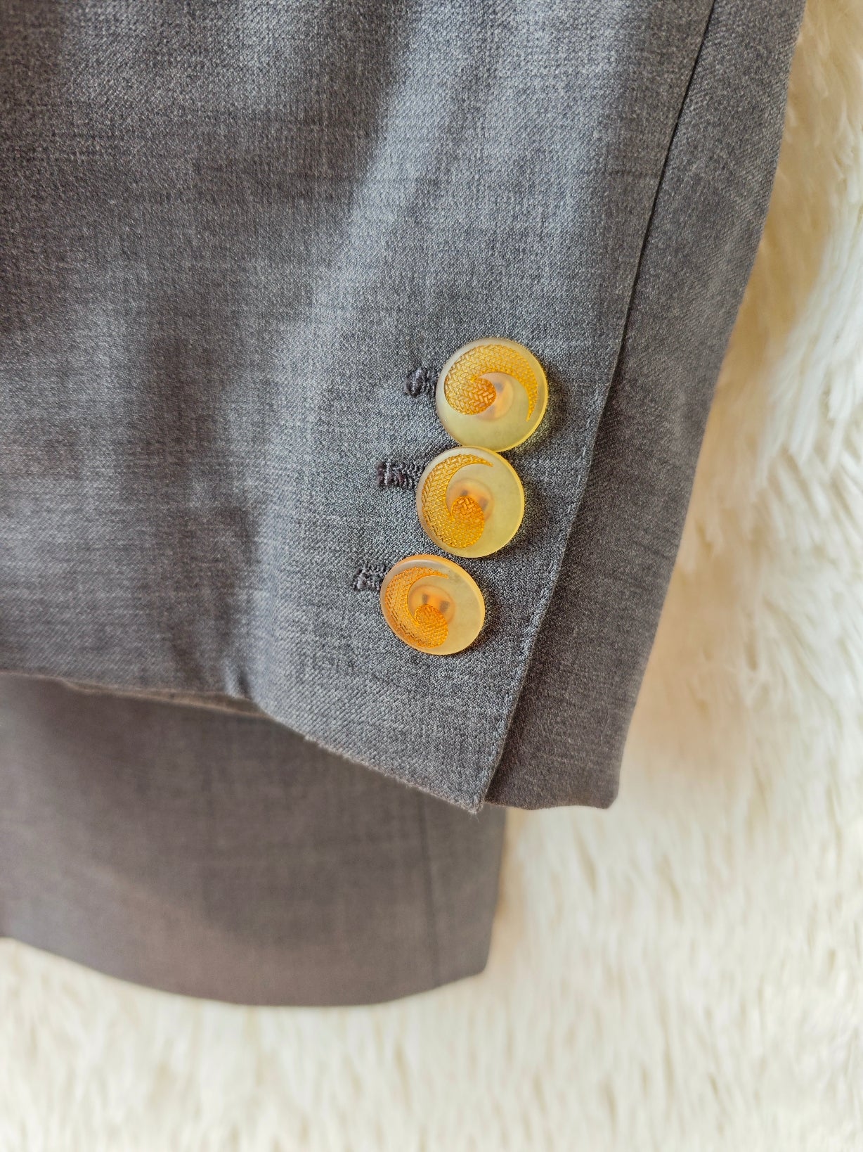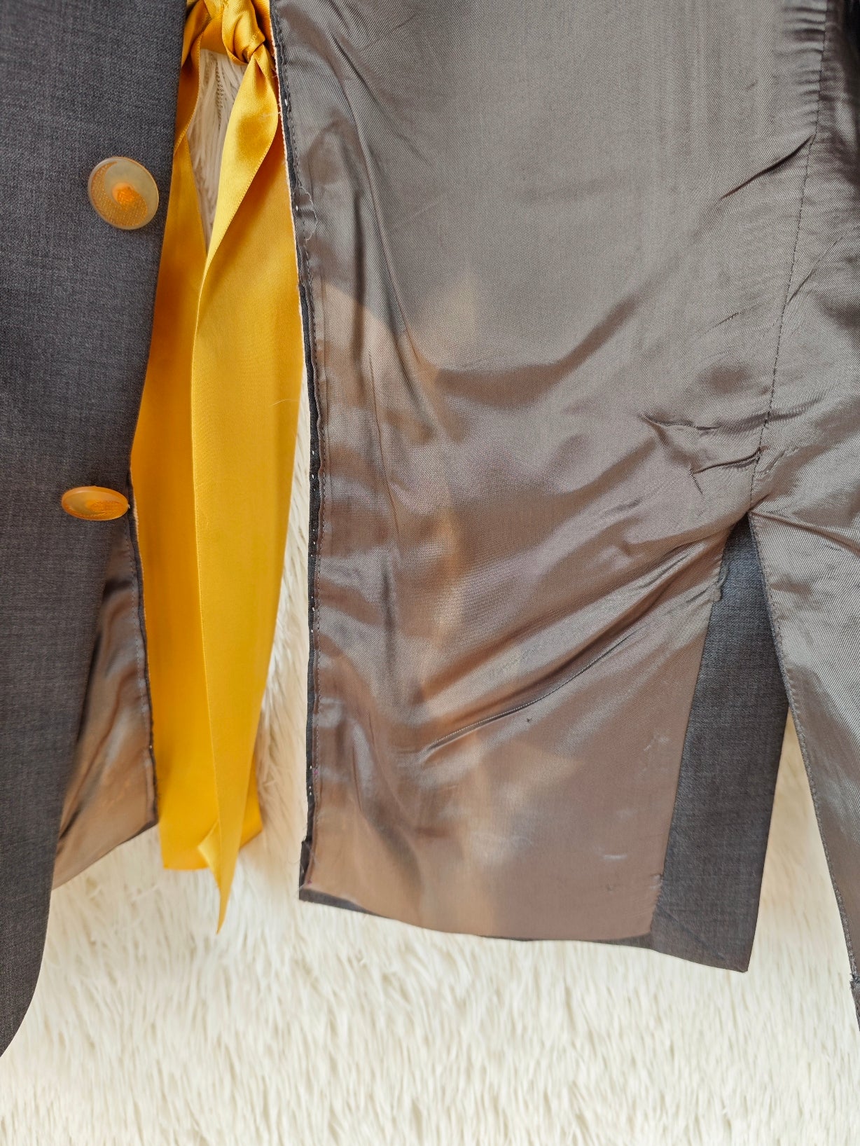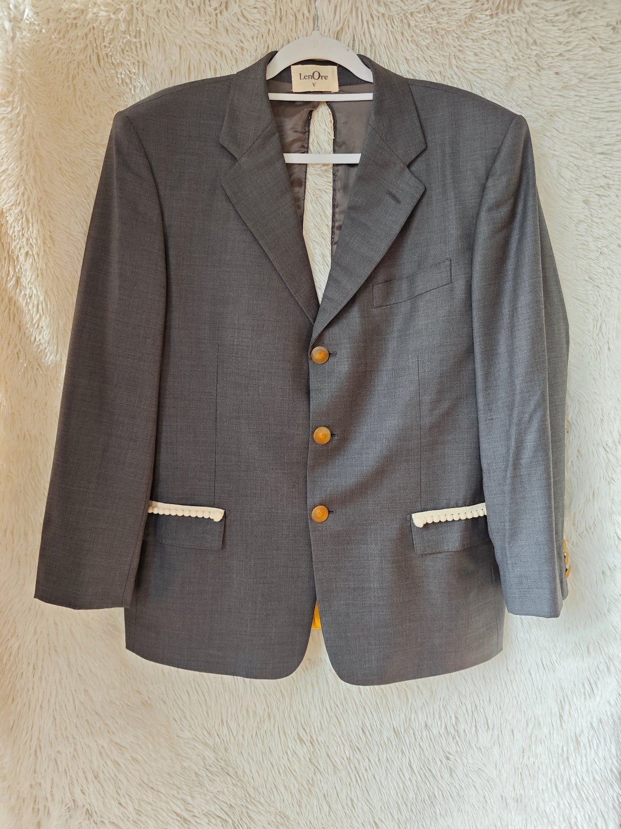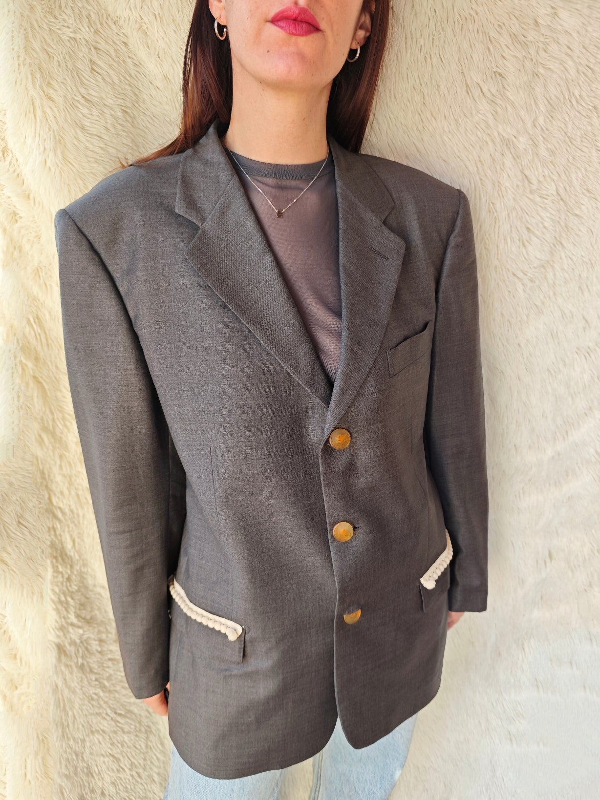 Blazer vintage grigio antracite, rivisitato attraverso un intervento di upcycling sartoriale.