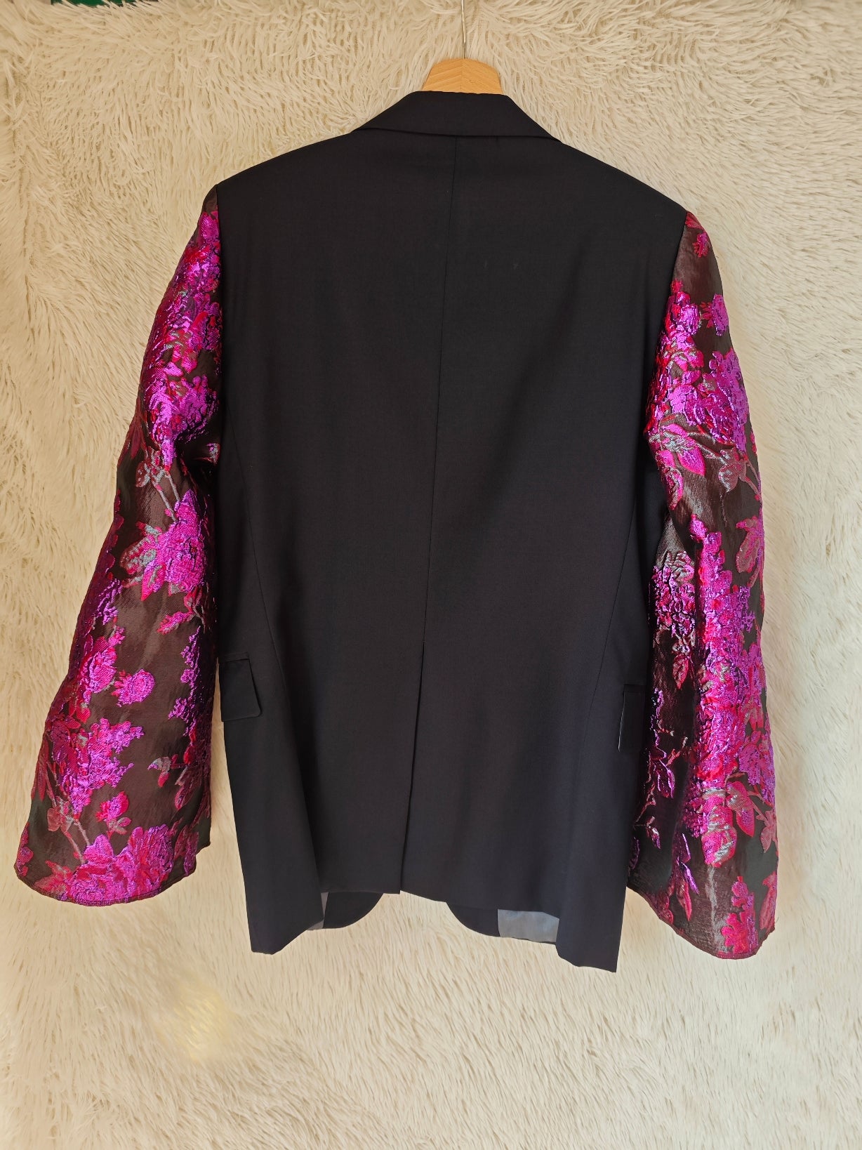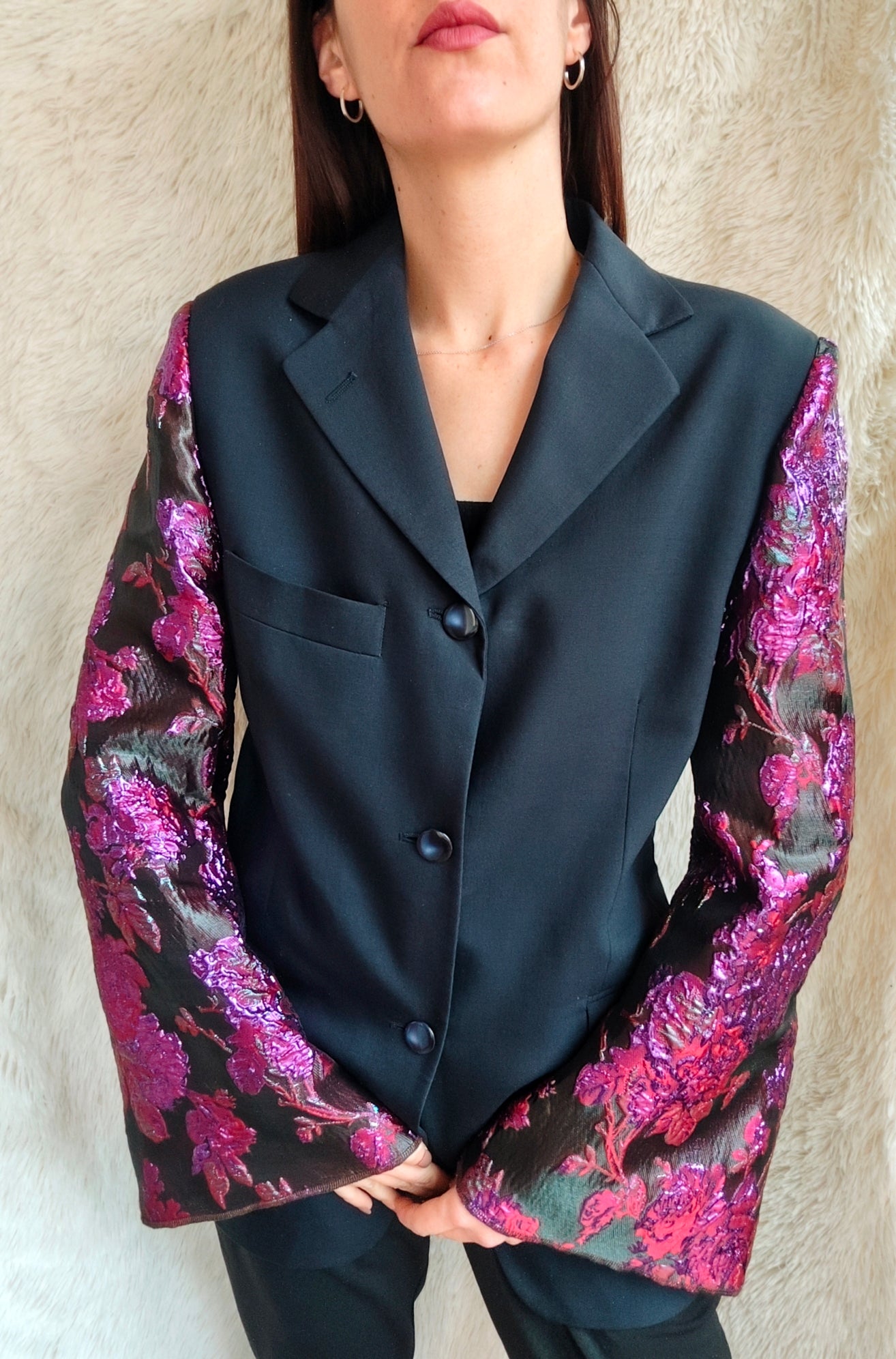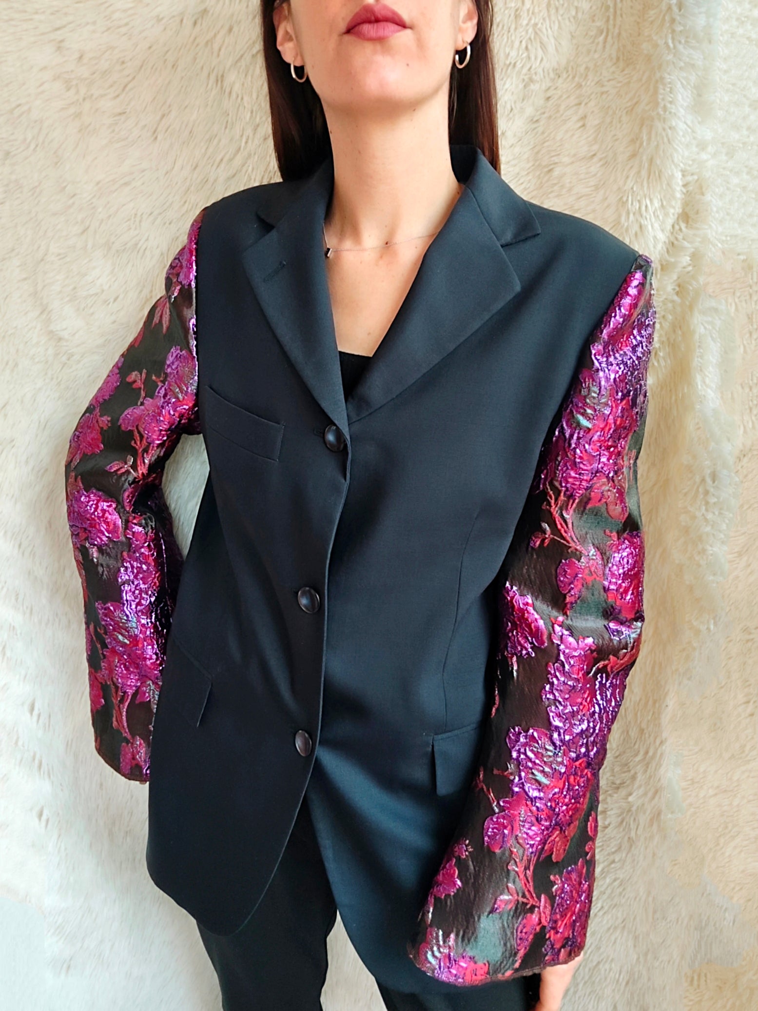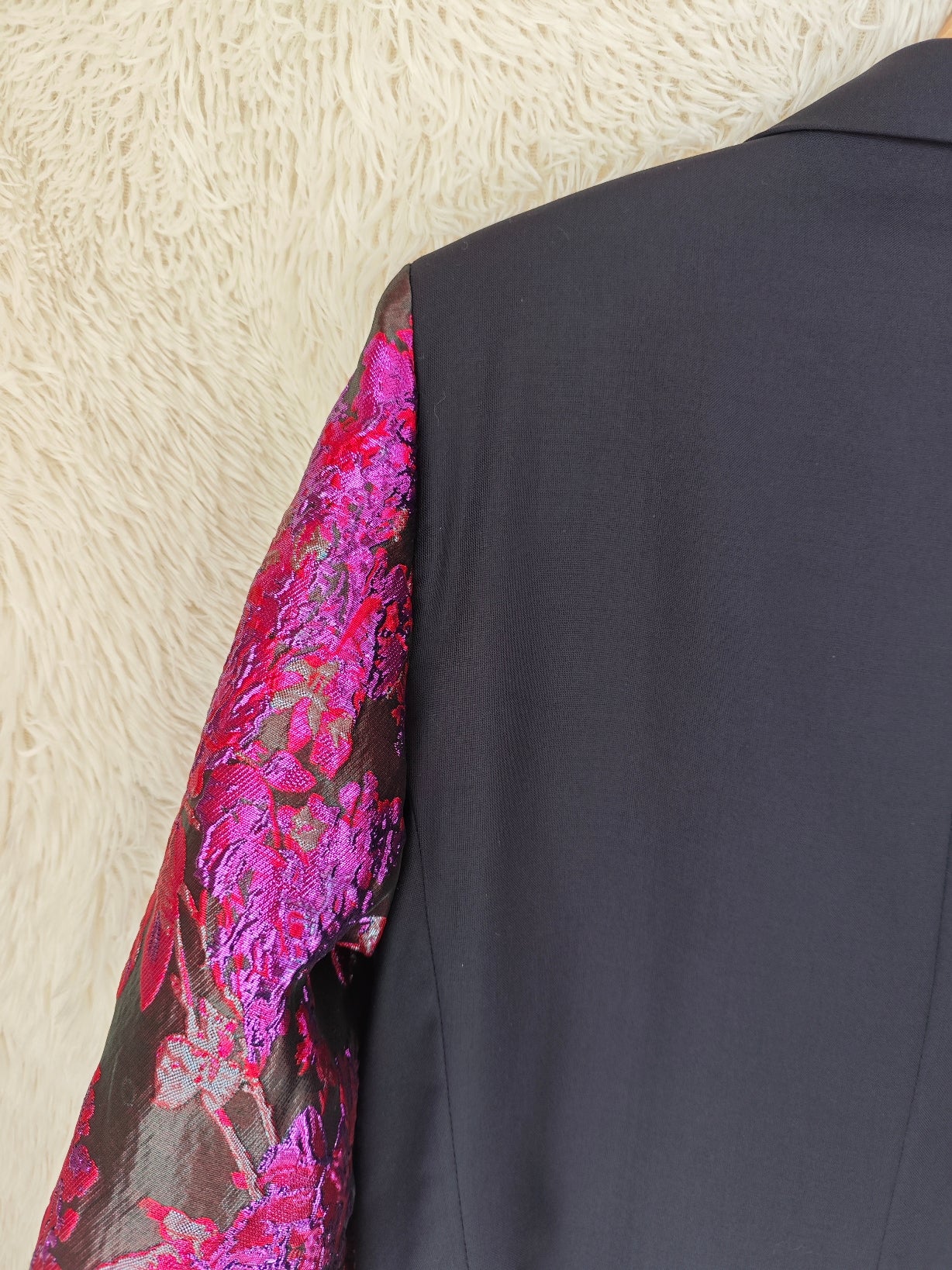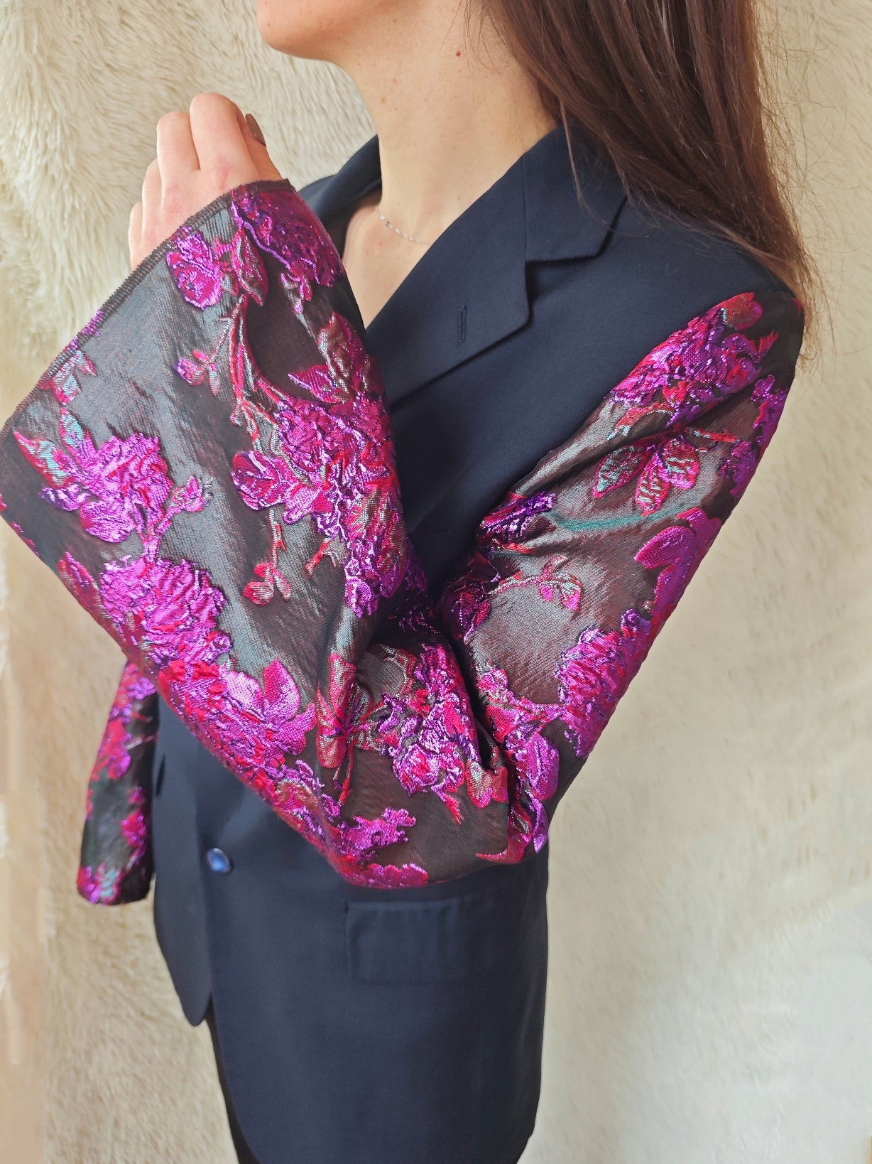 linea classica e strutturata, bottoni blu navy con riflessi maniche ampie e voluminose in tessuto floreale jacquard fucsia e viola a rilievo