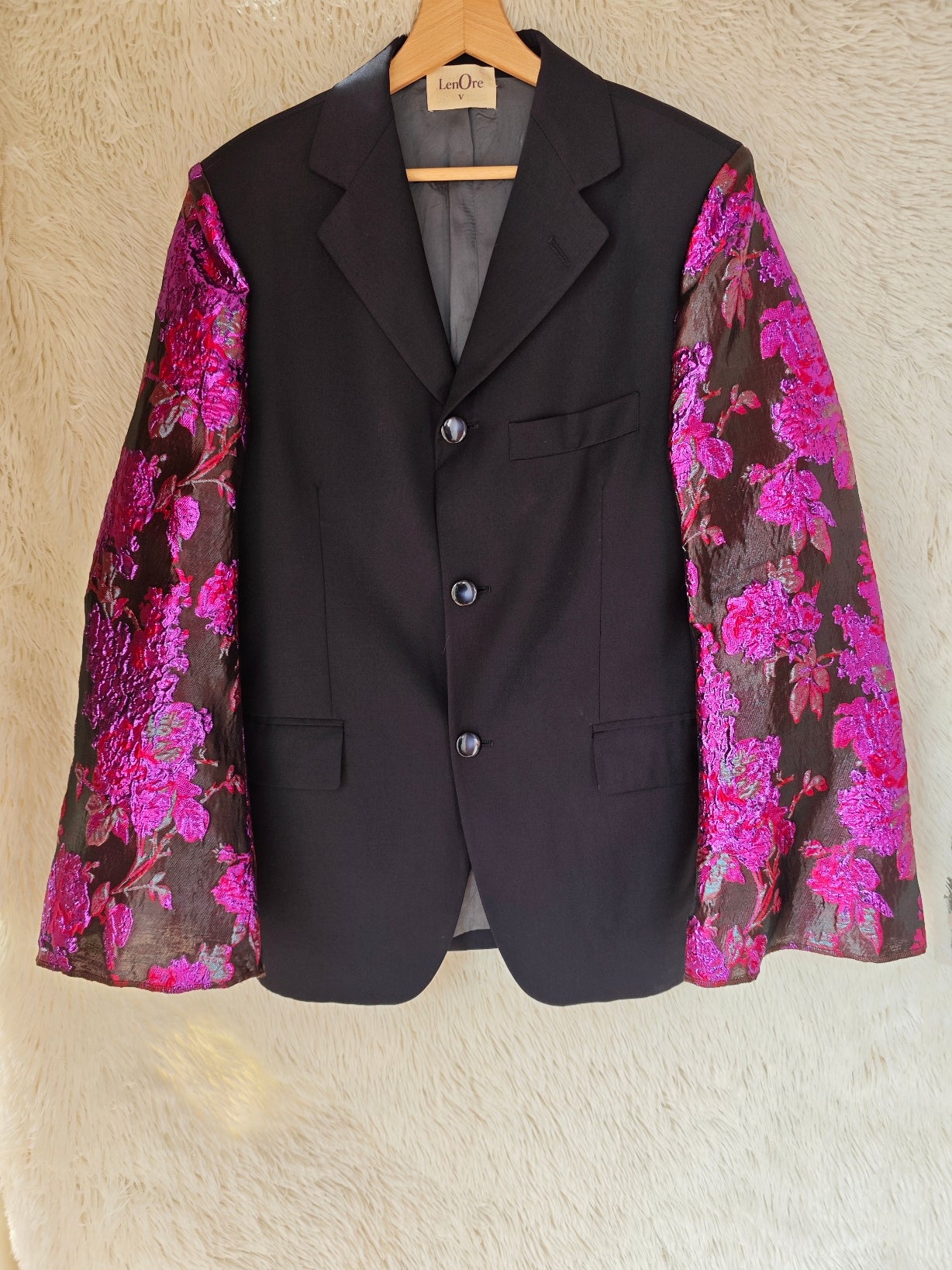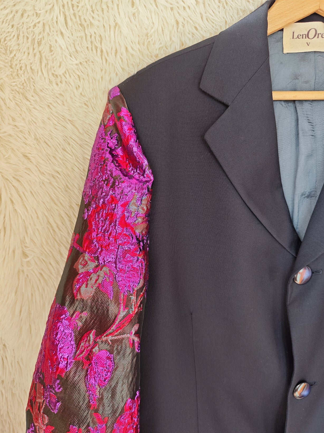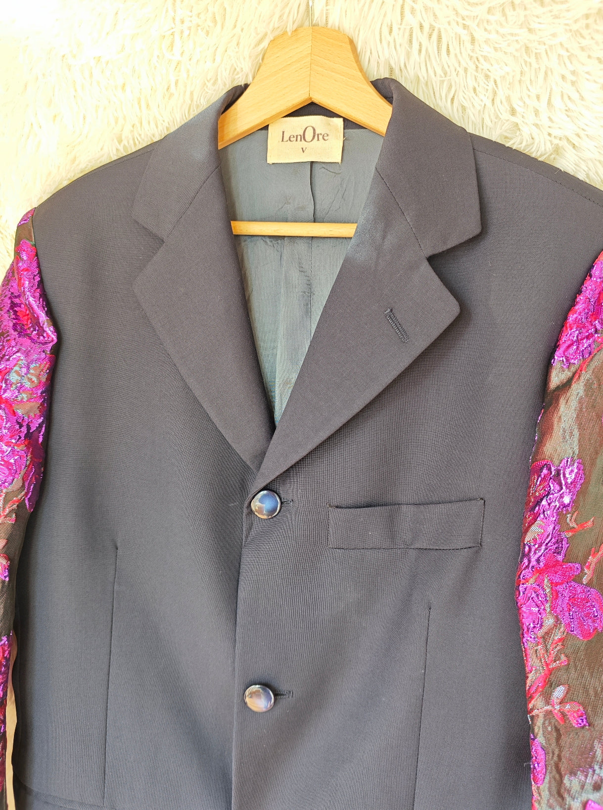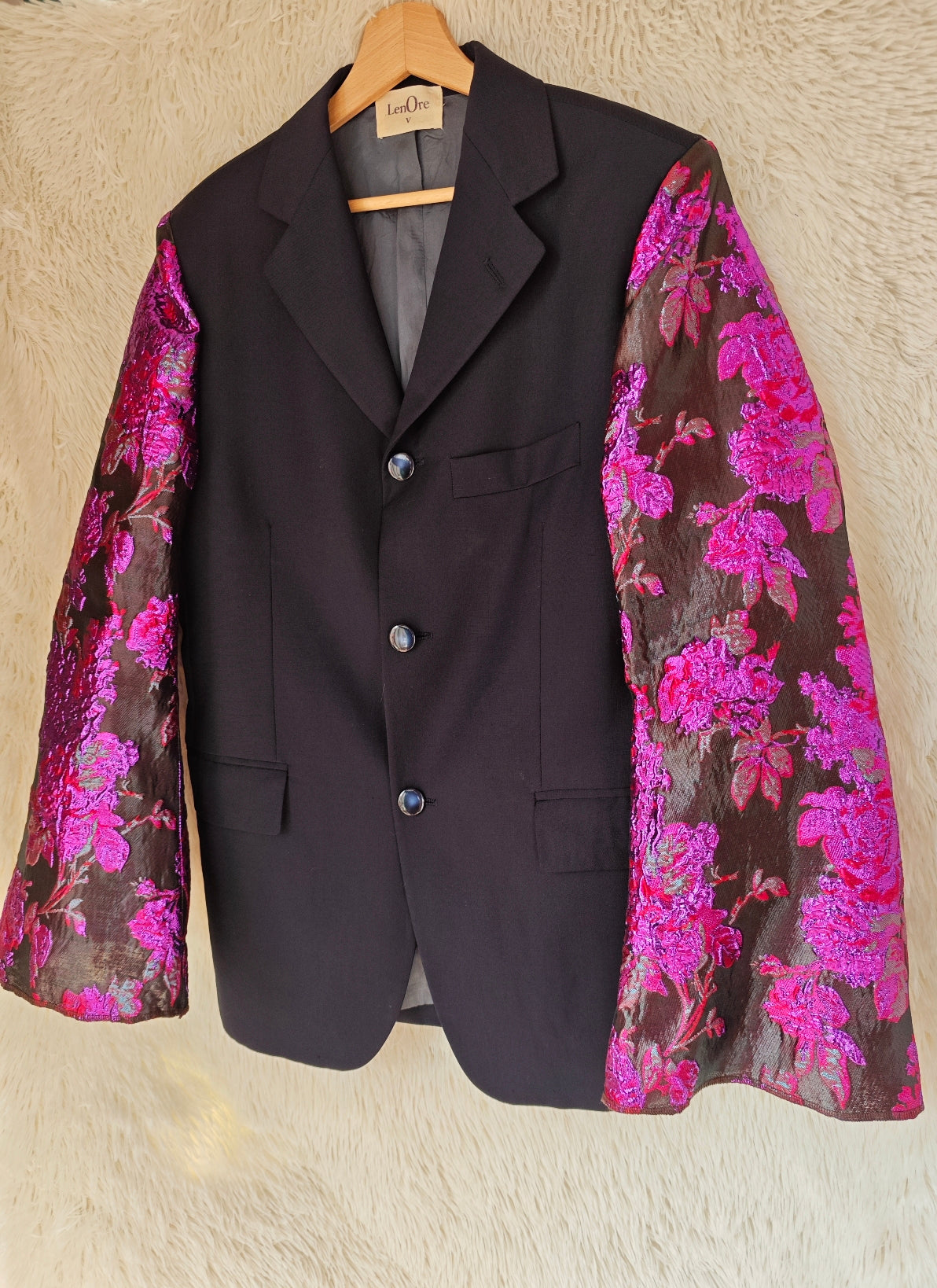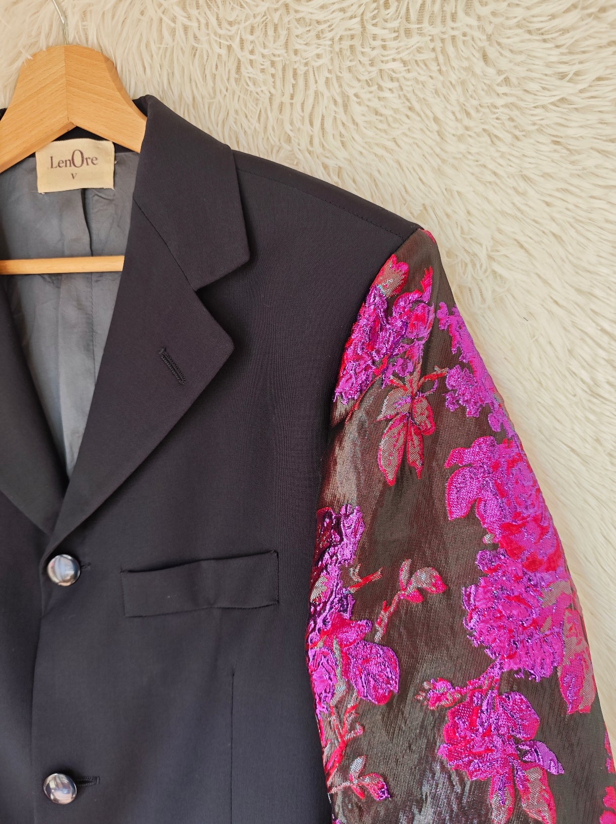 linea classica e strutturata, bottoni blu navy con riflessi maniche ampie e voluminose in tessuto floreale jacquard fucsia e viola a rilievo
