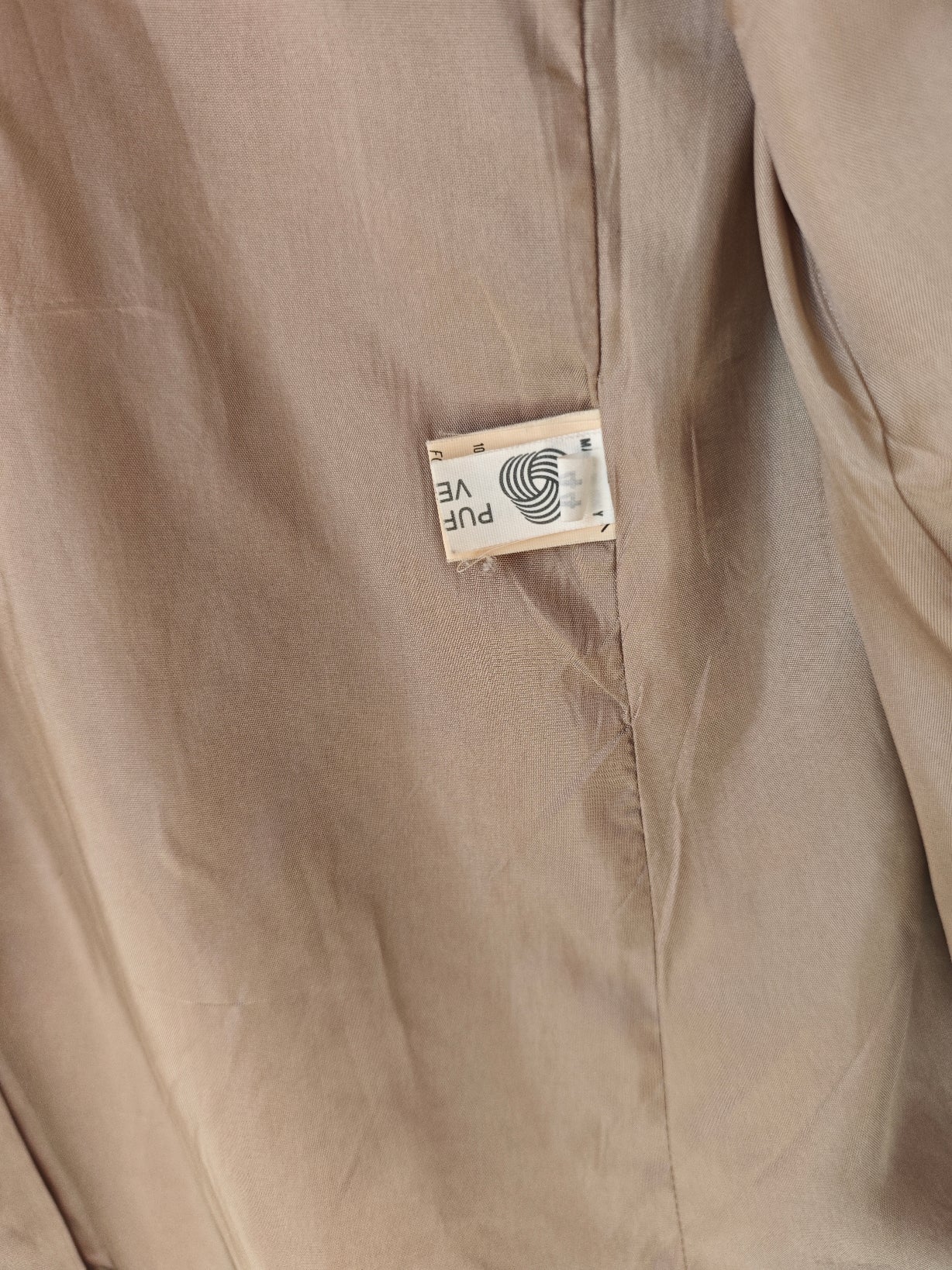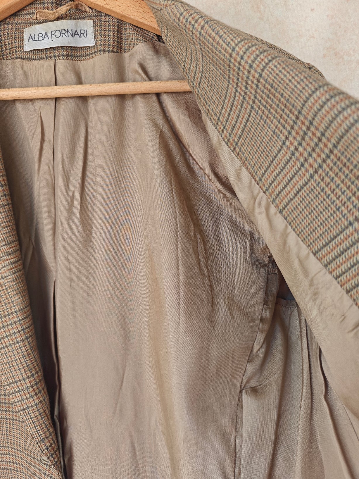 Blazer sartoriale firmato Alba Fornari, dal taglio elegante , linea dritta leggermente oversize con spalline. Realizzato in tessuto di lana con motivo check principe di Galles in colori neutri beige/marrone.
