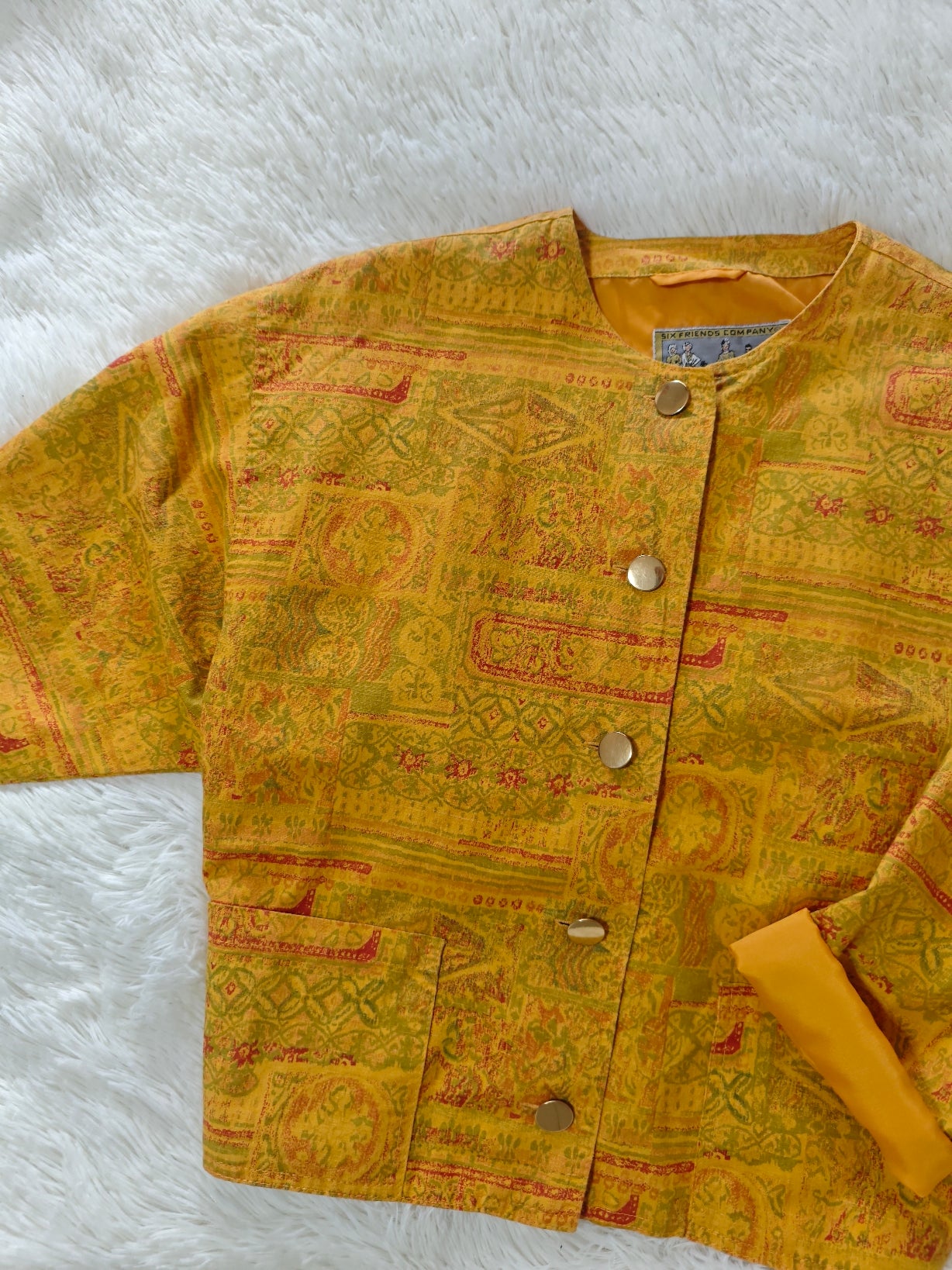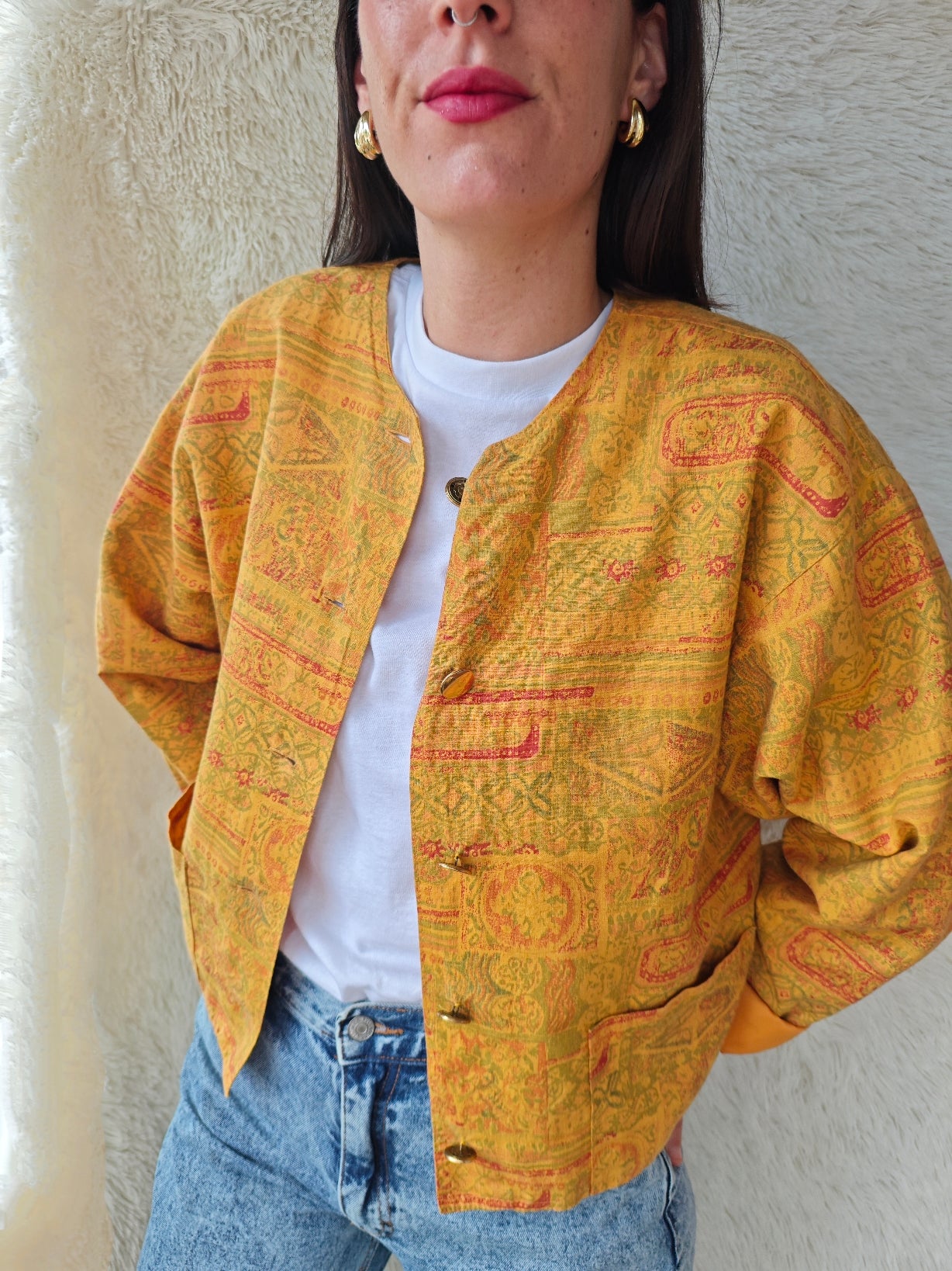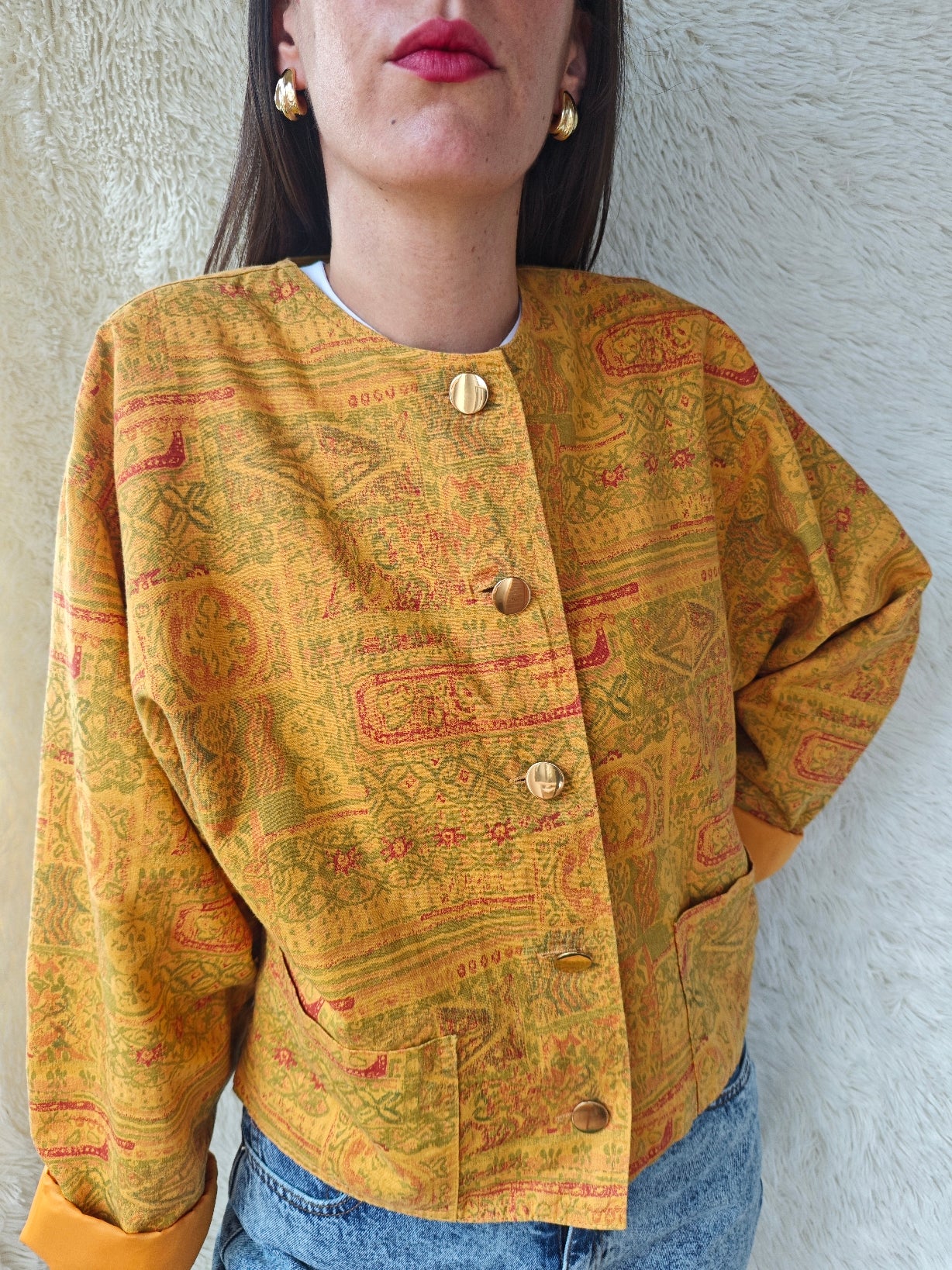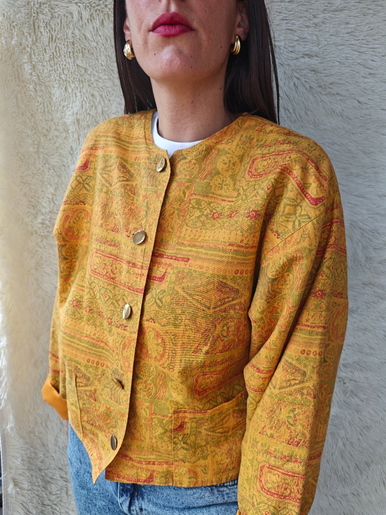 un vero pezzo da collezione, una giacca blazer leggera e versatile stile austriaco. Il capo si distingue per un'elegante e intricata fantasia geometrica nei toni del giallo senape, del verde oliva e con sottili dettagli rossi.