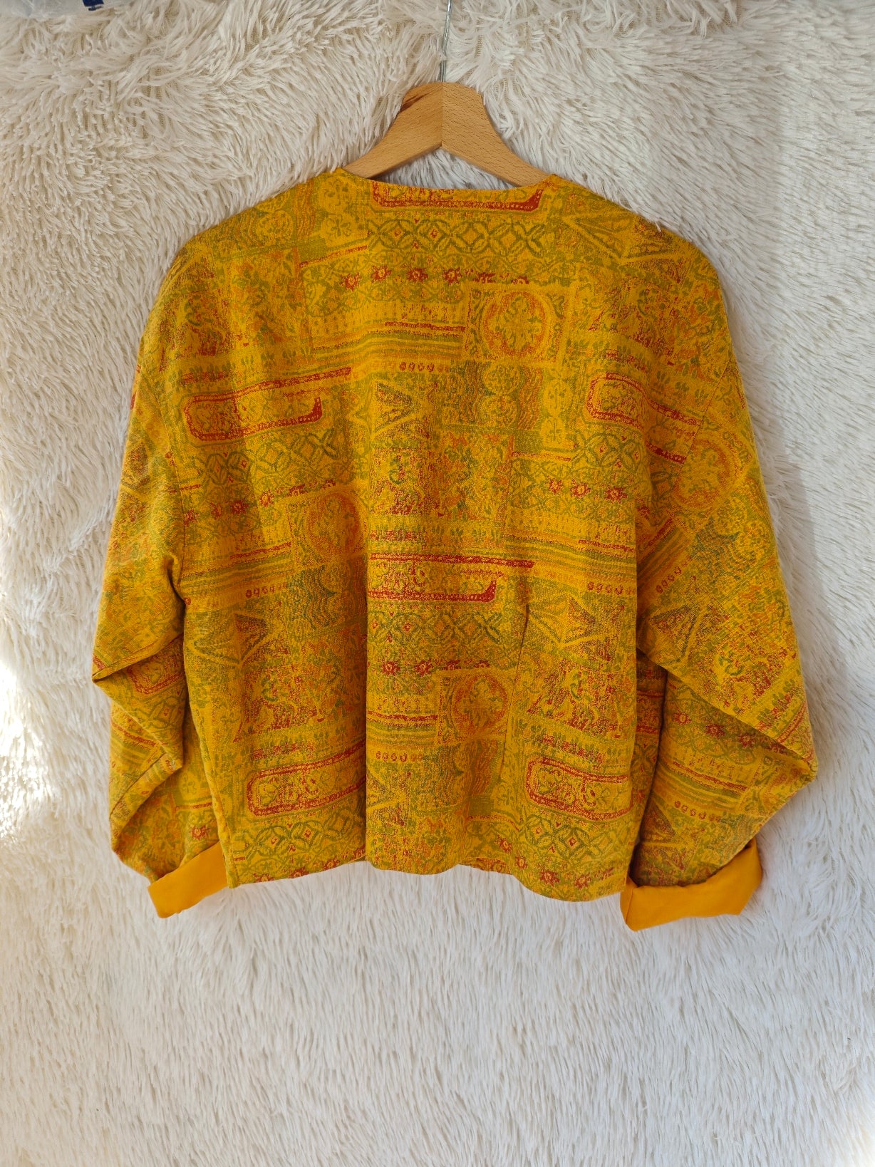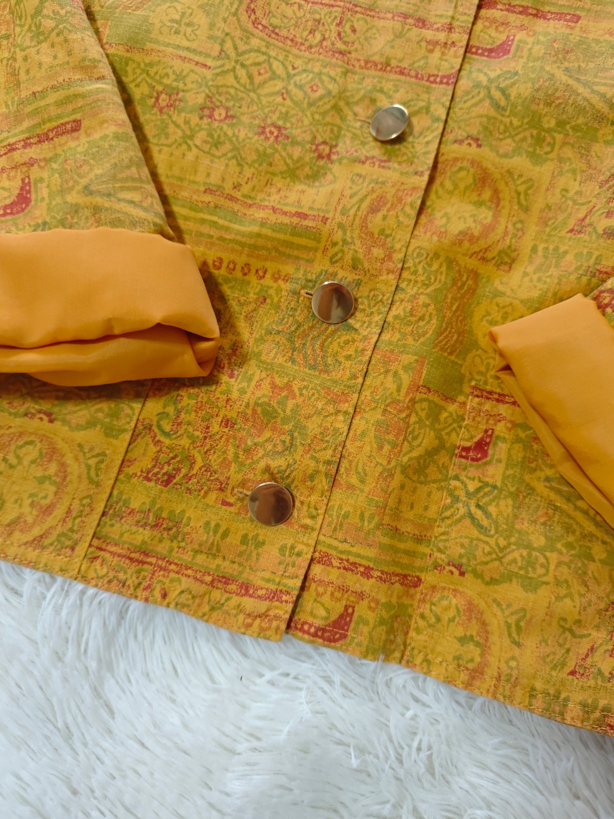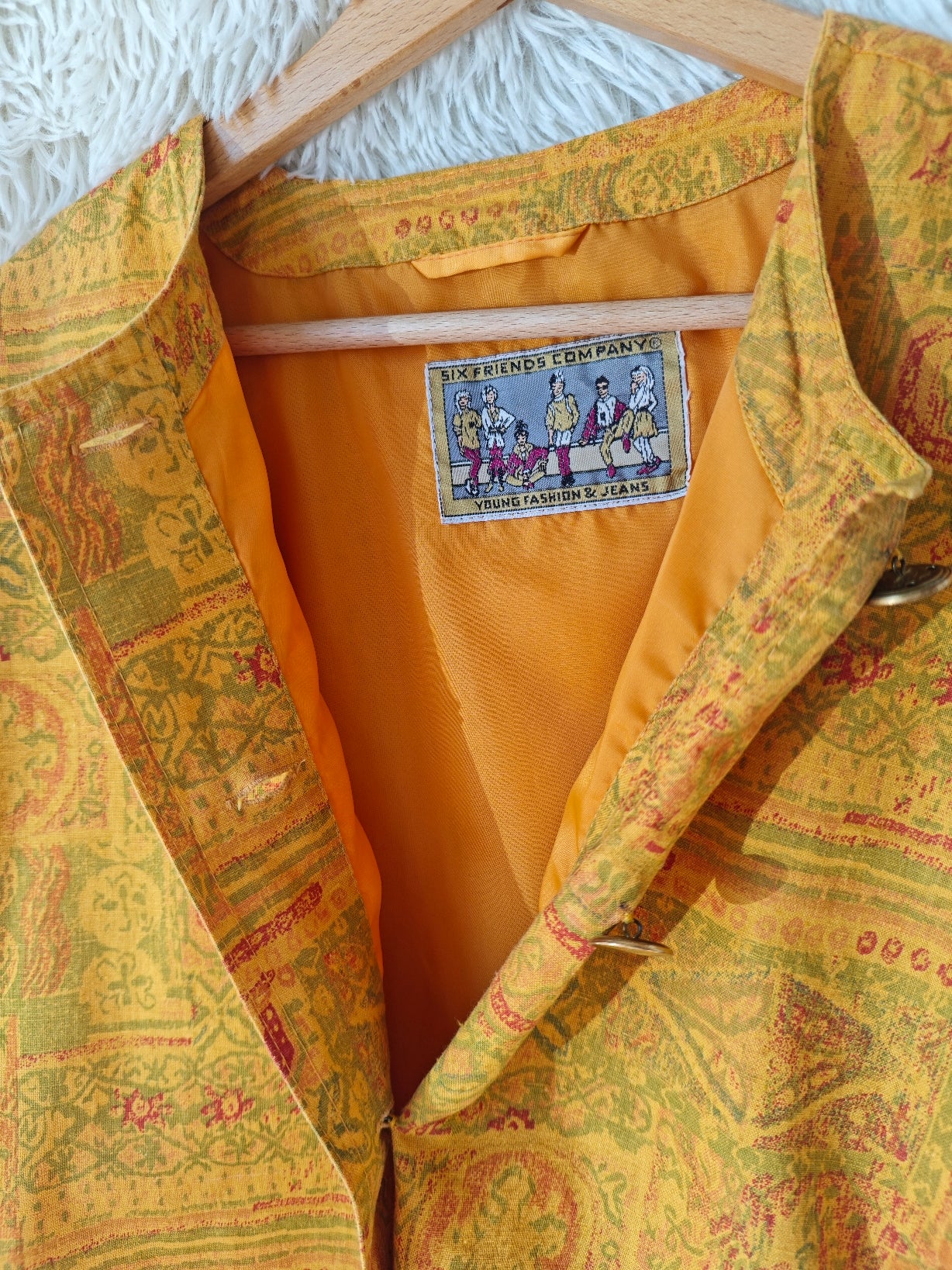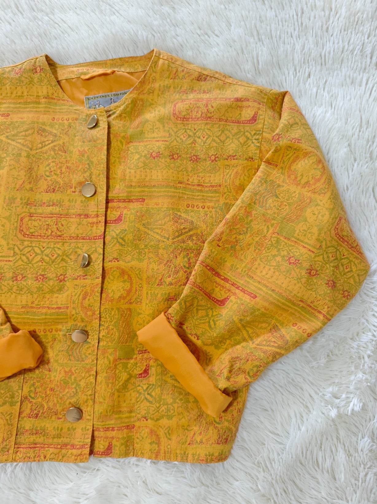 un vero pezzo da collezione, una giacca blazer leggera e versatile stile austriaco. Il capo si distingue per un'elegante e intricata fantasia geometrica nei toni del giallo senape, del verde oliva e con sottili dettagli rossi.