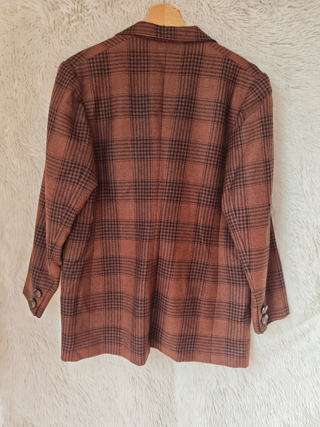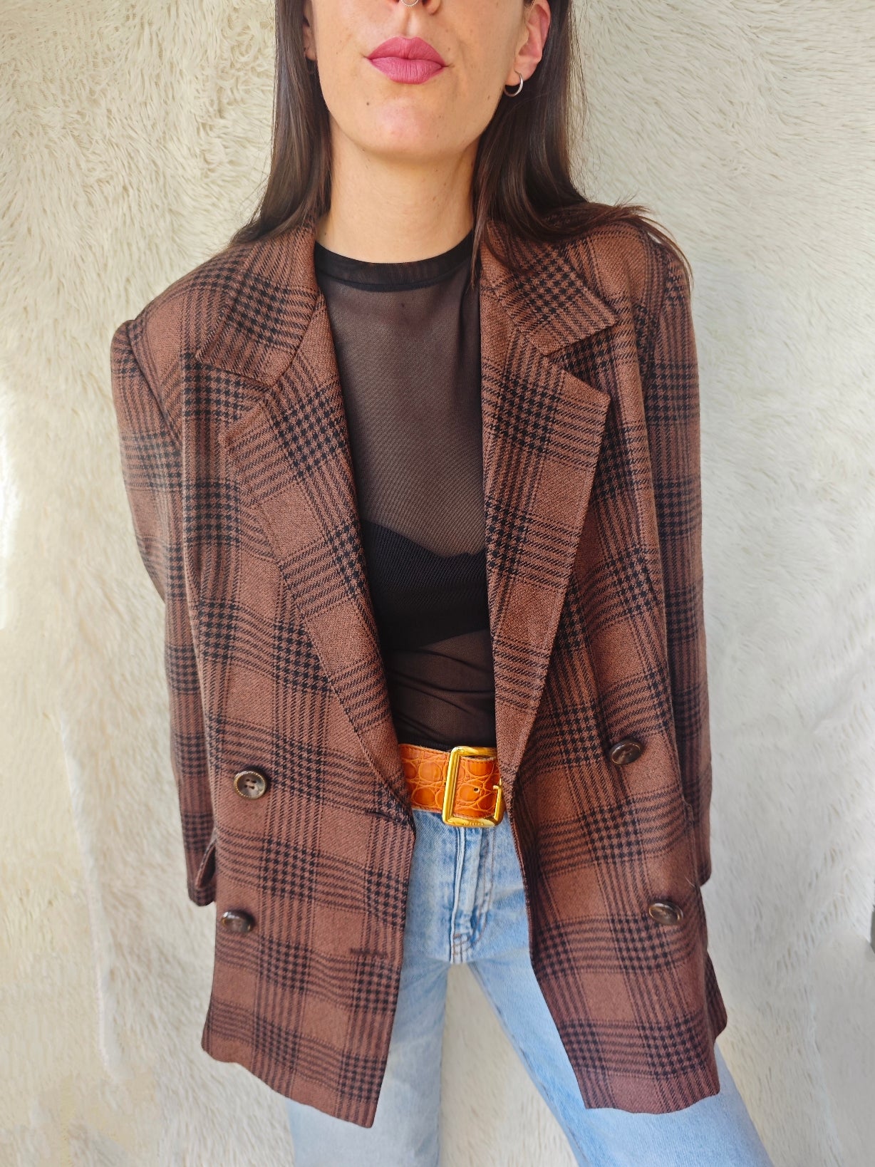 Blazer vintage in lana con fantasia a quadri nei toni del marrone e nero. Taglio maschile doppiopetto con revers classico e bottoni in tonalità coordinata. Linea leggermente oversize e tessuto caldo