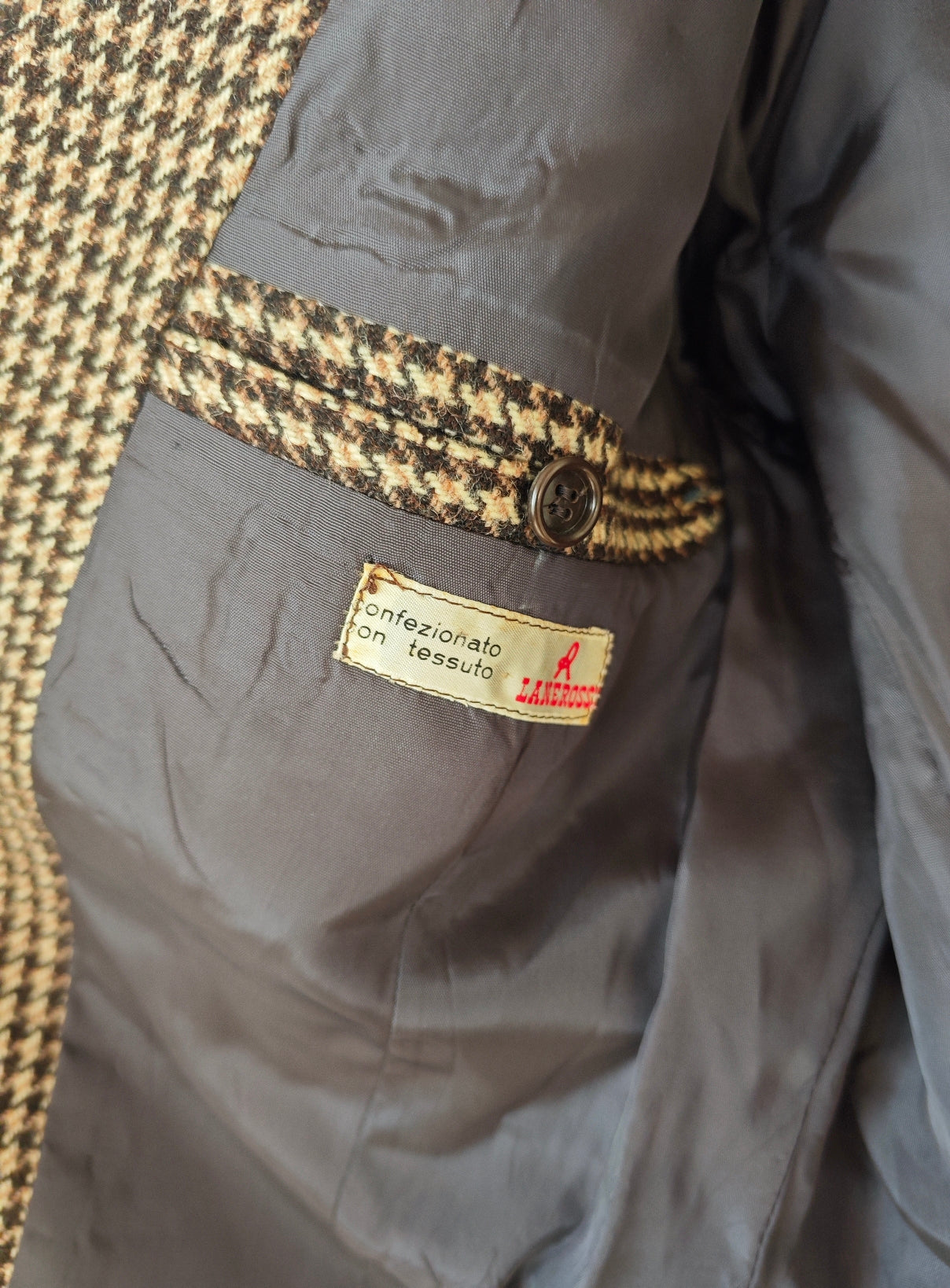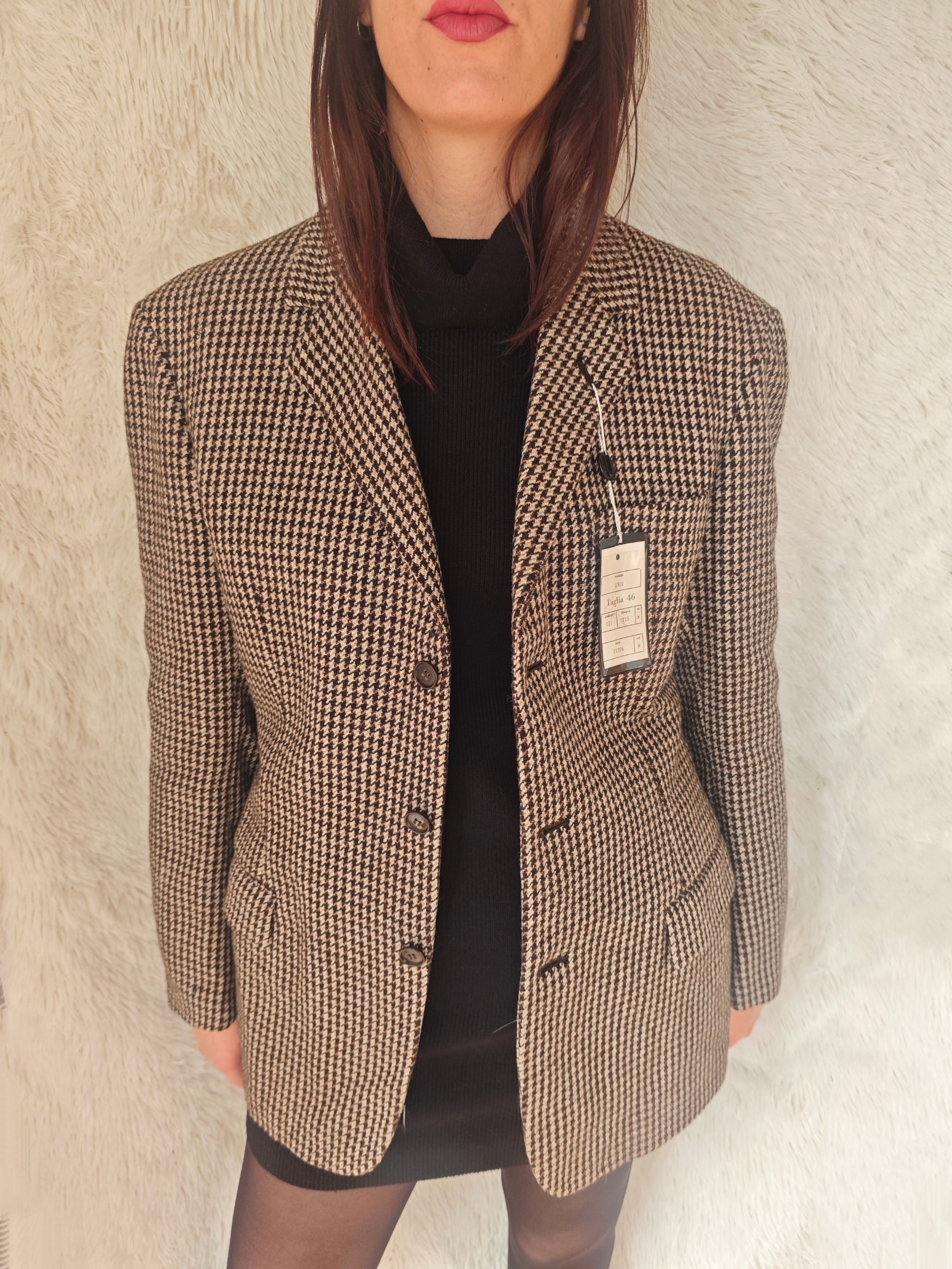blazer vintage realizzato in pura lana con fantasia pied de poule nei toni del marrone e nero. Capo nuovo con etichette originali, proveniente da rimanenza di magazzino (deadstock).