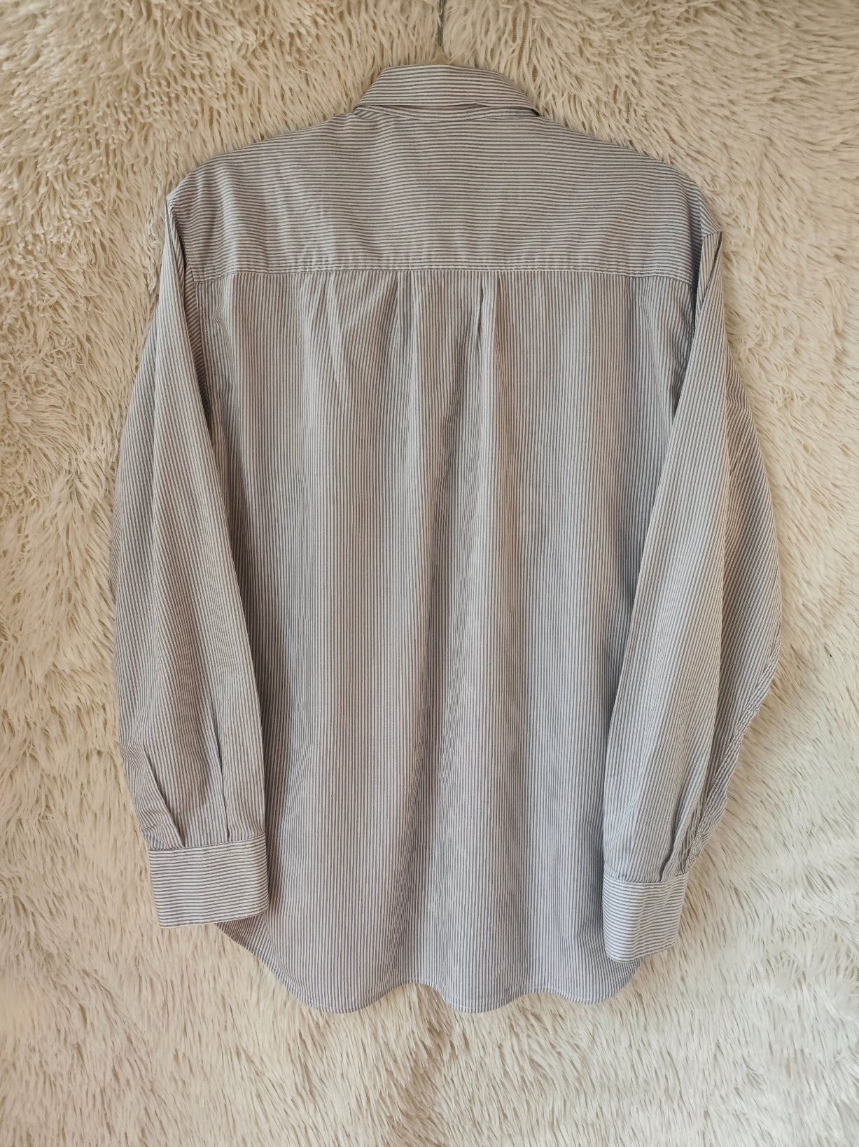 Camicia in cotone della collezione Segreta di Emmanuel schvili con raffinata fantasia a righe sottili grigio e bianco e doppi ricami frontali dei cuccioli dei 101 Dalmatians.