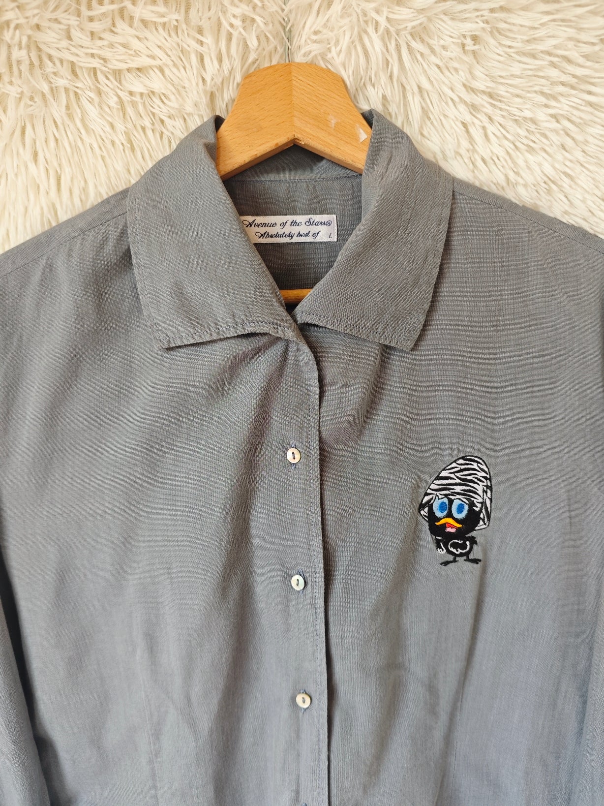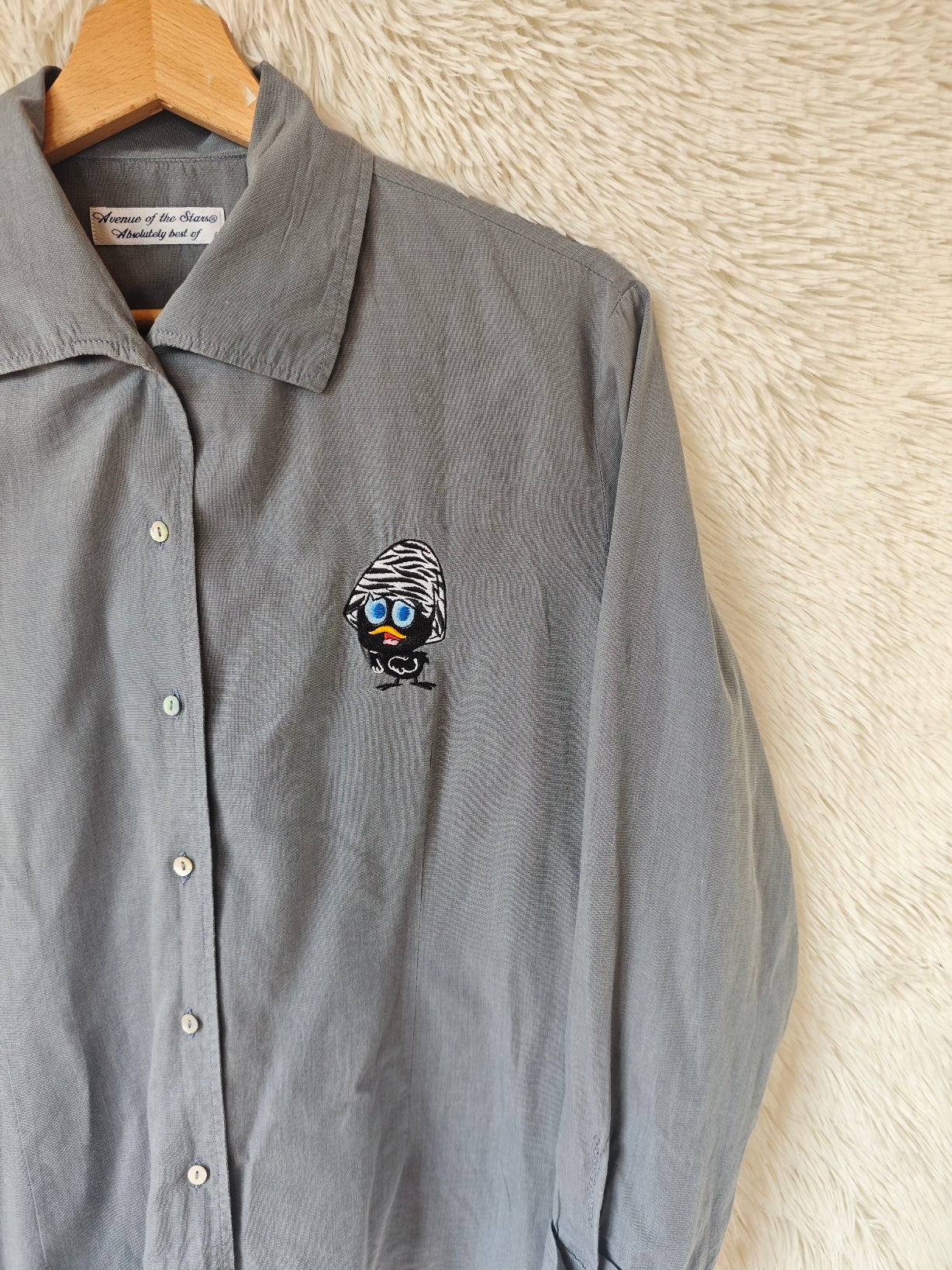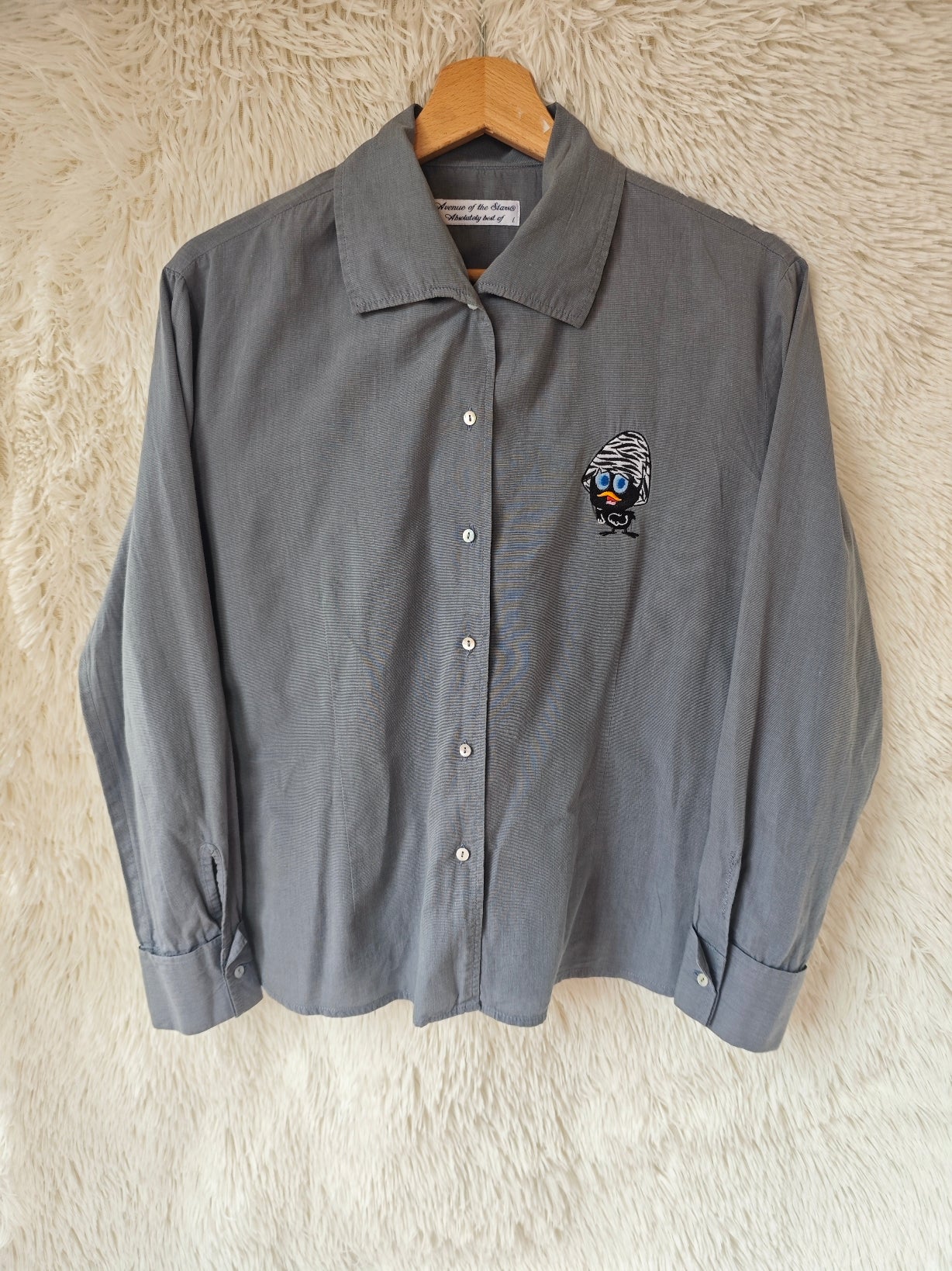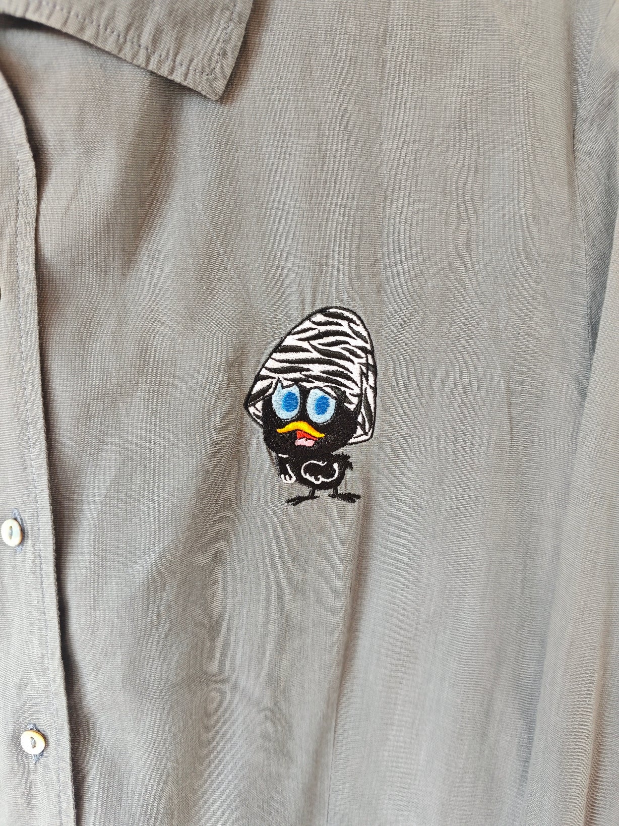 Camicia leggera in cotone colore grigio, con ricamo frontale di Calimero. Modello leggermente sfiancato, linea femminile.