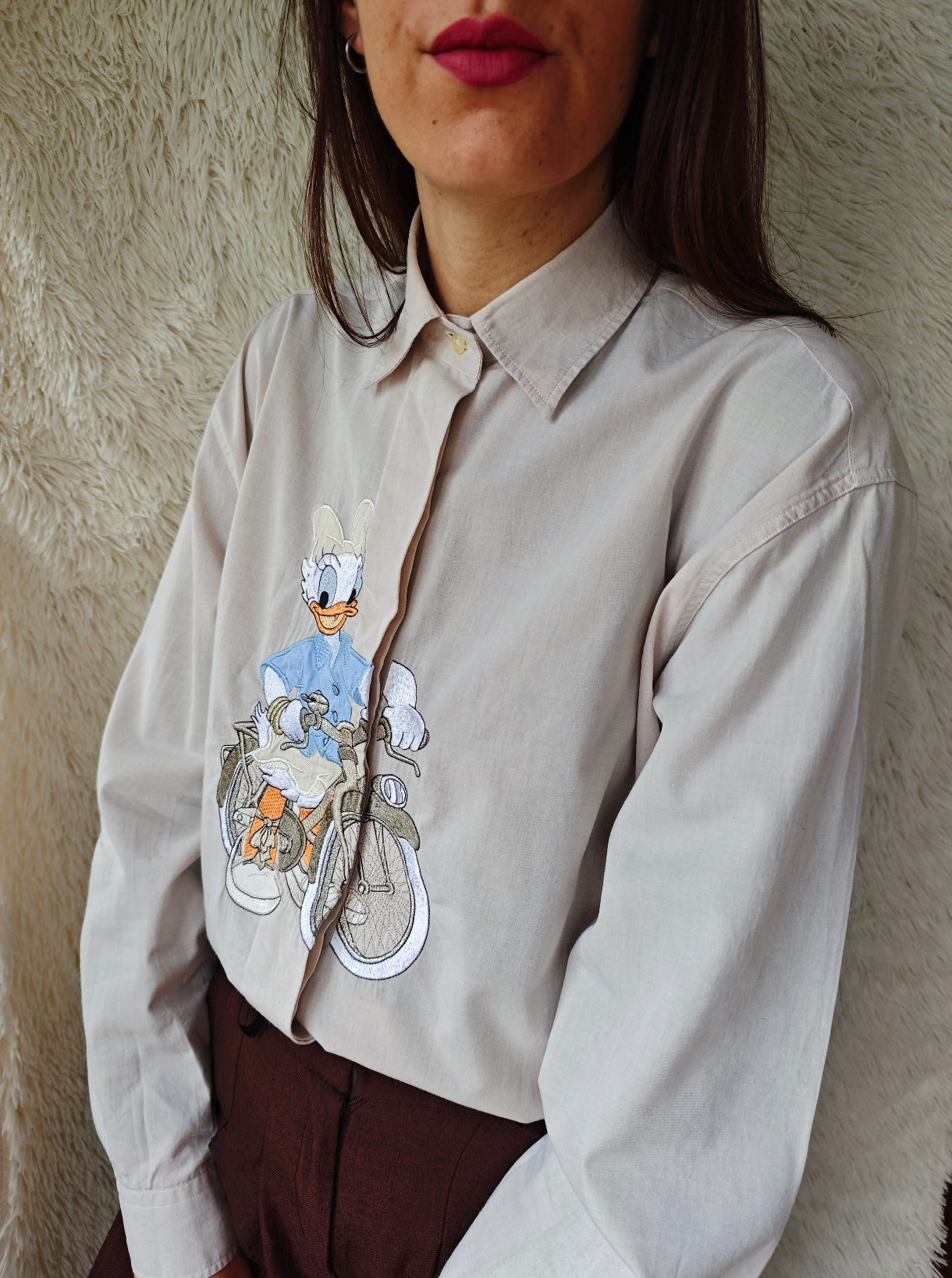 Sul davanti presenta un ricamo di Paperina in bicicletta