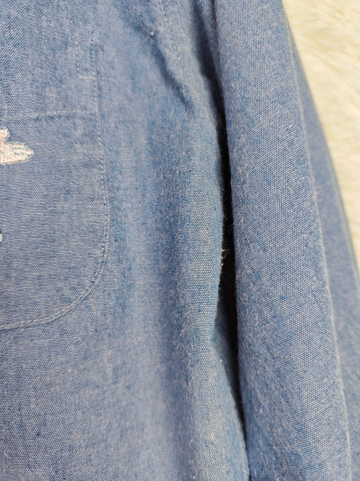 Camicia vintage in denim azzurro chiaro del brand Donaldson, vestibilità morbida, con ricamo frontale di Mickey Mouse sulla tasca e maxi ricamo scenografico sul retro con Mickey e Donald Duck in versione marinaro.