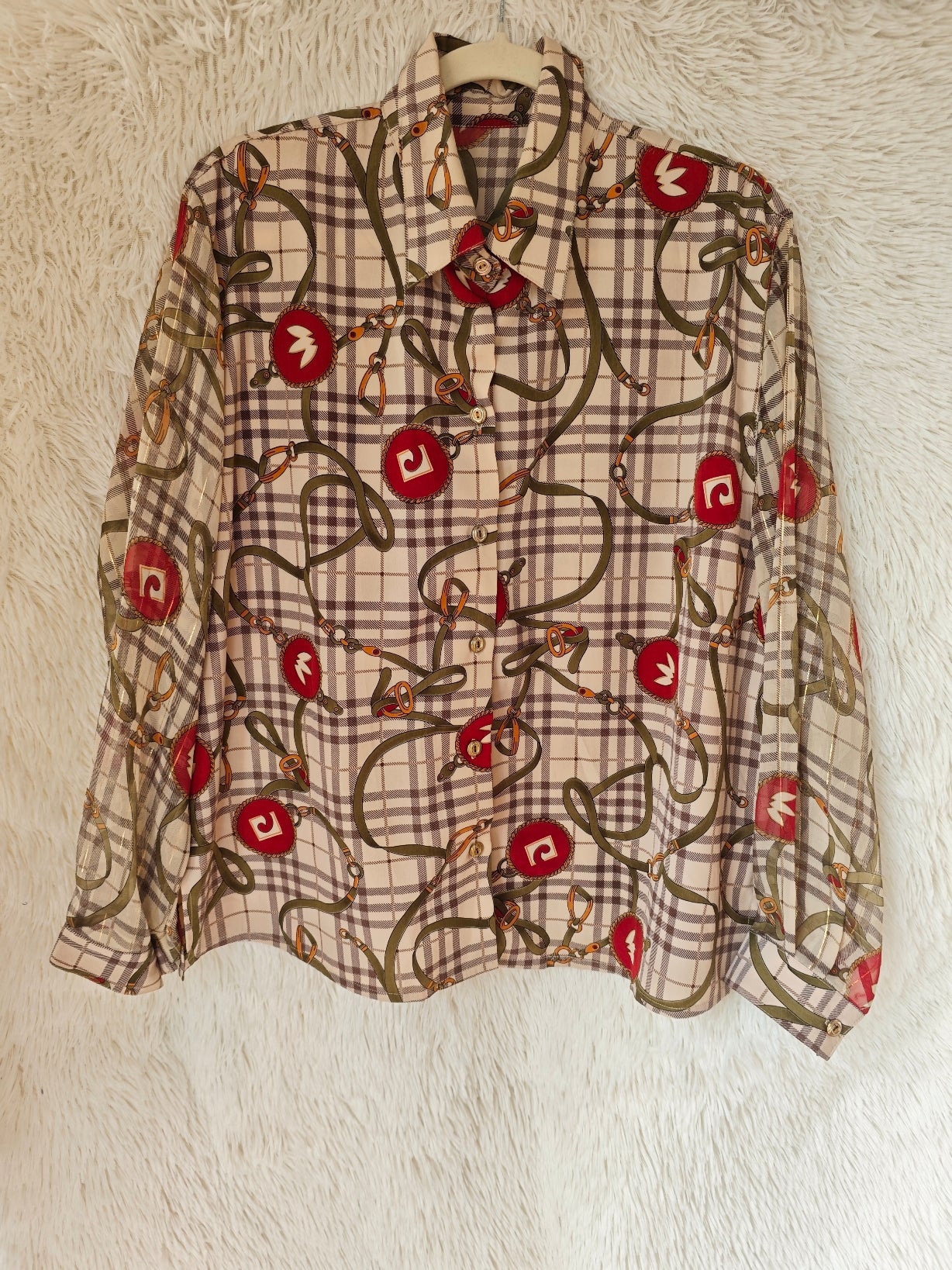 Camicia a maniche lunghe inspirata ai classici foulard, fantasia iconica di Cinture e Fibbie su uno sfondo a Quadri nei toni caldi del beige, marrone e verde oliva.