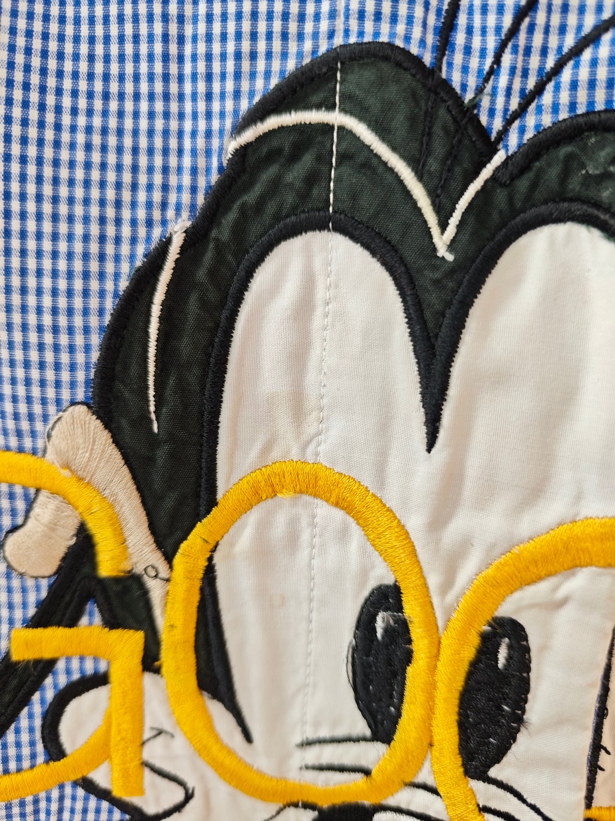 Camicia in cotone con fantasia vichy blu e bianco, della collezione Segreta di Emmanuel schvili impreziosita da maxi ricamo centrale di Goofy con lettering giallo.