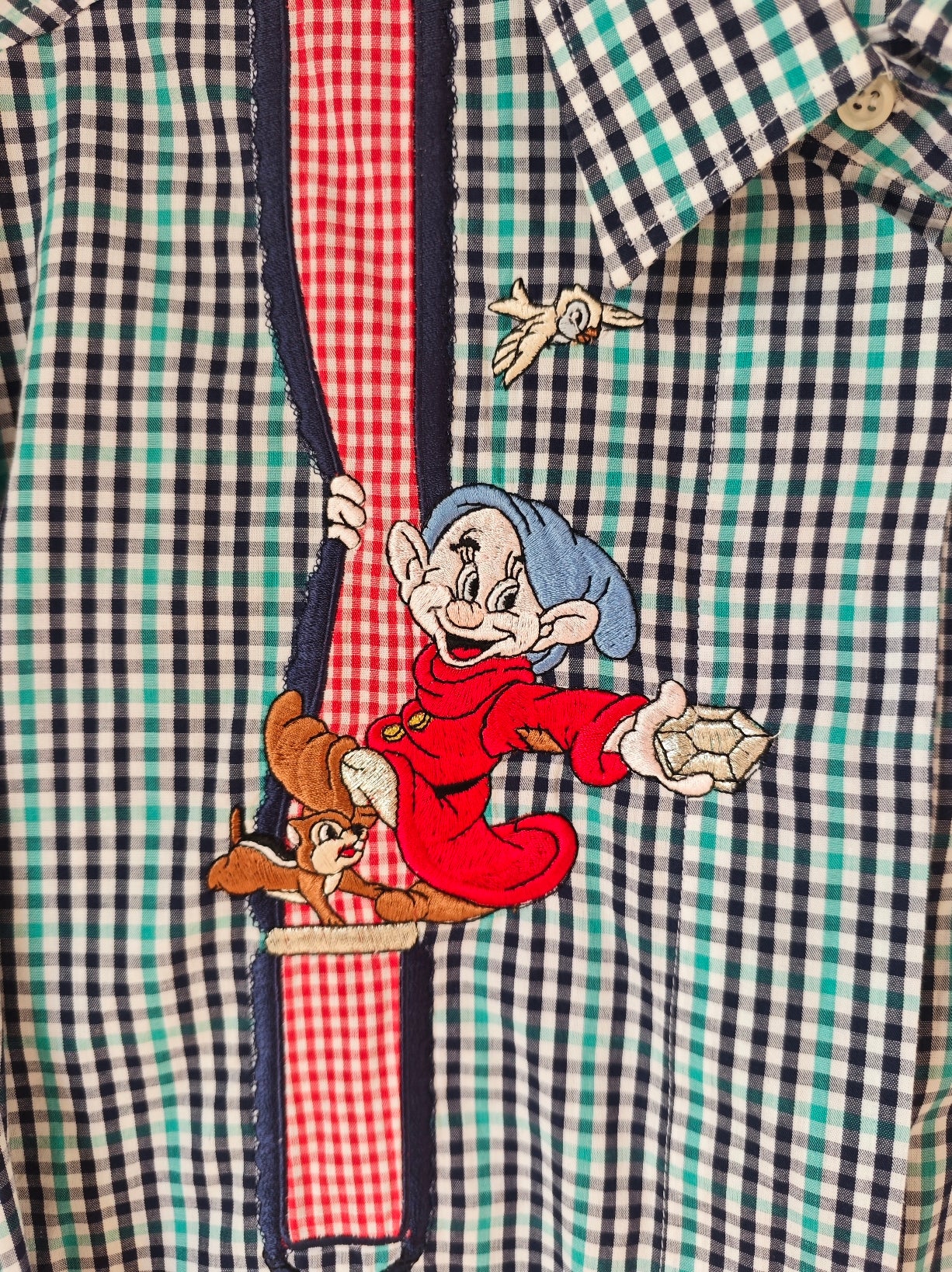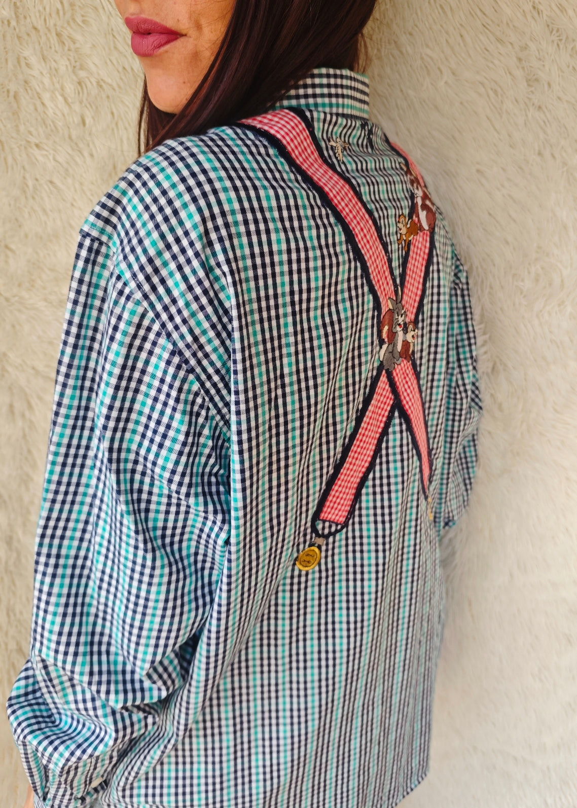 Sul fronte spiccano due nani ricamati con cura, appoggiati a un paio di bretelle decorative in tessuto quadrettato rosso e blu. Le bretelle proseguono anche sul retro, creando un effetto unico e super scenografico