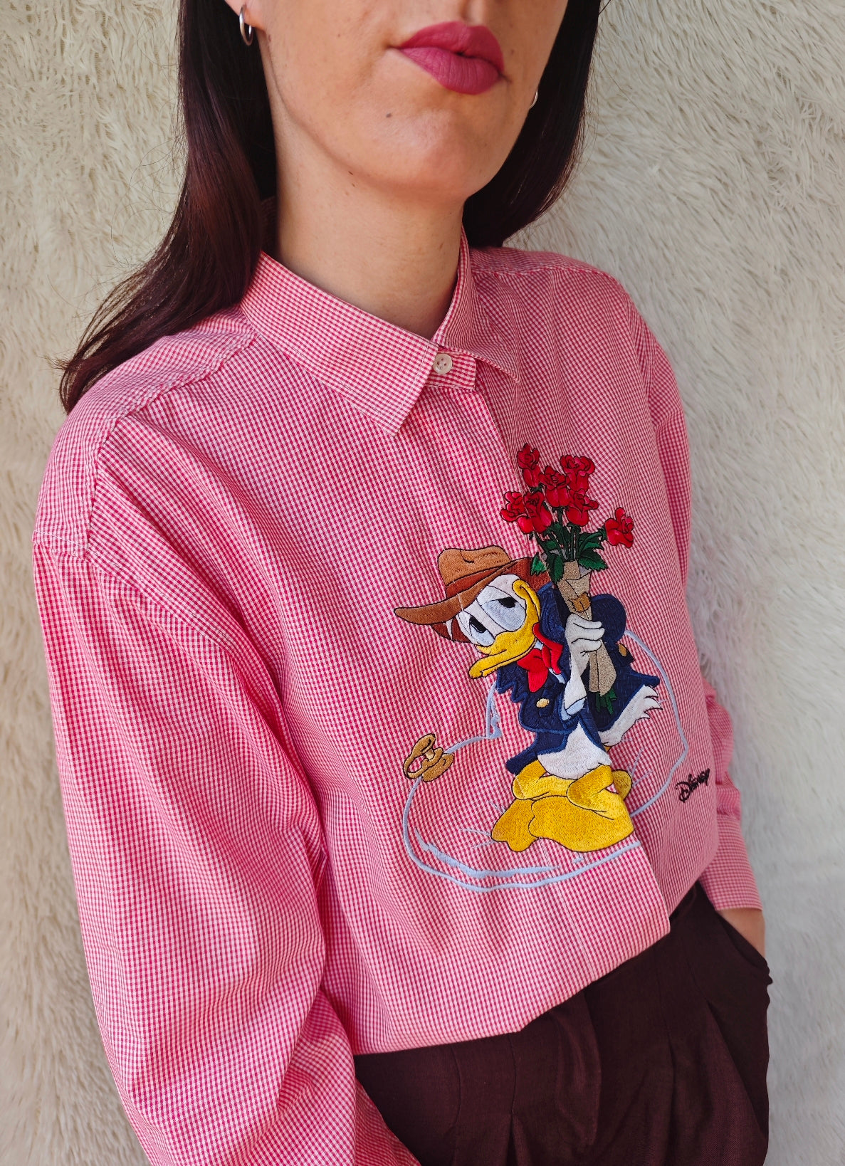 Camicia in puro cotone dal taglio classico a quadretti rossi e bianchi, grande e dettagliata ricamo frontale di Paperino mentre tiene in mano un mazzo di rose rosse.