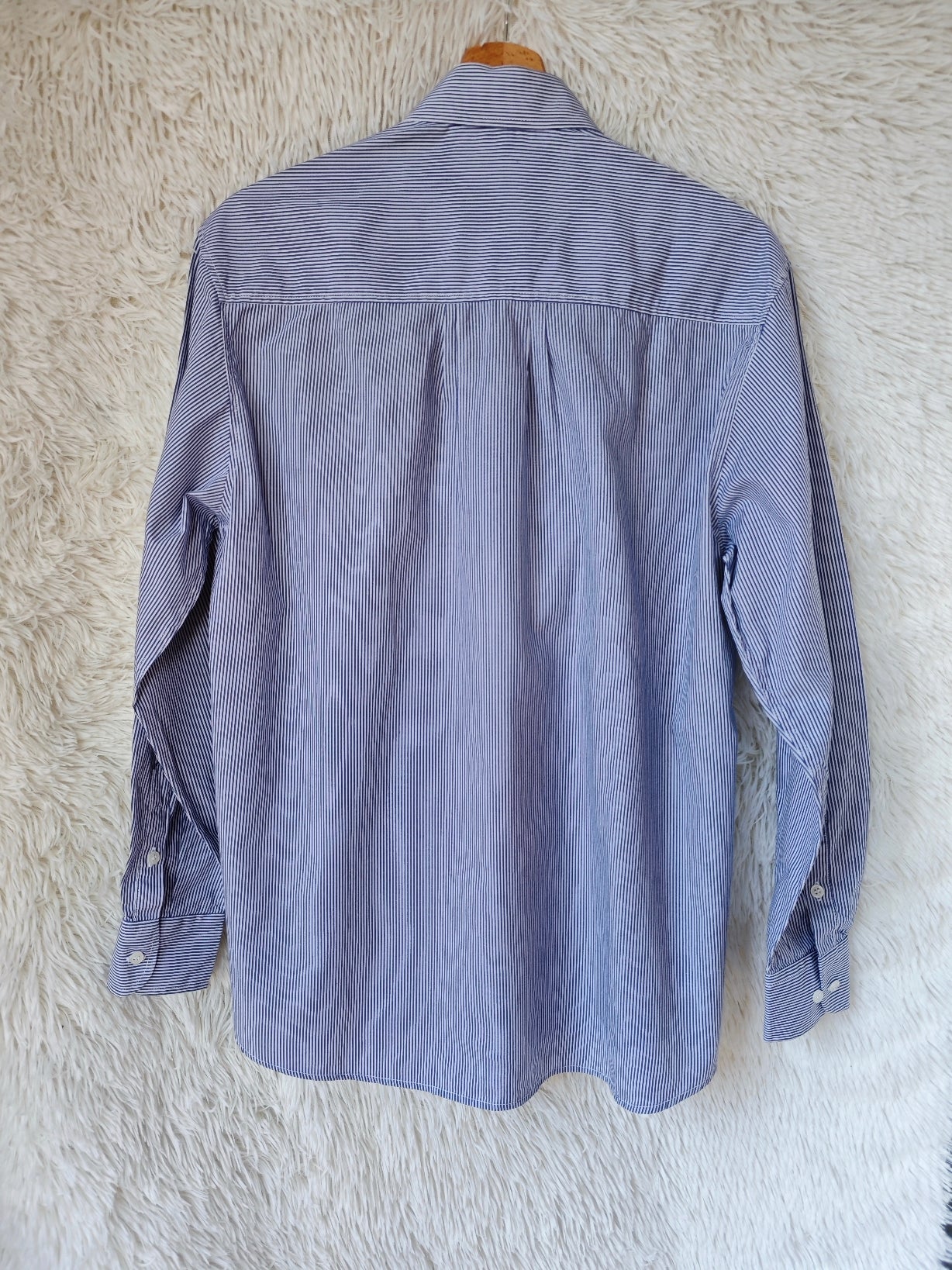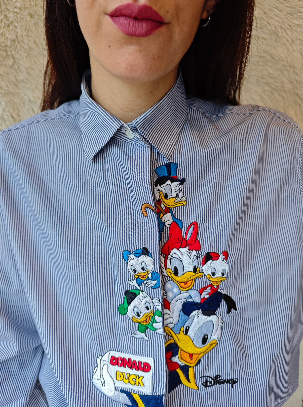 Camicia vintage della collezione Segreta di Emanuele Schvili. Fantasia a righe verticali blu e bianche sul davanti ricamato paperino insieme a tutta la famiglia.