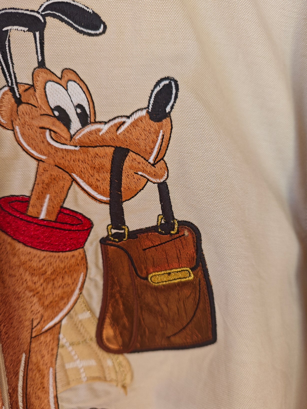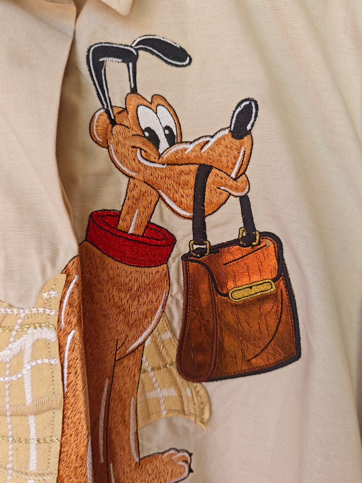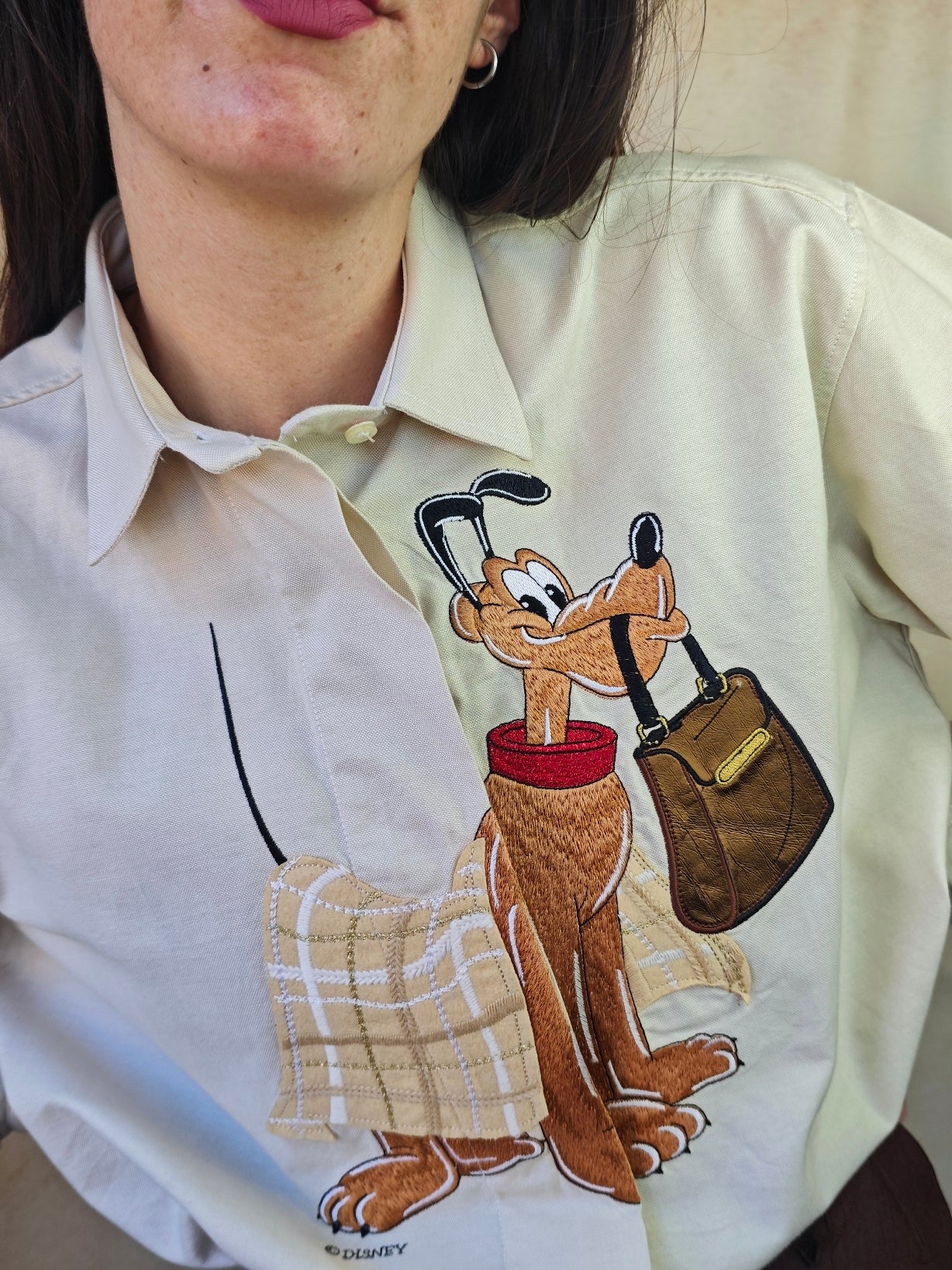 Il modello presenta linea morbida, colletto classico e bottoni nascosti. Sul davanti spicca un raffinato ricamo Disney di Pluto con dettagli a rilievo , borsa vintage e copertina a quadri nelle tonalità di marrone .
