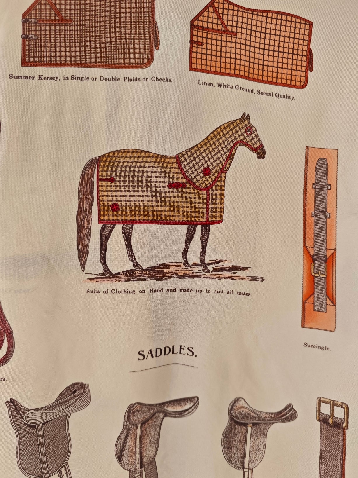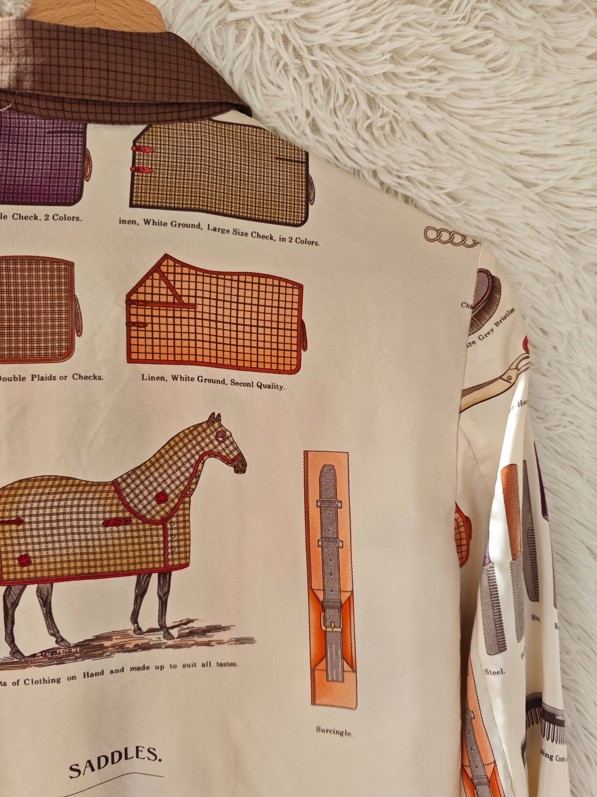 camicia in pura seta dal taglio classico, caratterizzata da una stampa illustrata ispirata al mondo dell’equitazione e degli accessori vintage. fondo color crema e motivi decorativi nei toni del marrone, rosso e oro. Il colletto, i polsini e la chiusura frontale presentano contrasto a quadretti marroni.