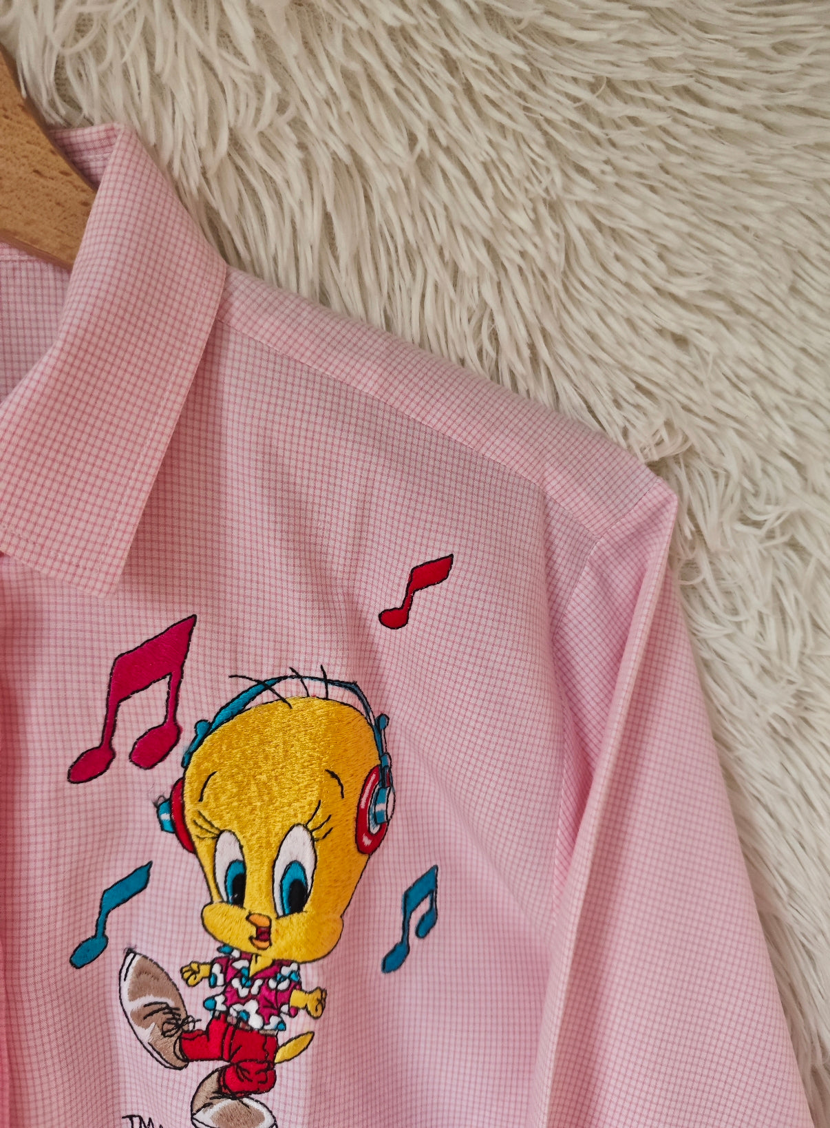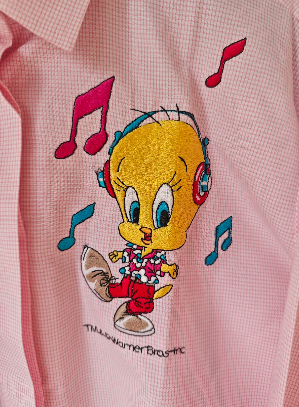 Camicia a motivo Vichy rosa con ricami colorati dei personaggi Silvestro e Titti dei Looney Tunes. I due in una versione giocosa, entrambi con camicie hawaiane dai colori vivaci, circondati da note musicali.