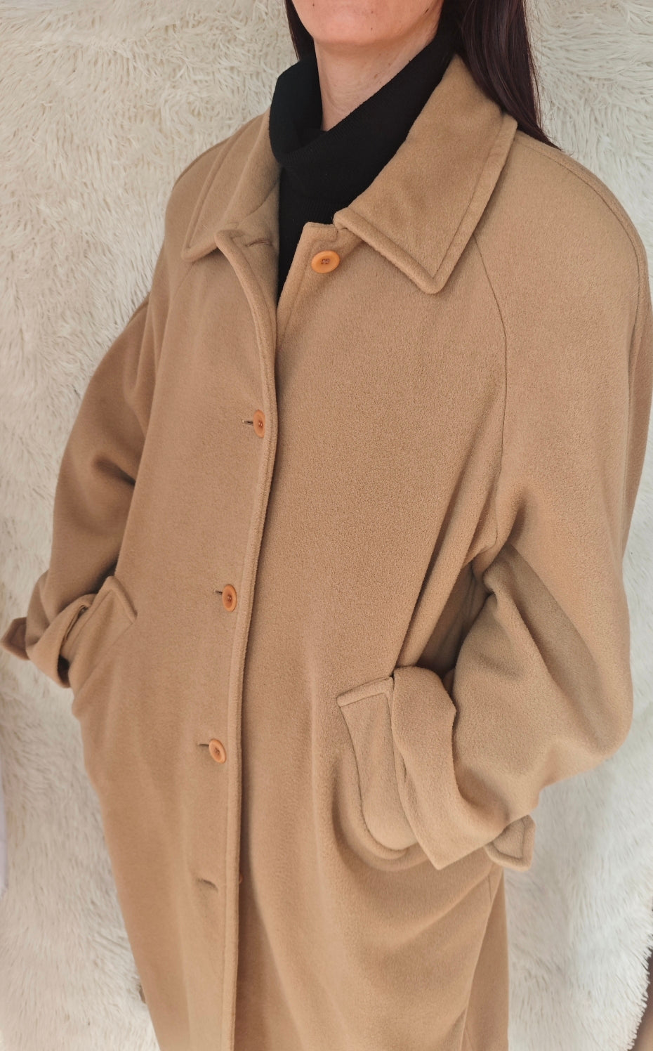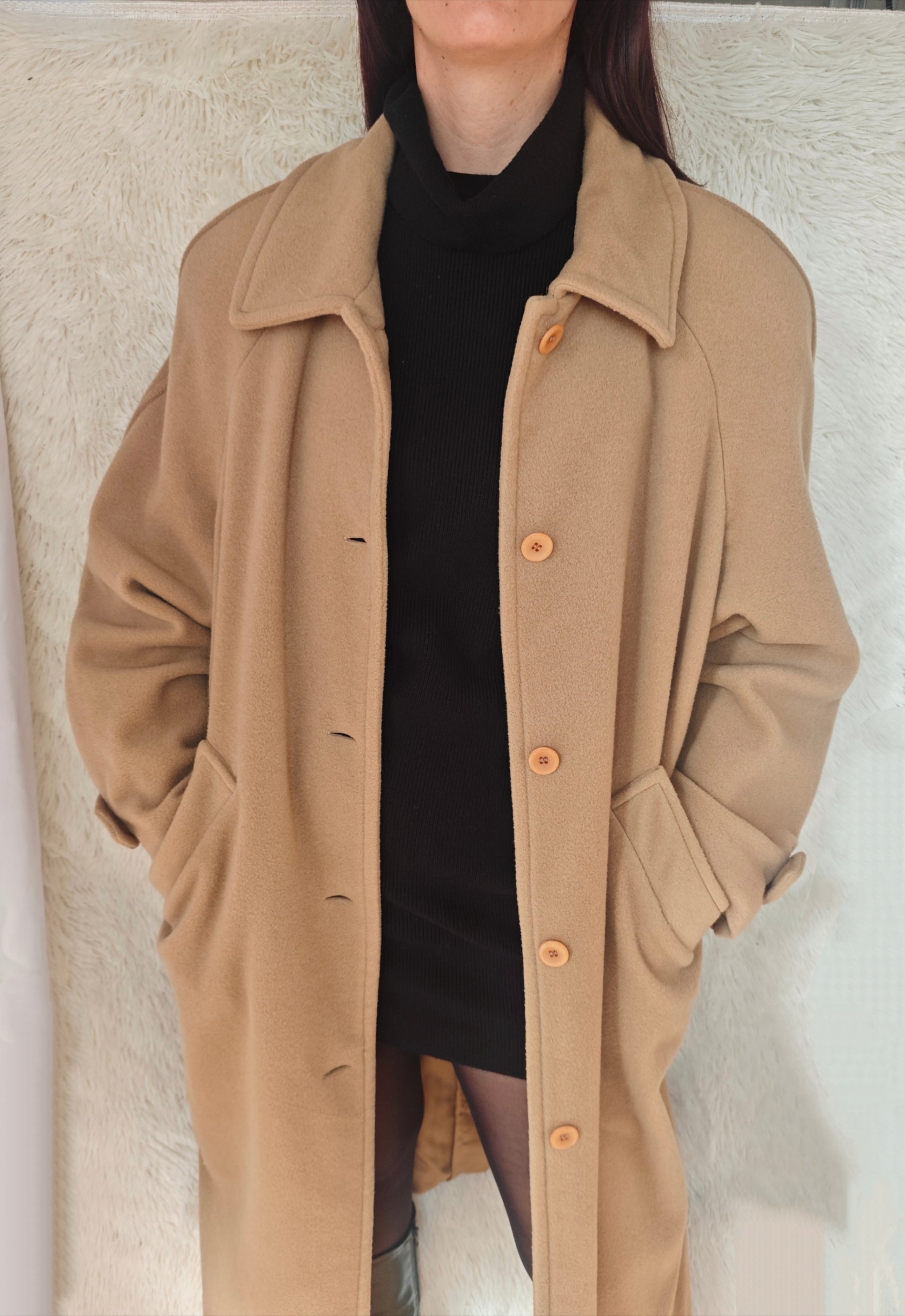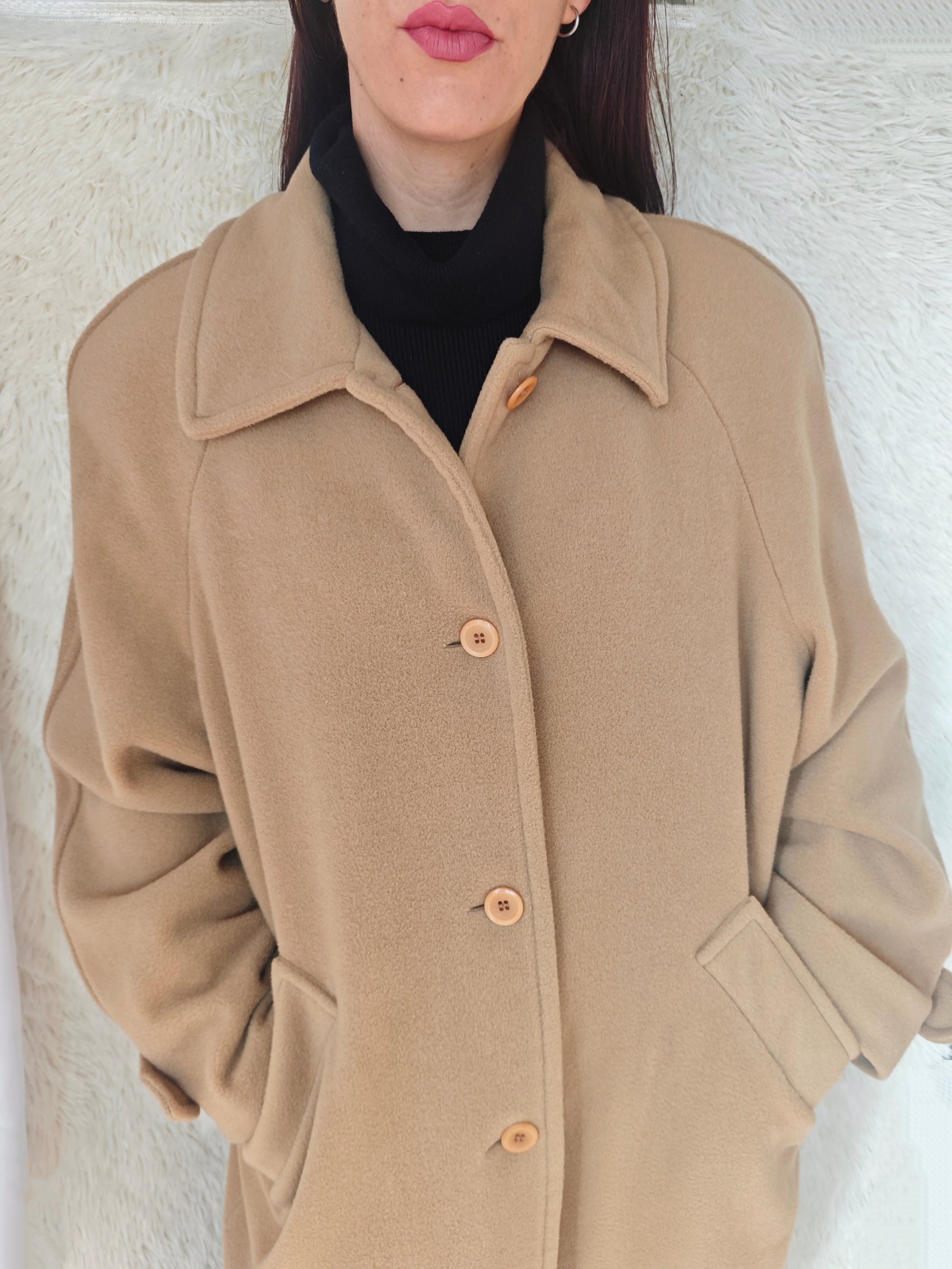 Cappotto vintage in lana e cachemire, colore cammello, chiusura monopetto con bottoni frontali , lungo e avvolgente dal fit oversize, con dettaglio di martingala sulle maniche, pratiche tasche laterali. Spalline