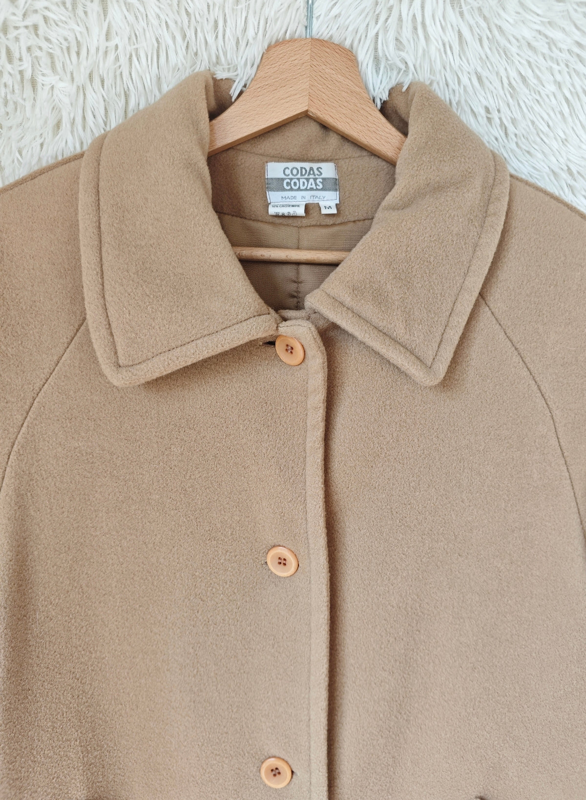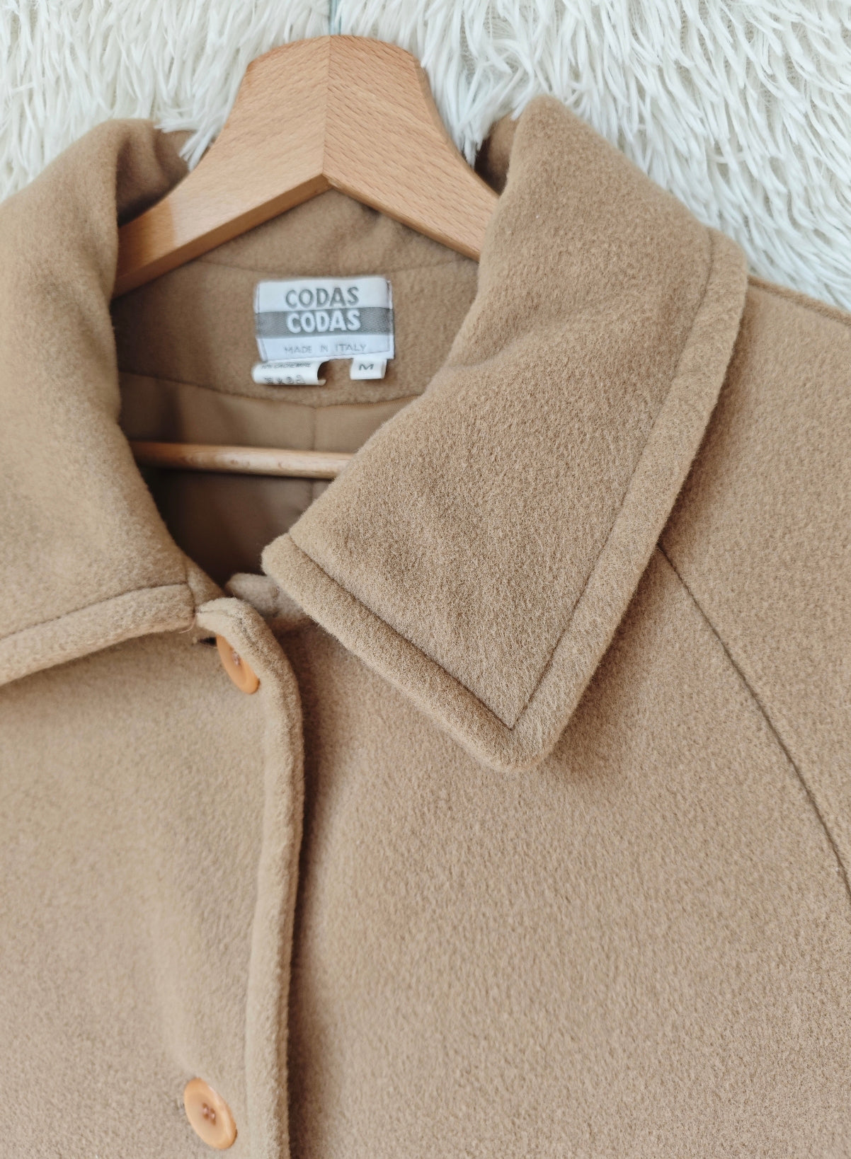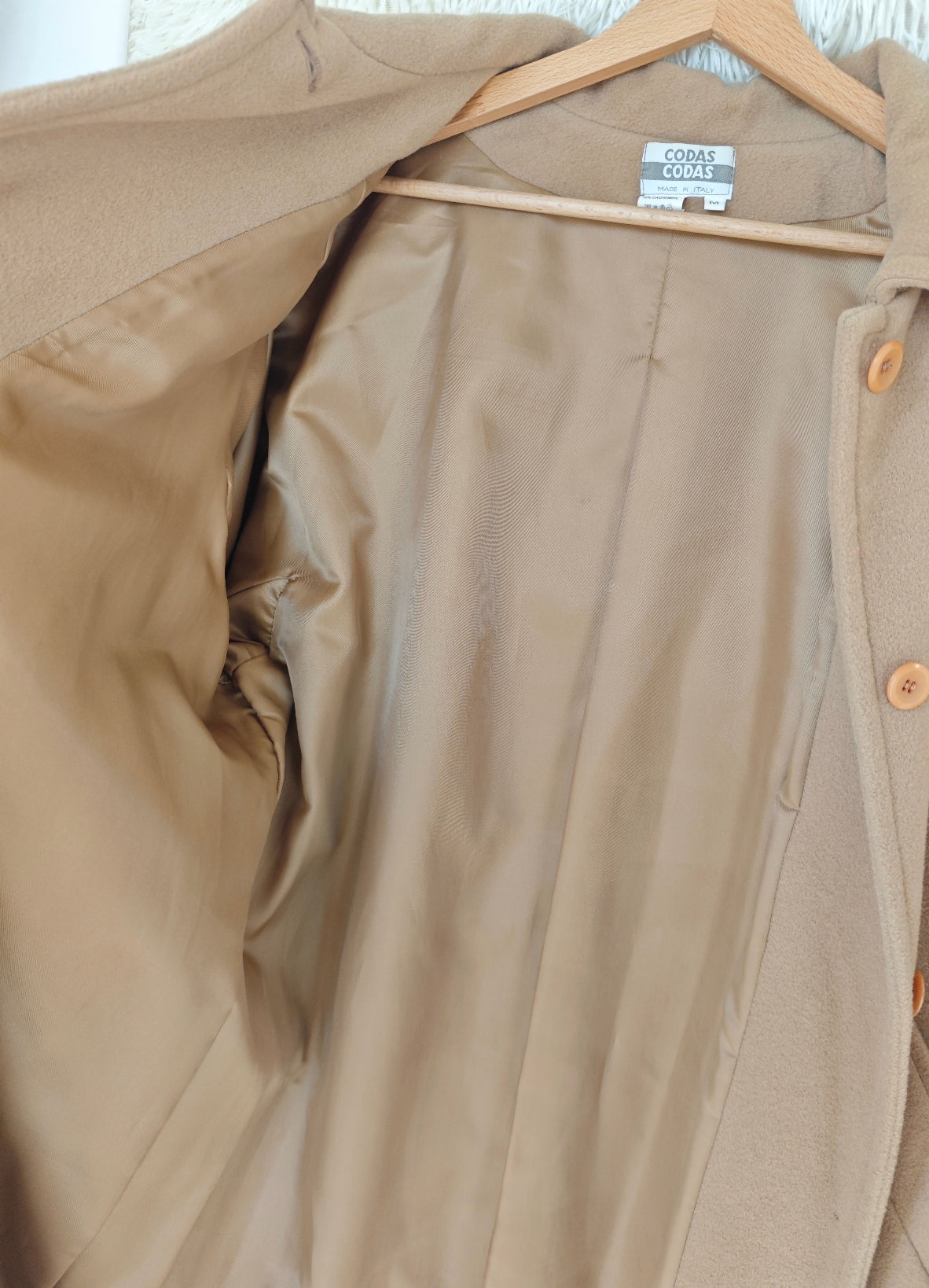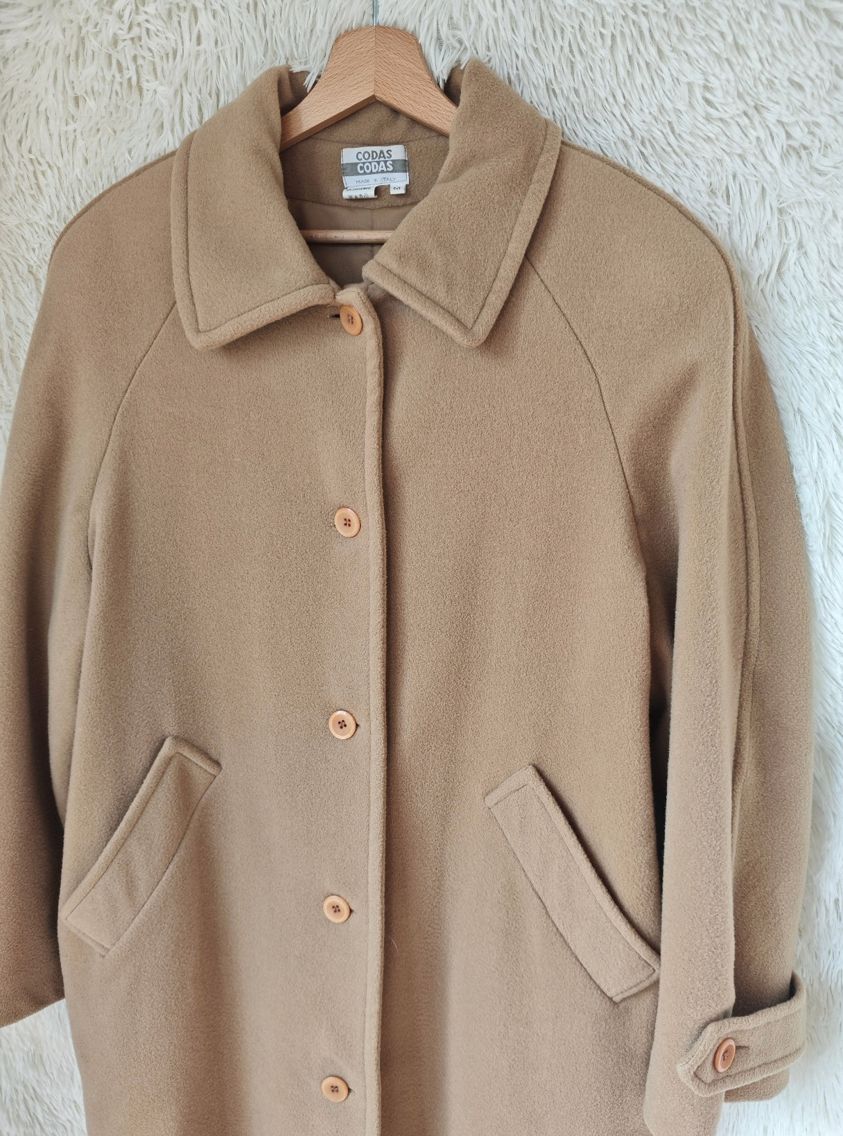 Cappotto vintage in lana e cachemire, colore cammello, chiusura monopetto con bottoni frontali , lungo e avvolgente dal fit oversize, con dettaglio di martingala sulle maniche, pratiche tasche laterali. Spalline