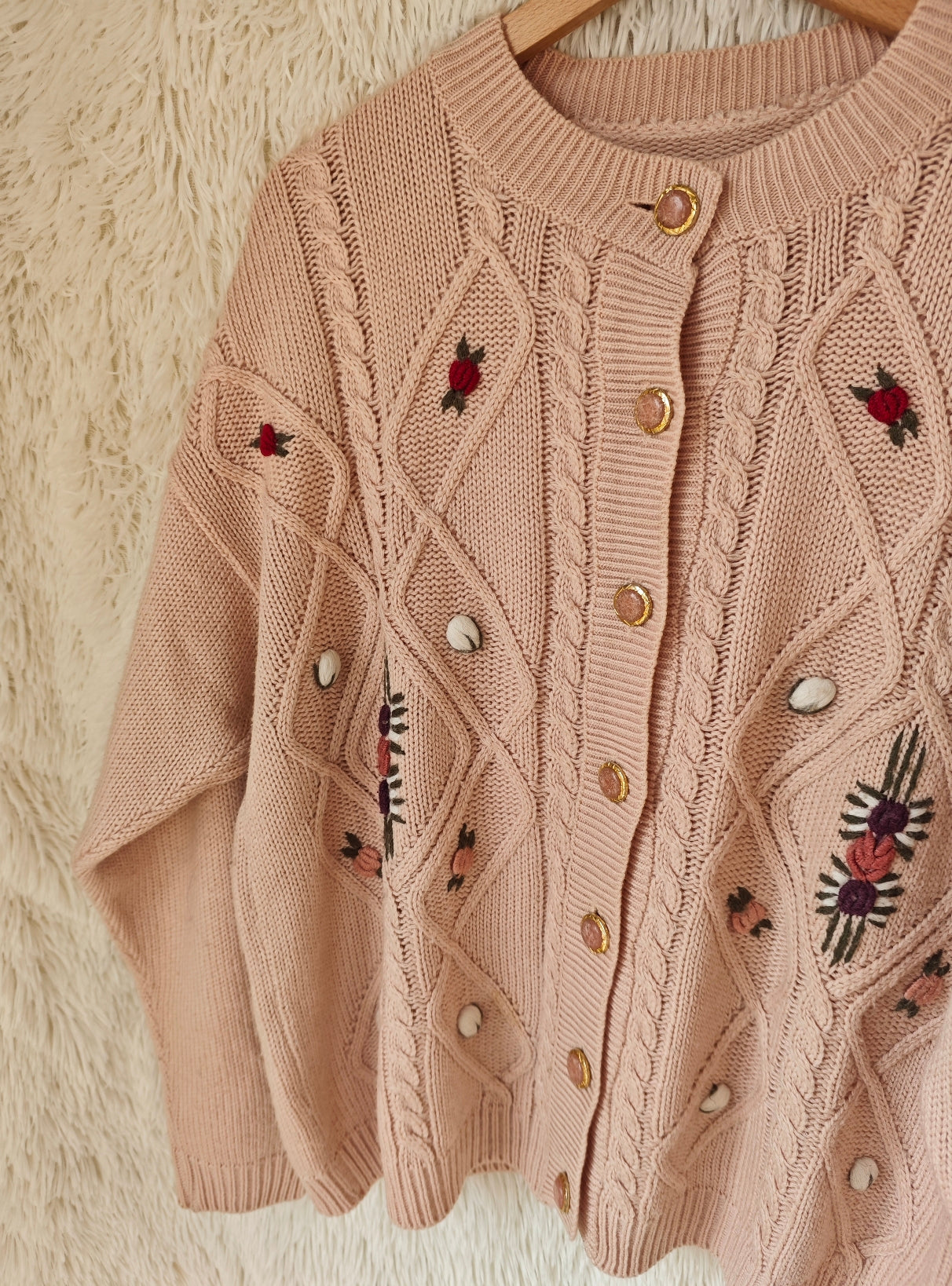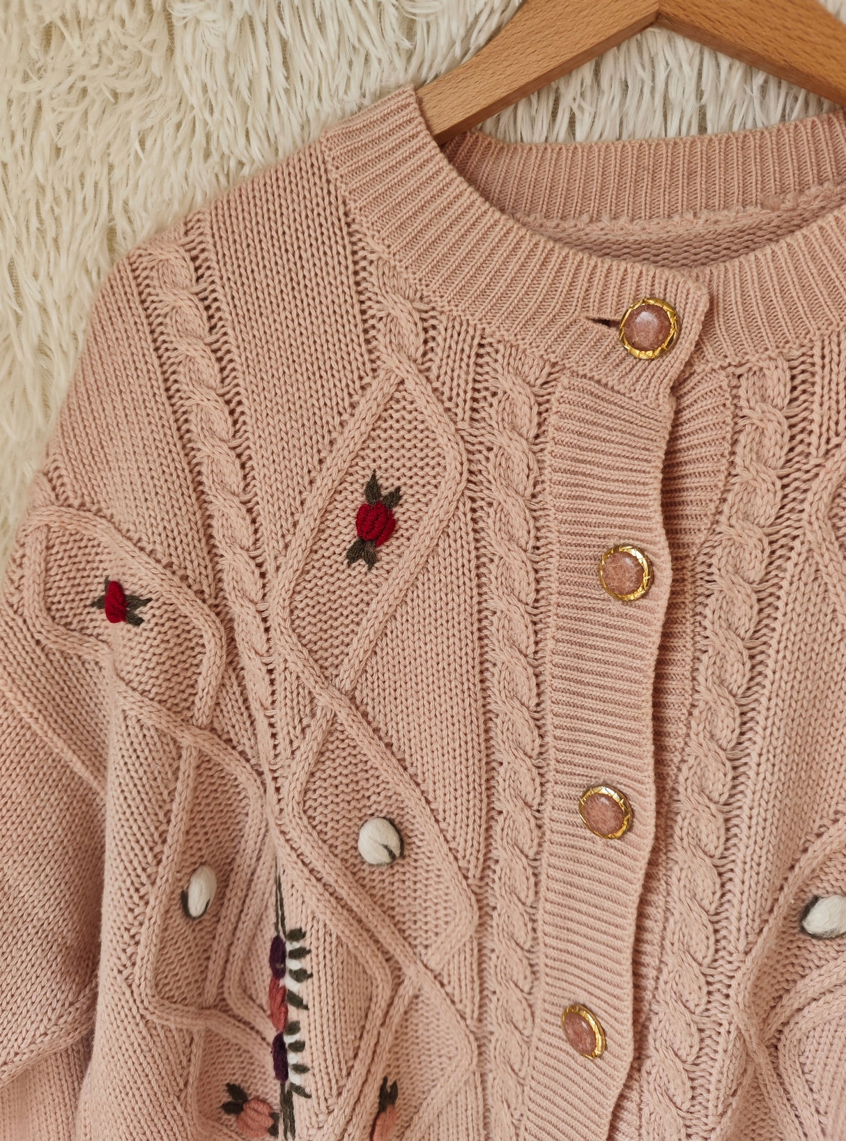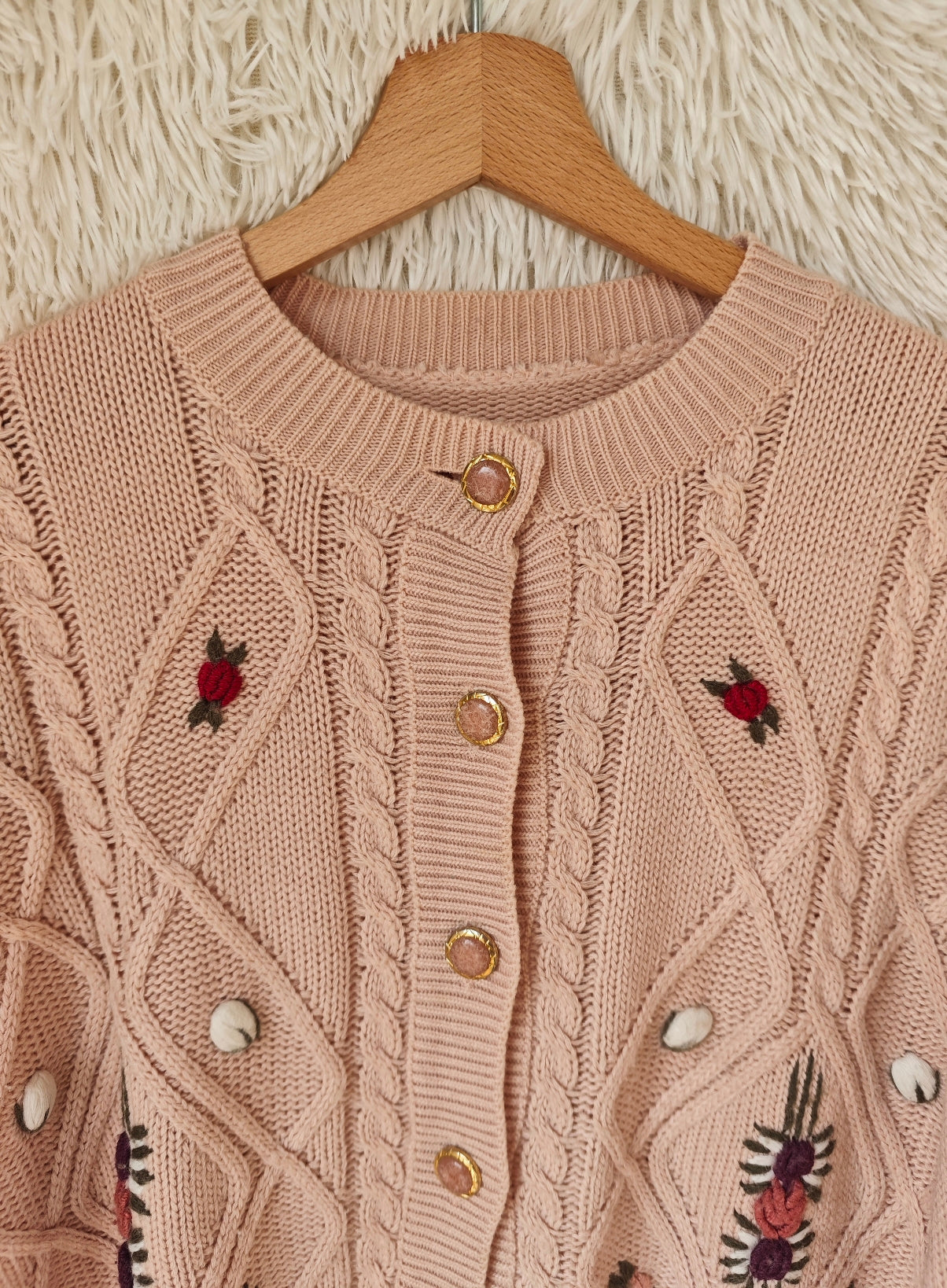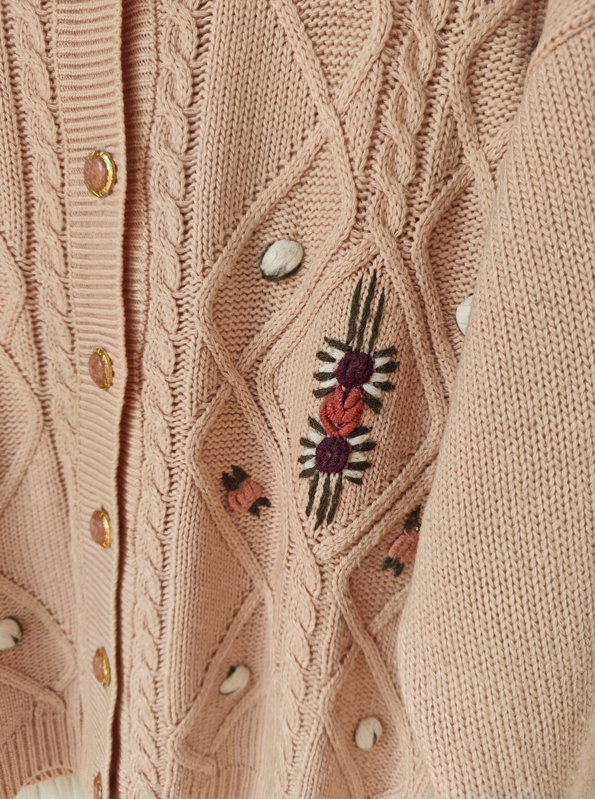 Cardigan rosa lavorato a mano con dettagli tridimensionali e ricami floreali.