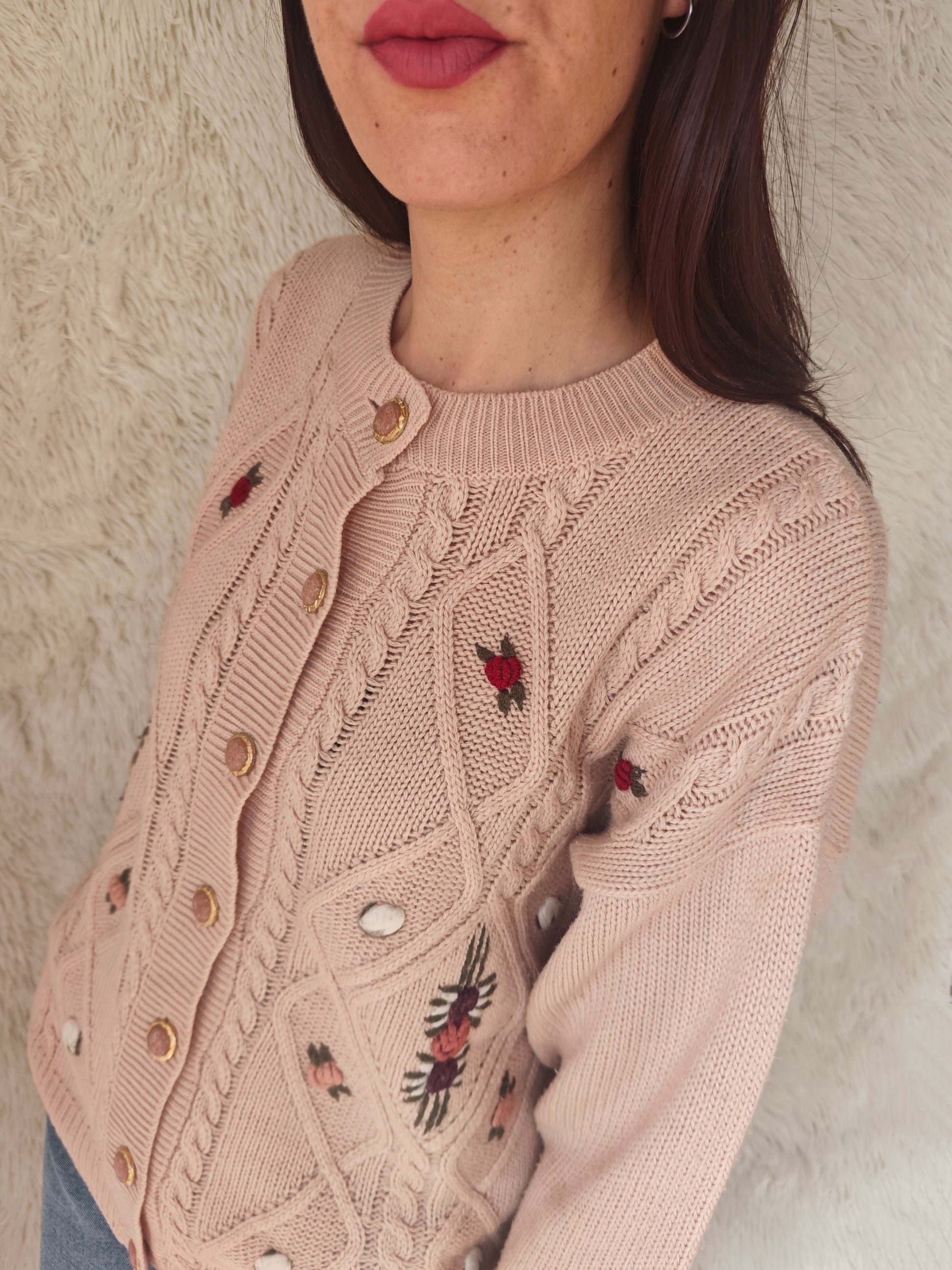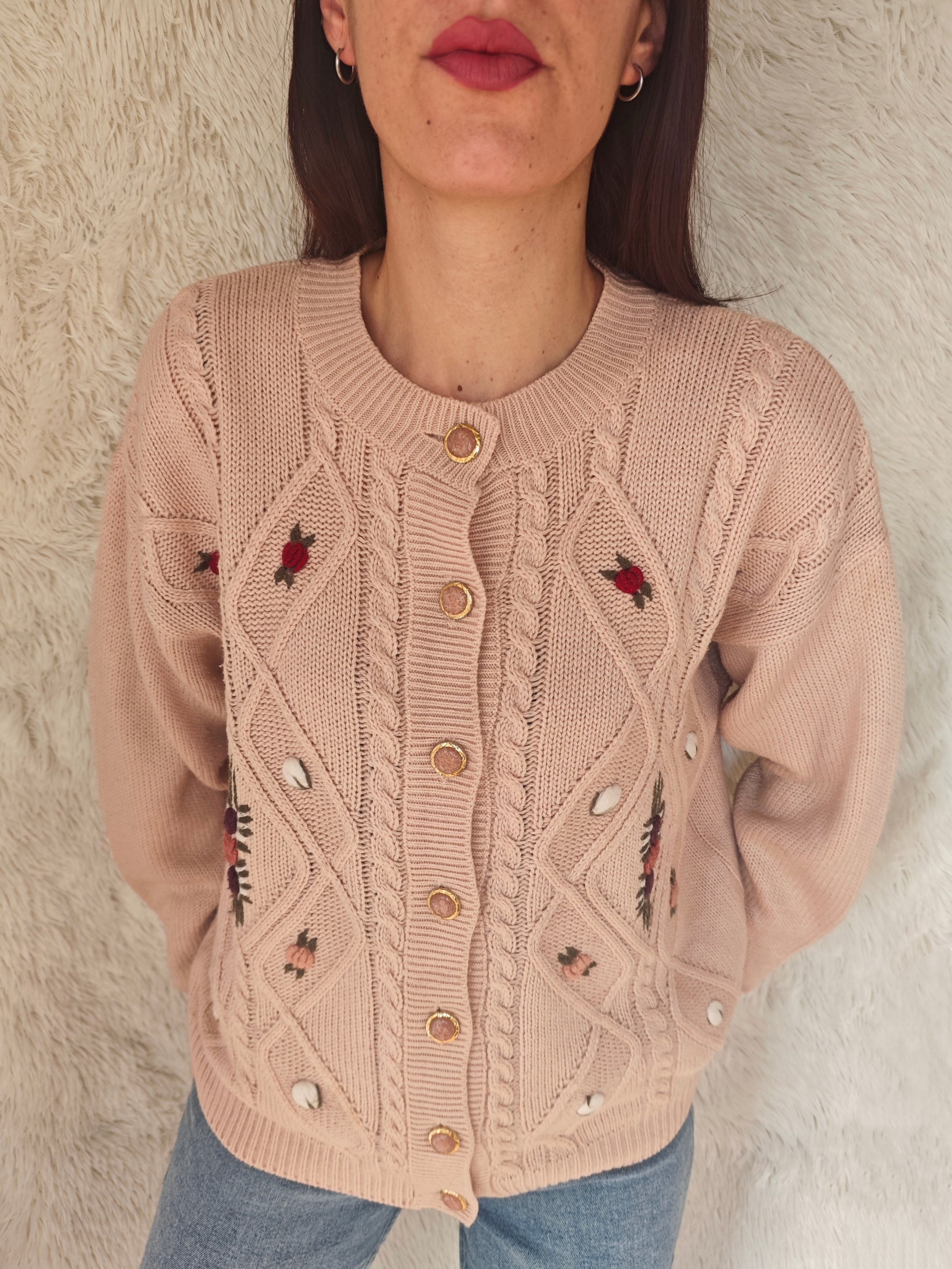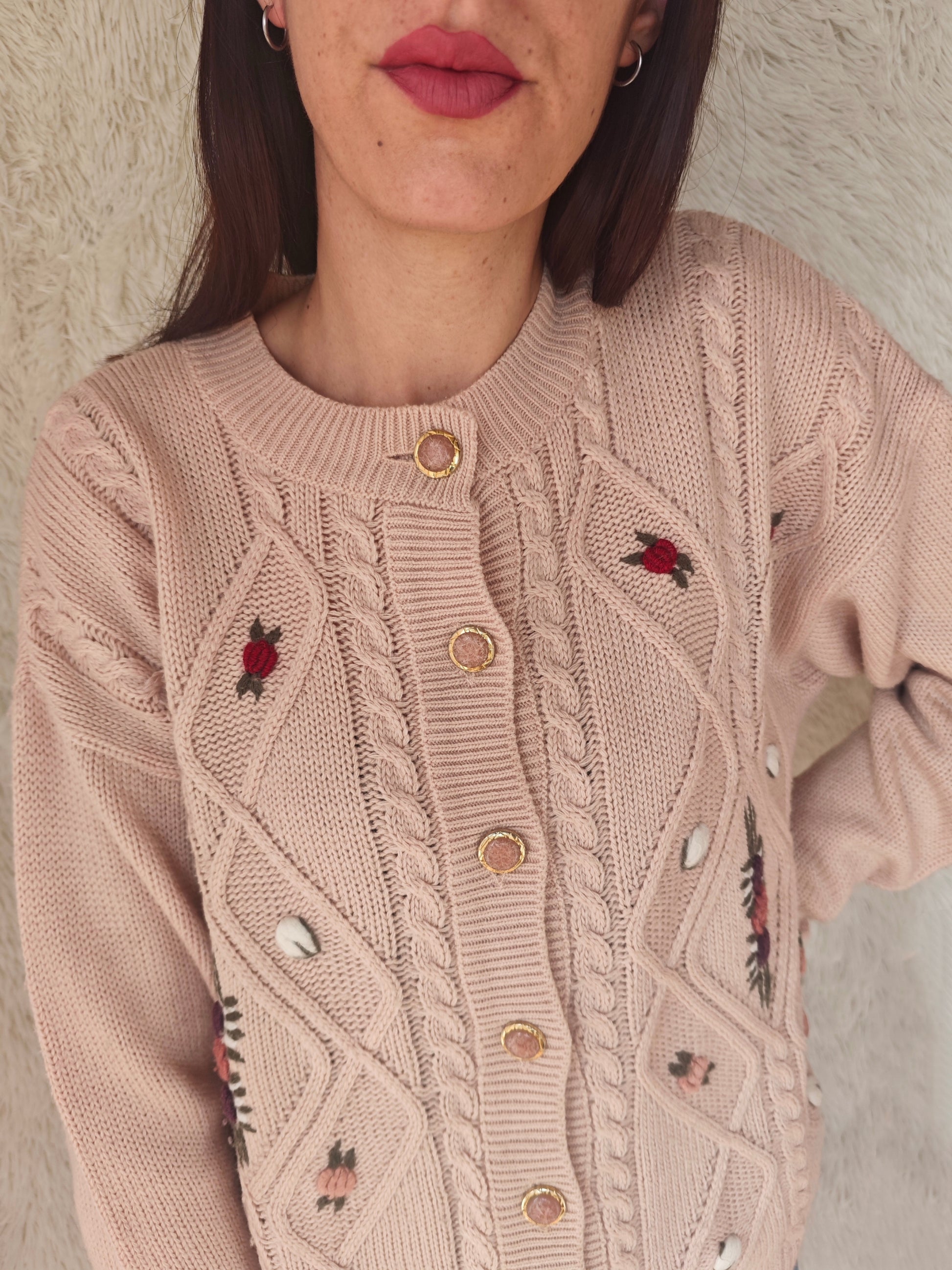 Cardigan rosa lavorato a mano con dettagli tridimensionali e ricami floreali.