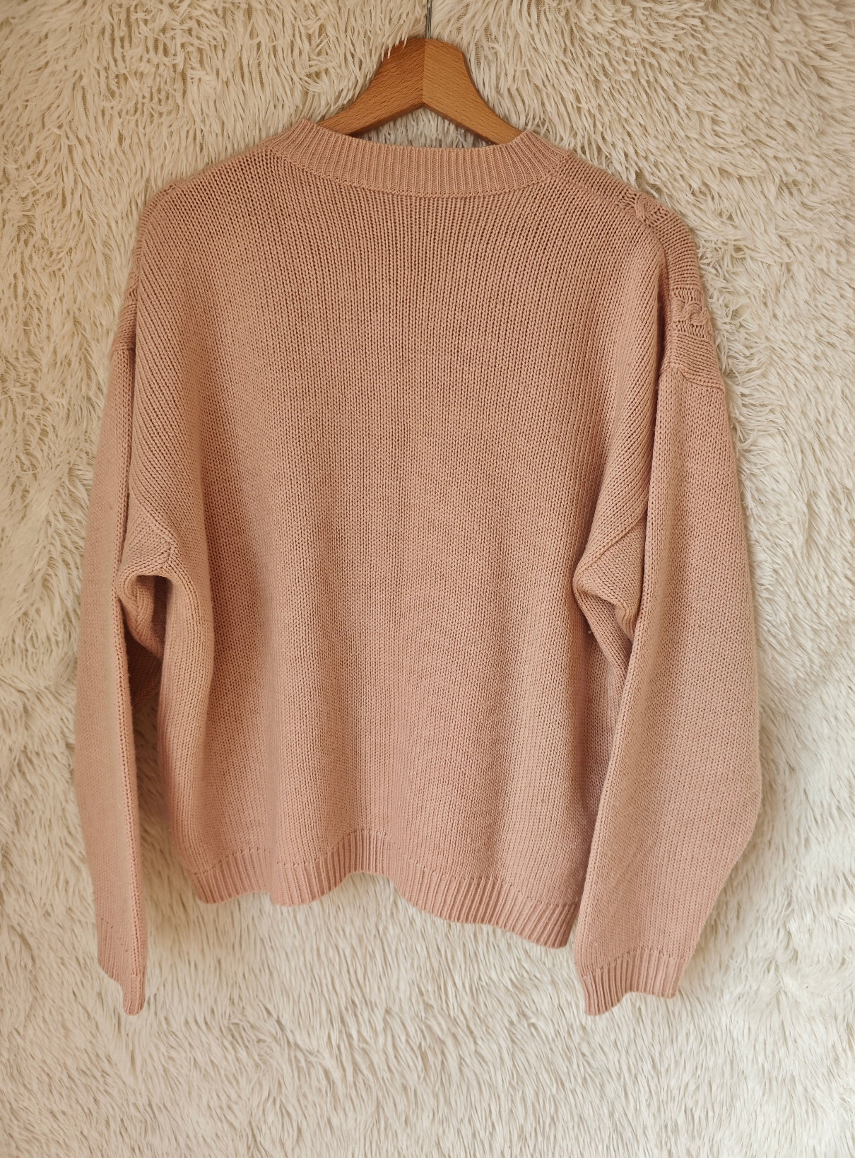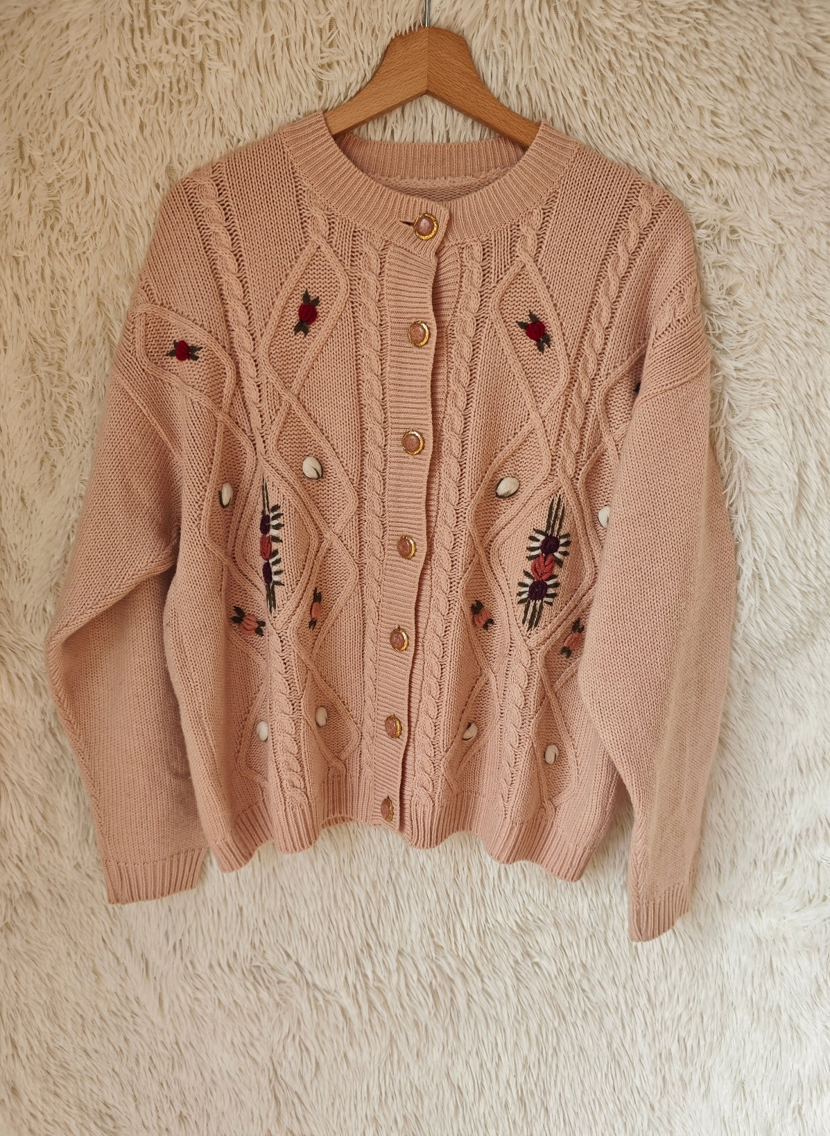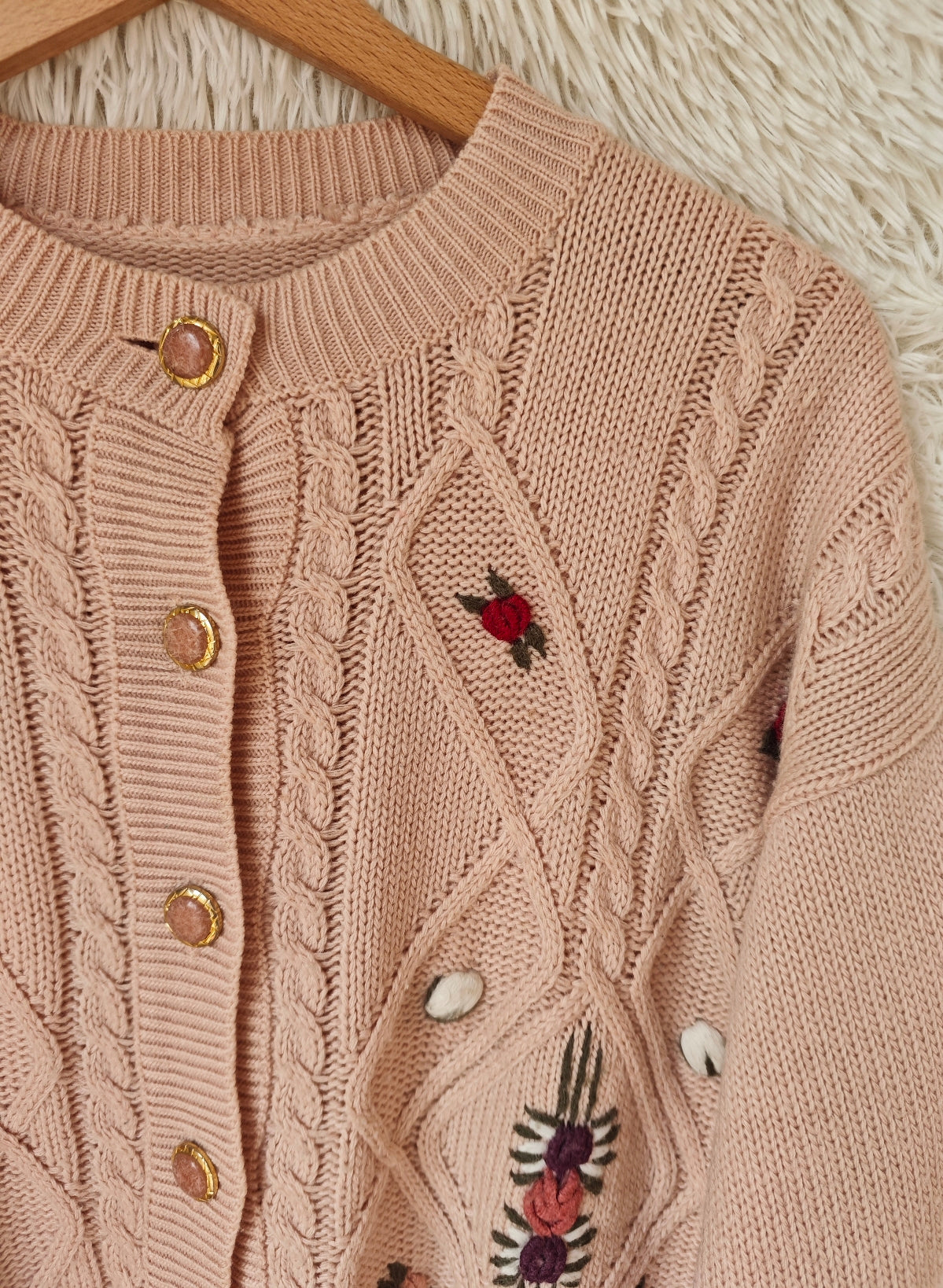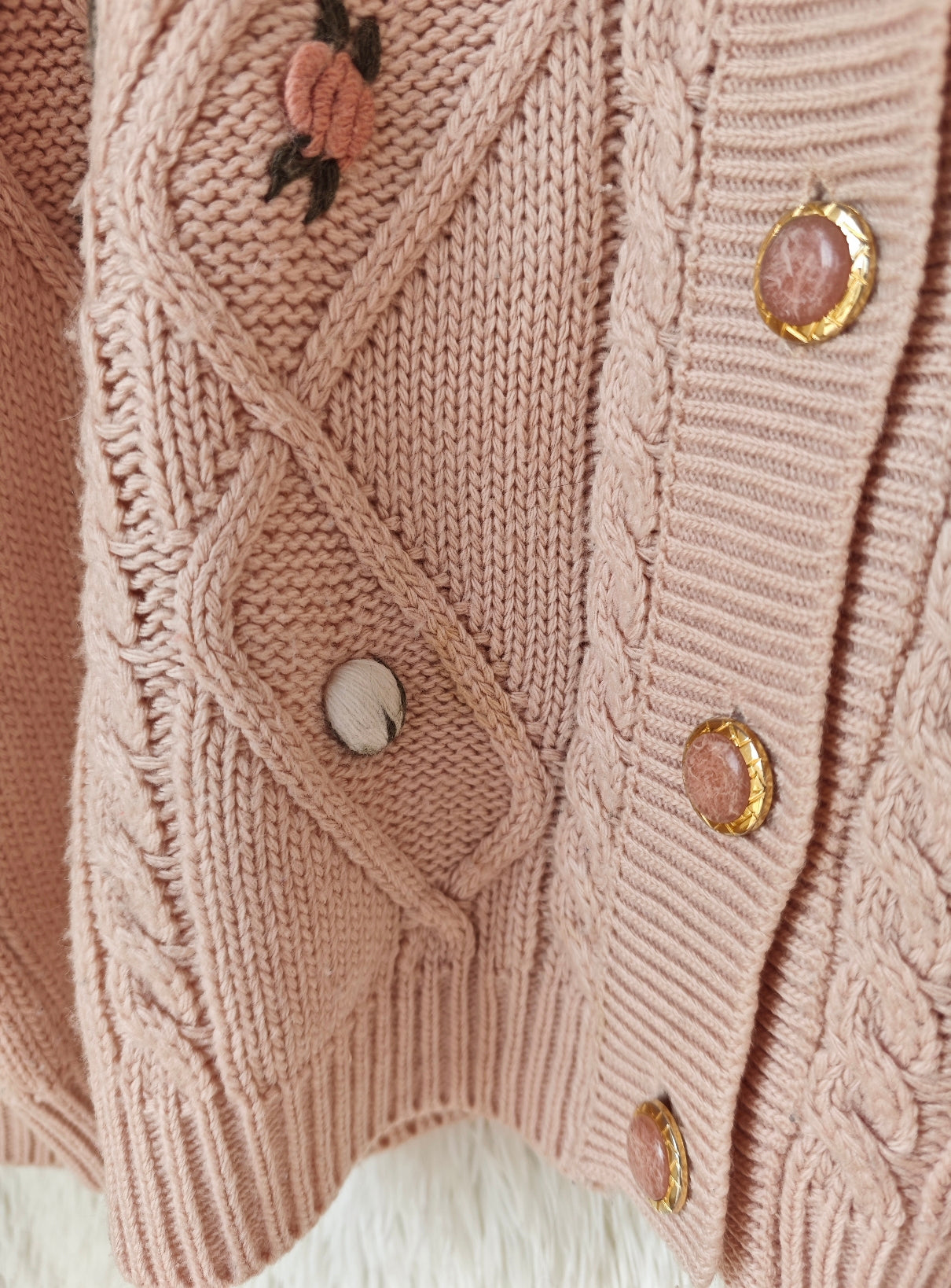 Cardigan rosa lavorato a mano con dettagli tridimensionali e ricami floreali.
