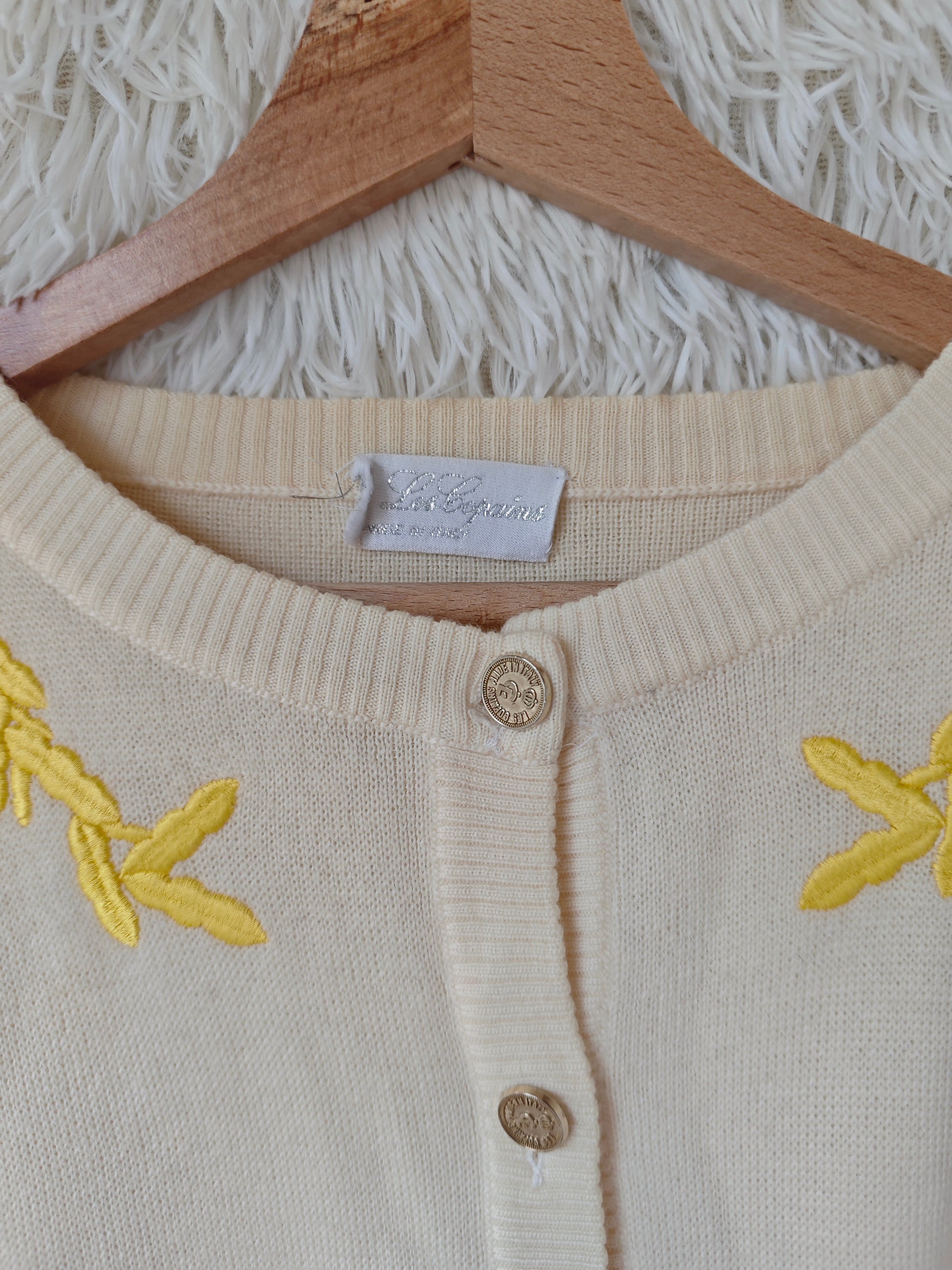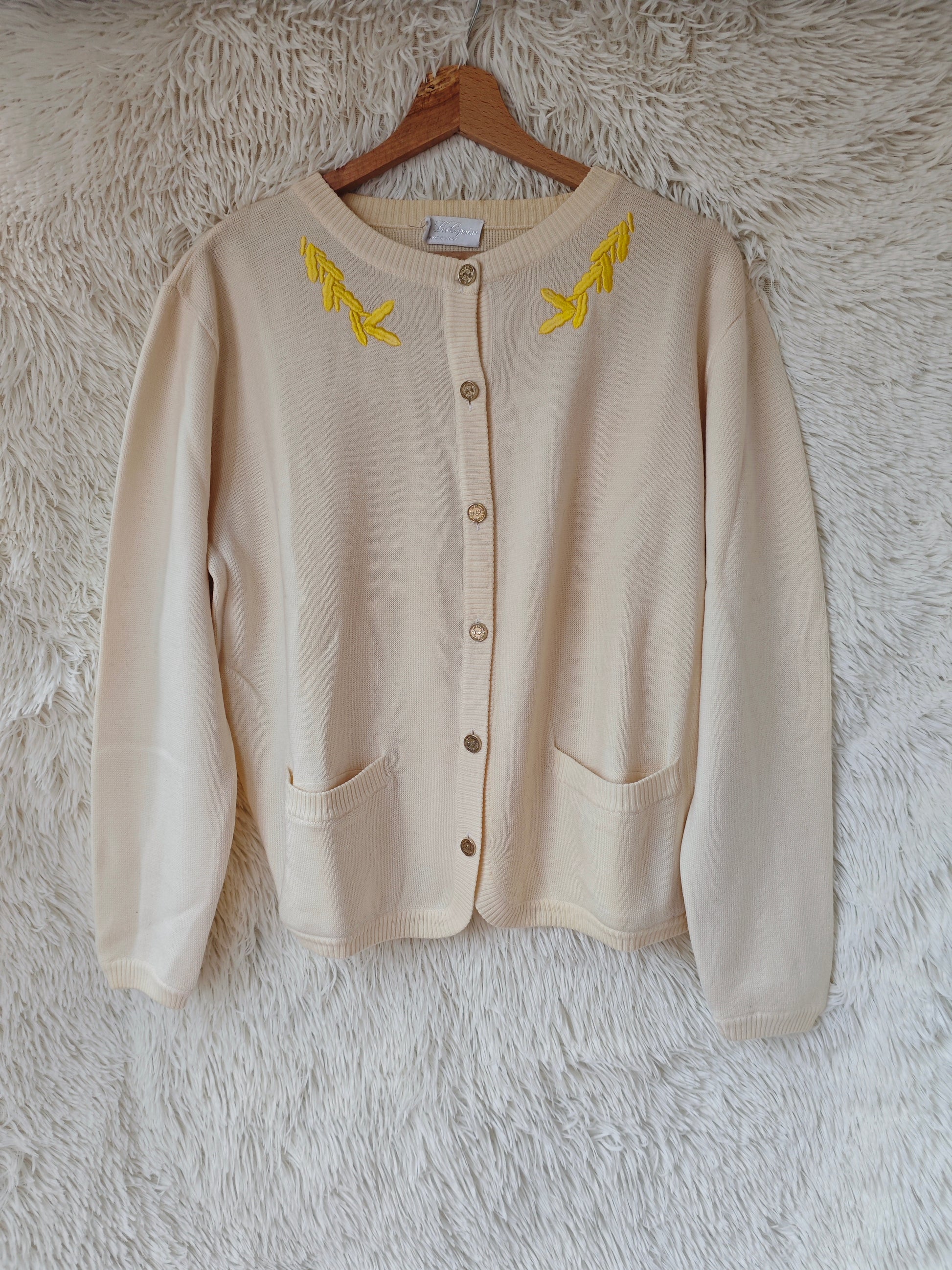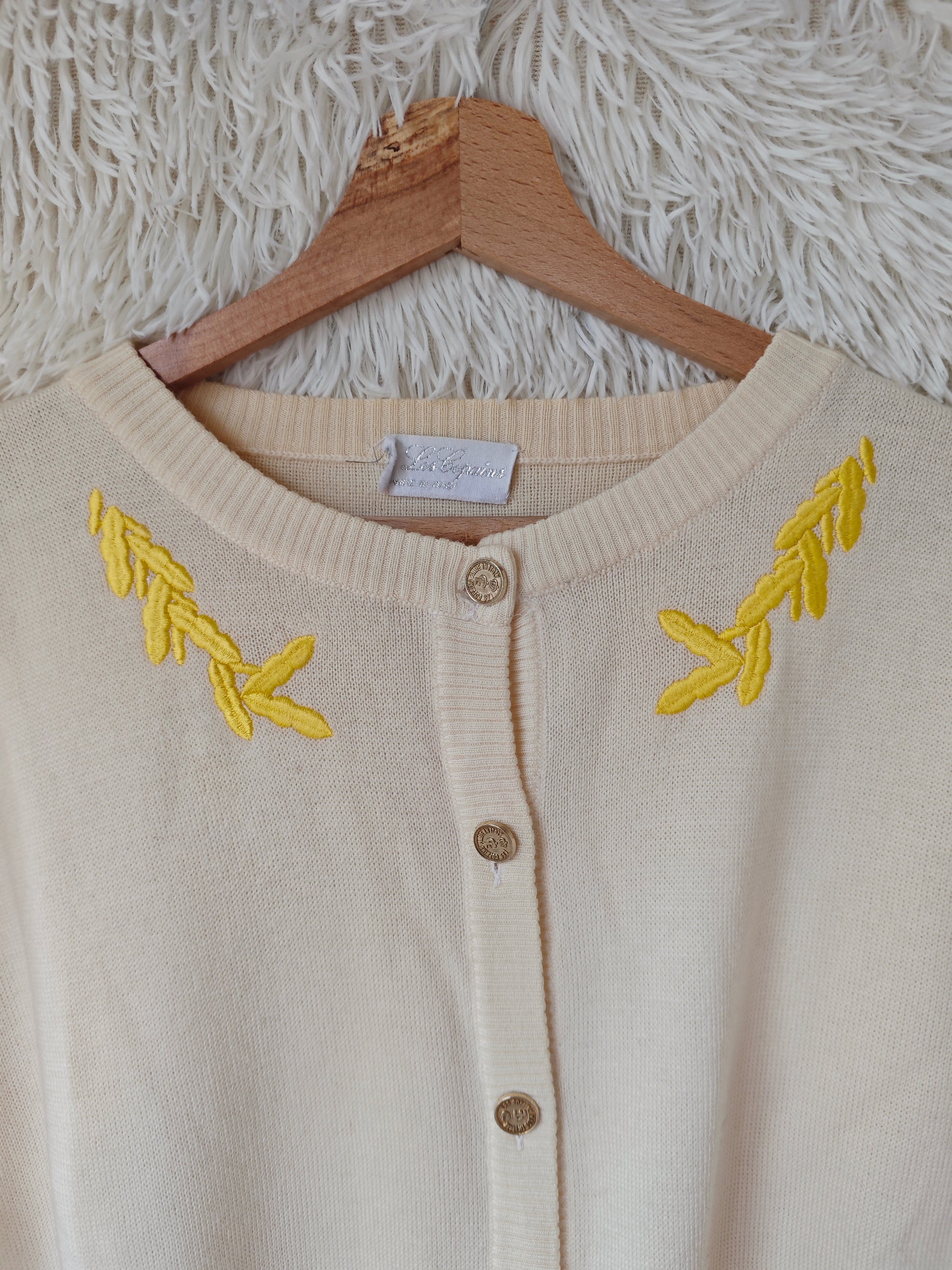 Cardigan vintage Le Copains, color panna, in lana. Ha piccoli dettagli ricamati colore giallo che lo rendono speciale senza esagerare. Morbido e comodo, perfetto sia chiuso che aperto, da abbinare a t-shirt, camicie o dolcevita.