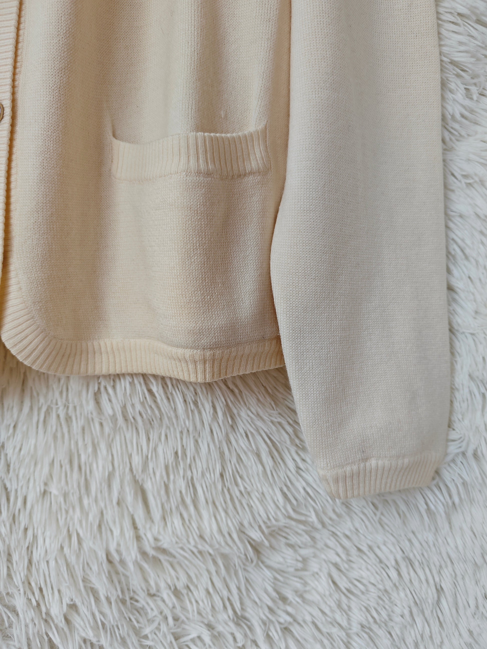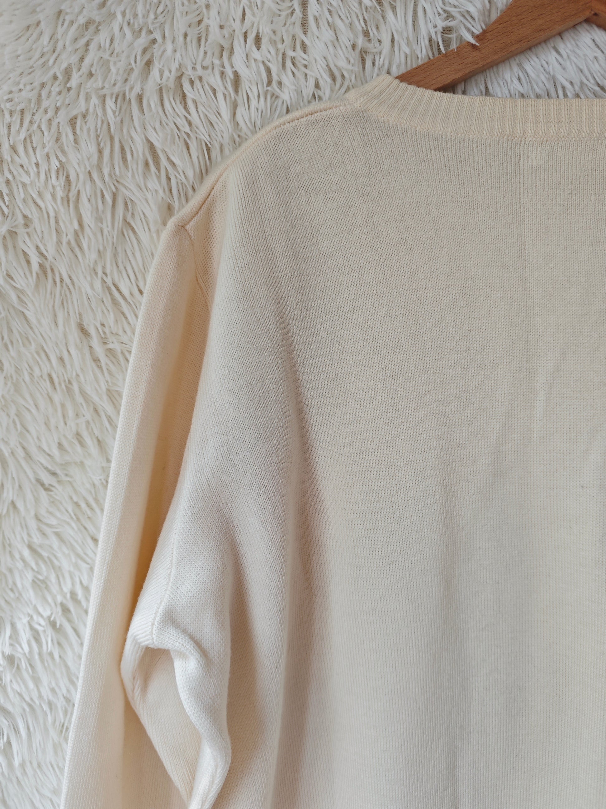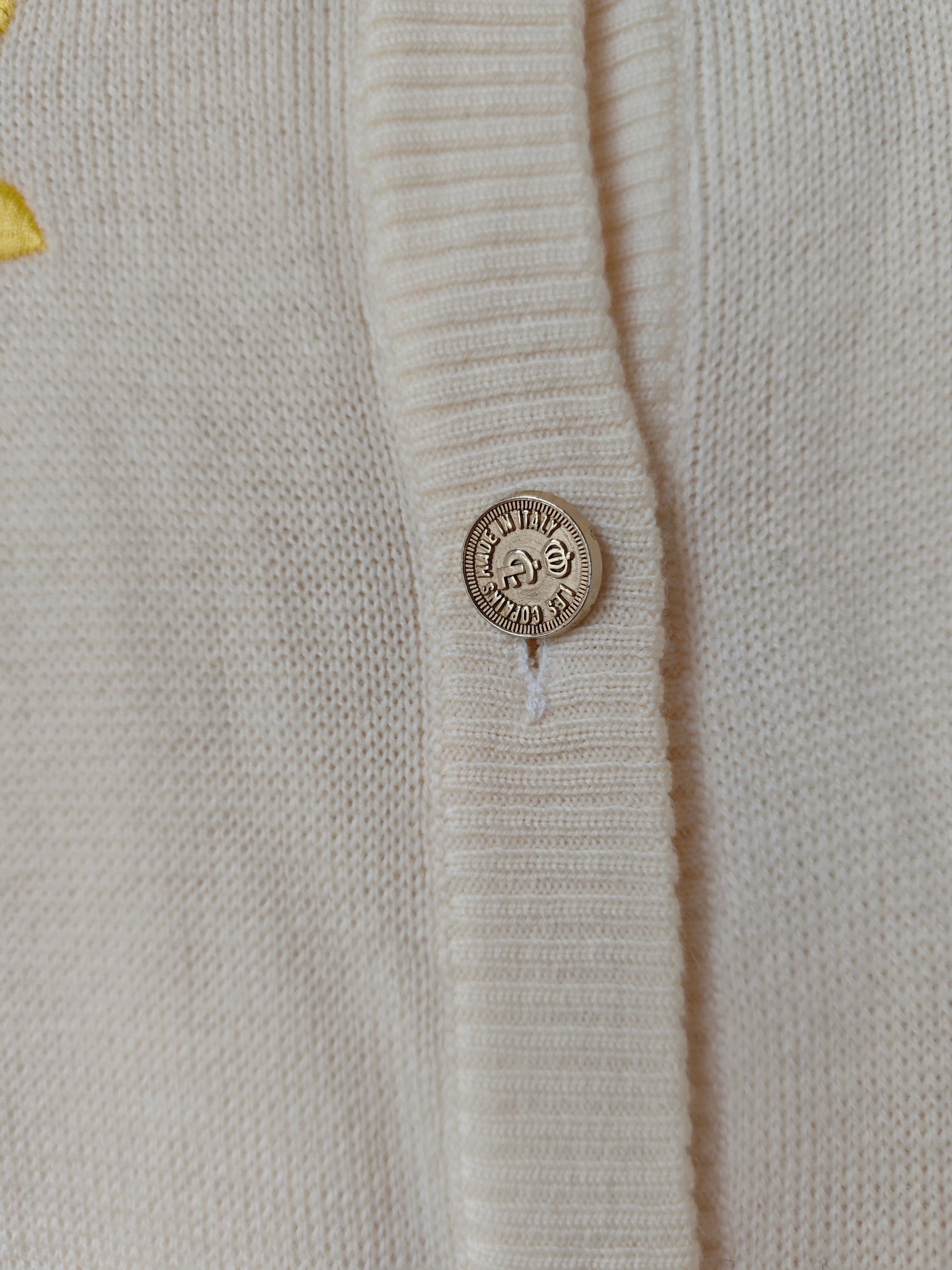 Cardigan vintage Le Copains, color panna, in lana. Ha piccoli dettagli ricamati colore giallo che lo rendono speciale senza esagerare. Morbido e comodo, perfetto sia chiuso che aperto, da abbinare a t-shirt, camicie o dolcevita.