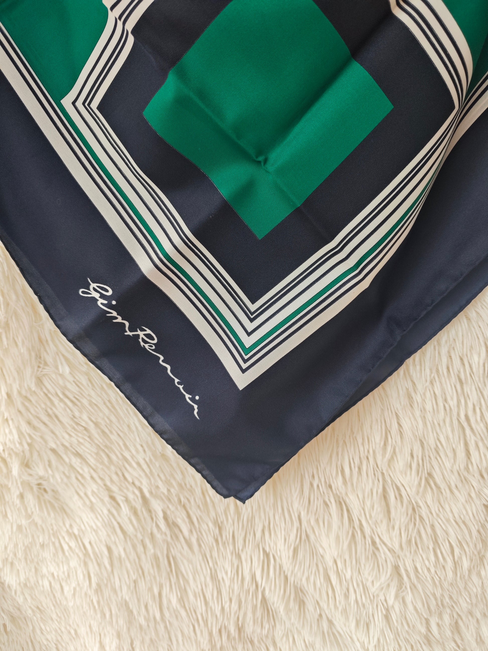 Foulard vintage Gim Renoir con stampa geometrica nei toni del verde e del blu. Tessuto fluido e luminoso.