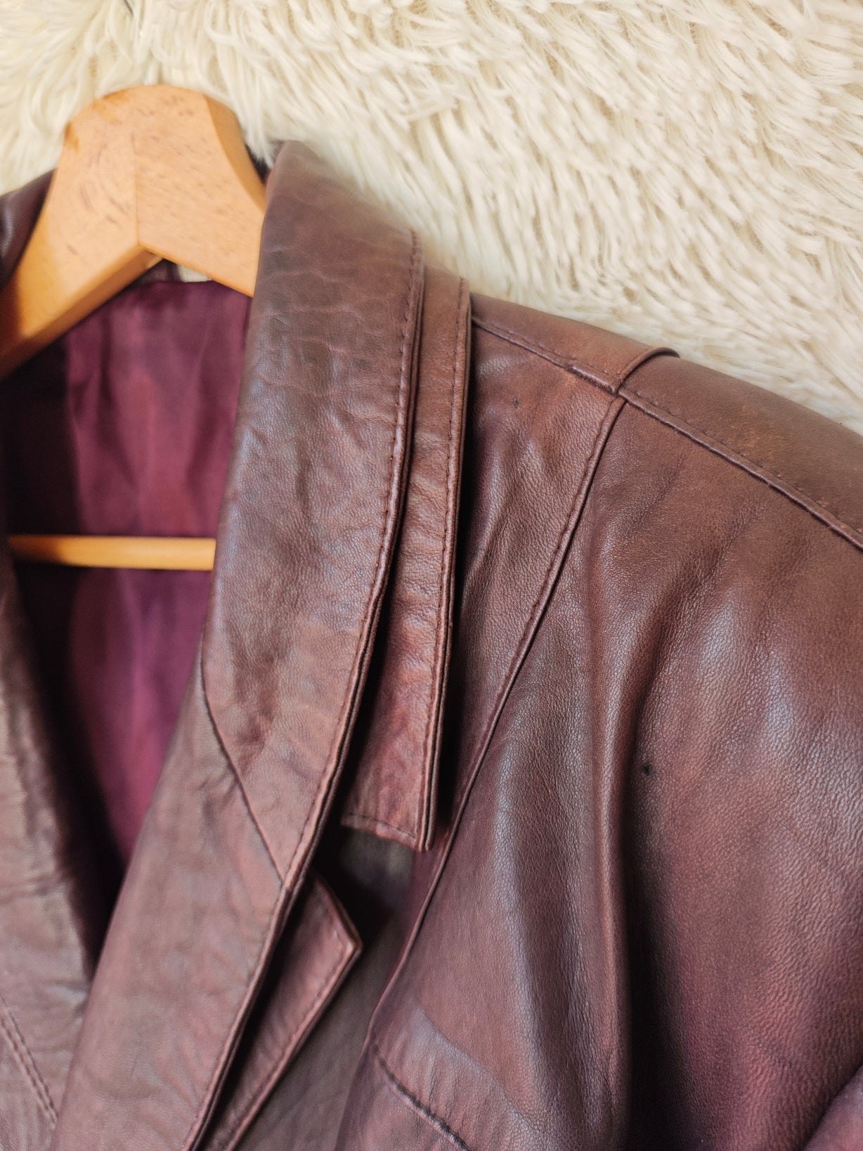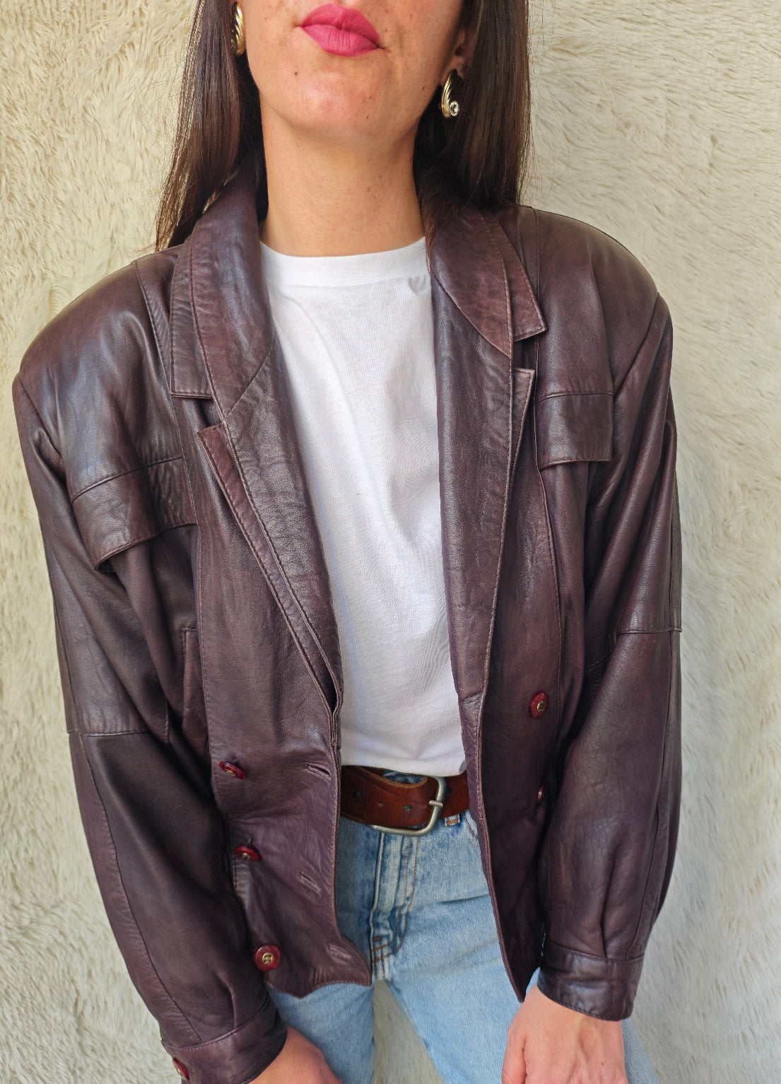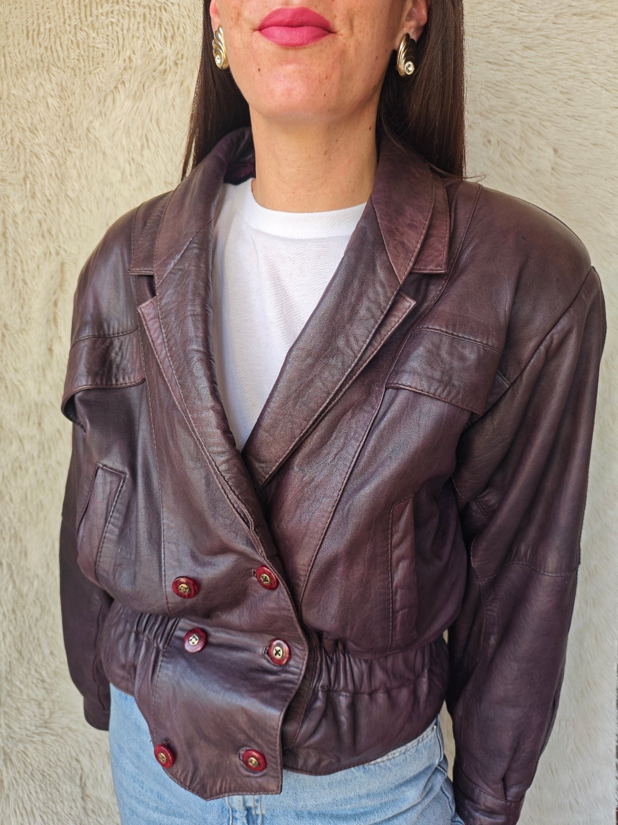 Giacca vintage in vera pelle color melanzana con sfumature marroni, dal taglio strutturato con spalline e linea leggermente bomber tipica degli anni ‘80.