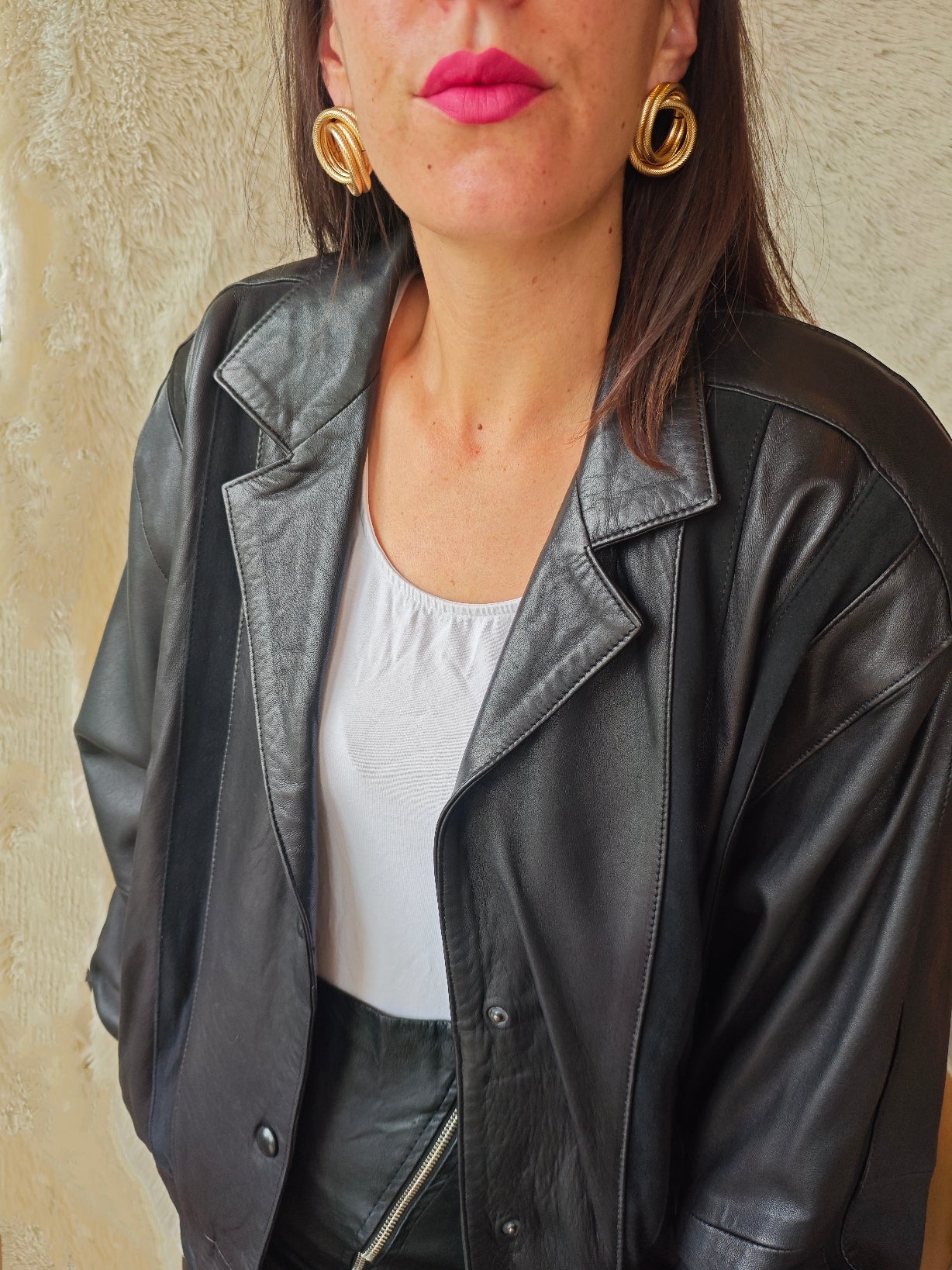 Giacca anni ’80/’90 firmata Jean Forestier, realizzata in vera pelle. Modello oversize con spalline , spalle ampie e taglio bomber, chiusura con bottoni a pressione, tasche laterali e dettagli in pelle scamosciata a contrasto sul davanti e sulle maniche.