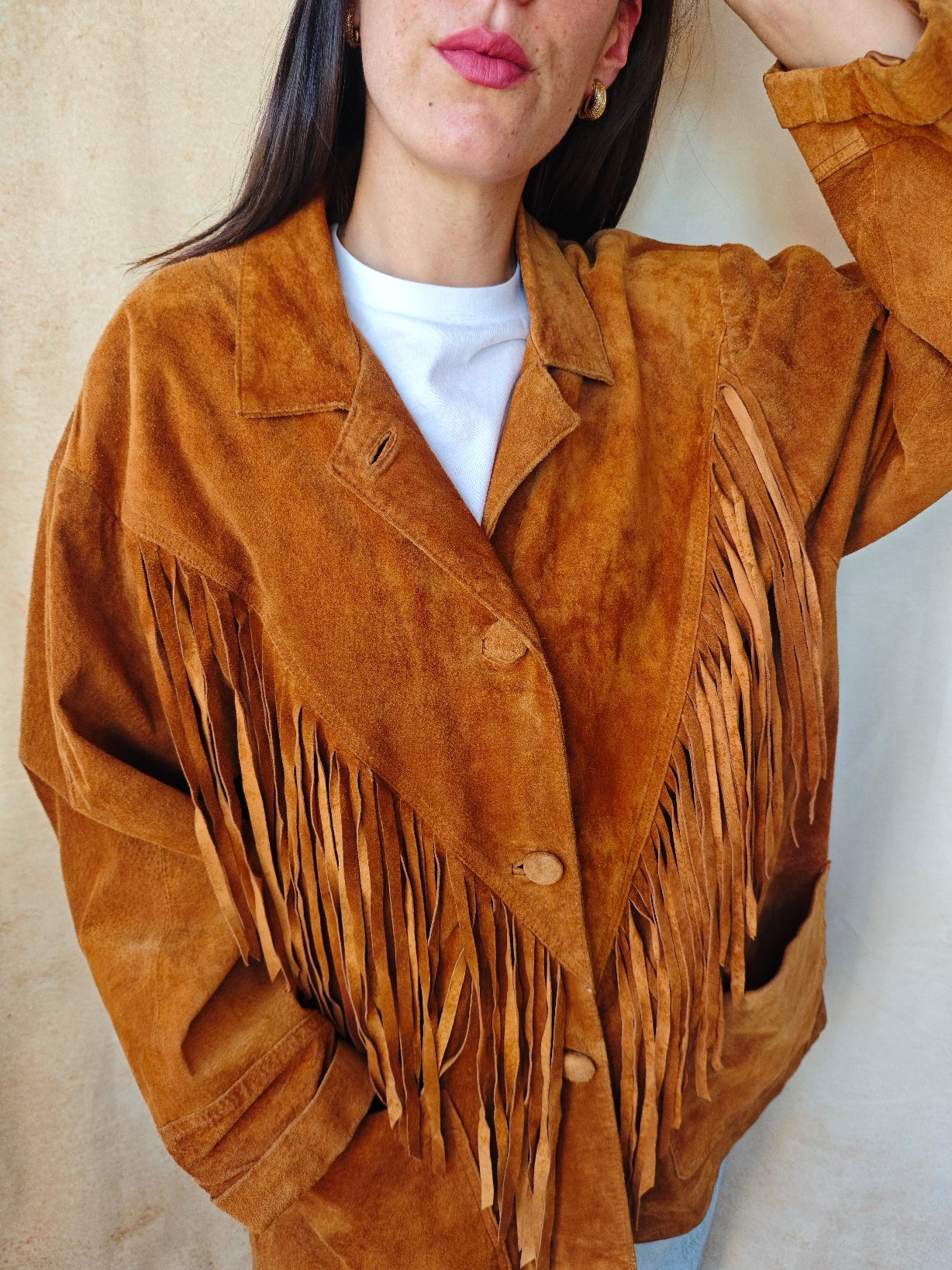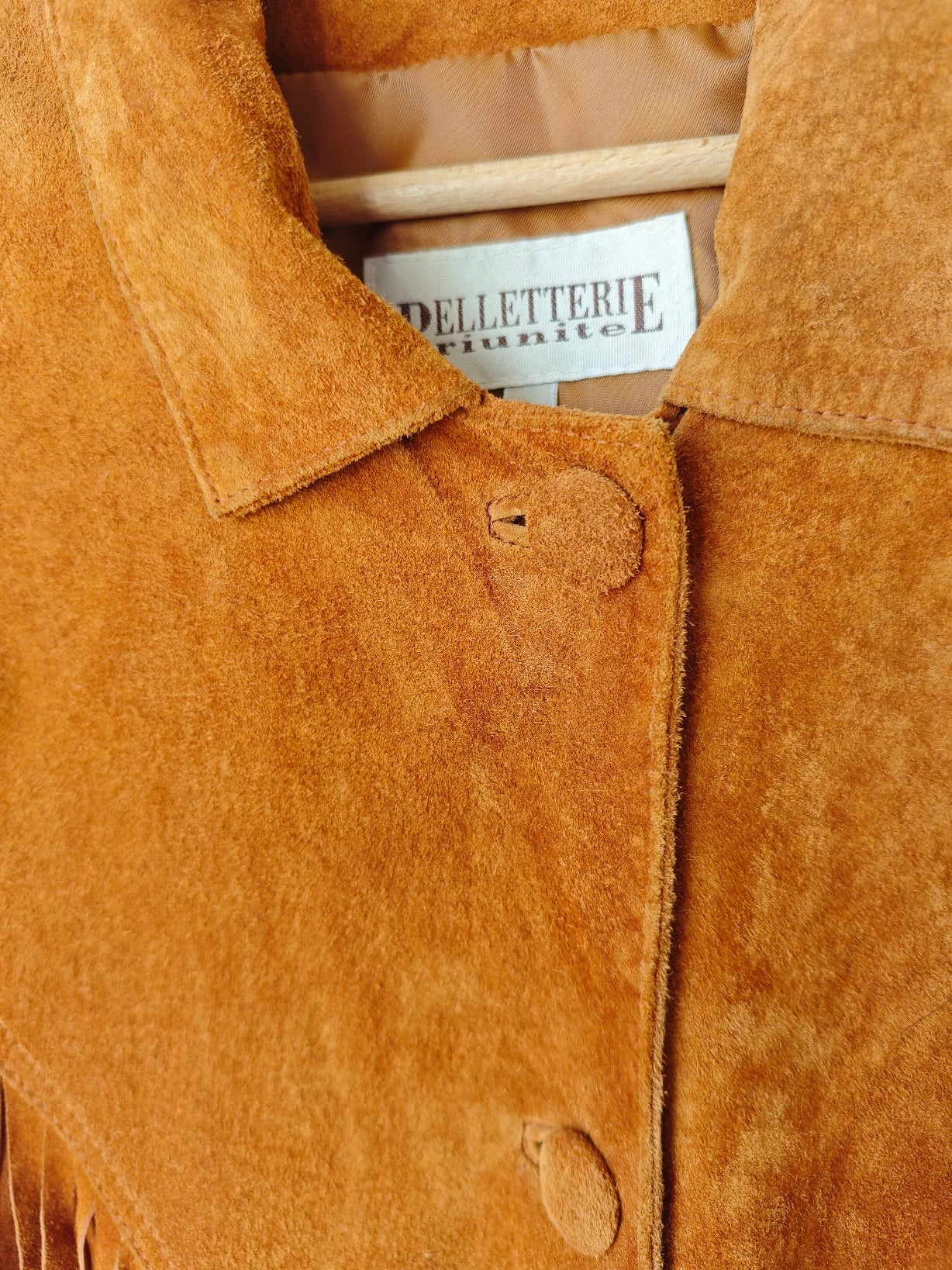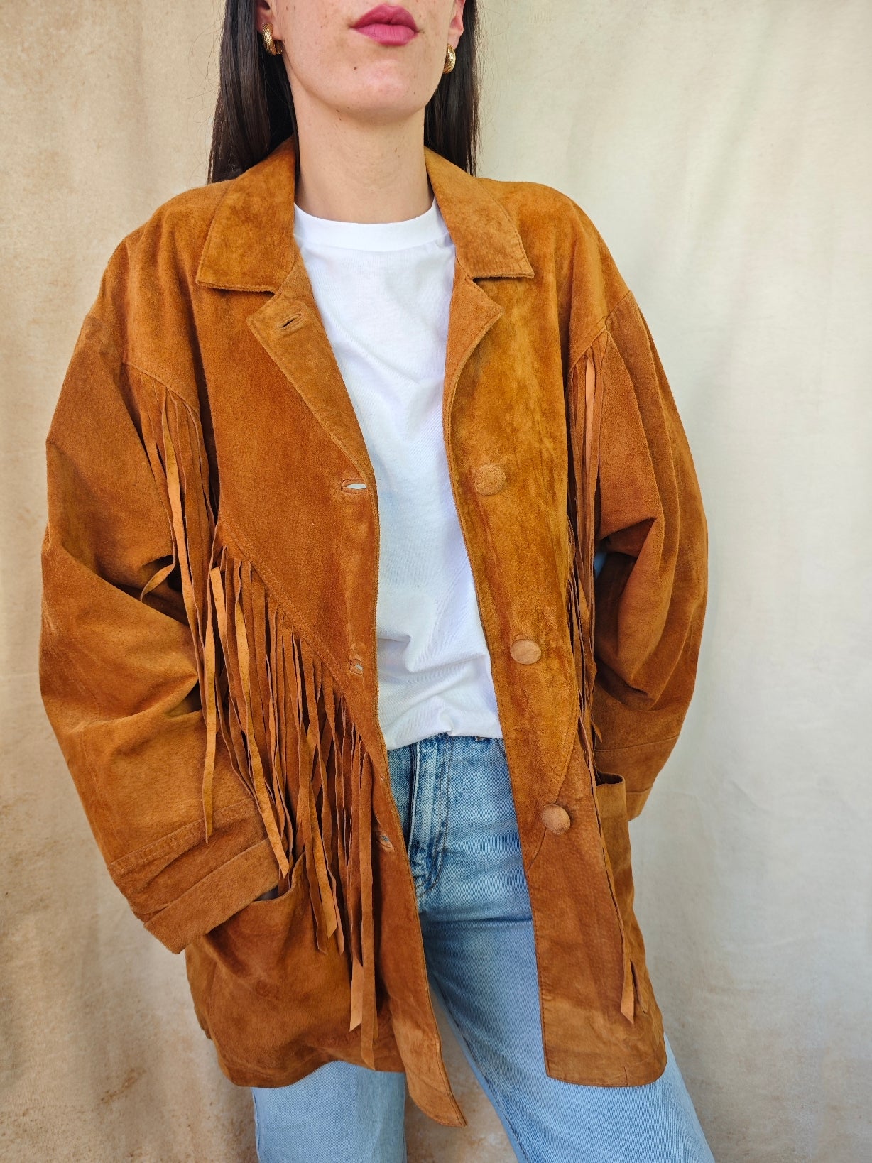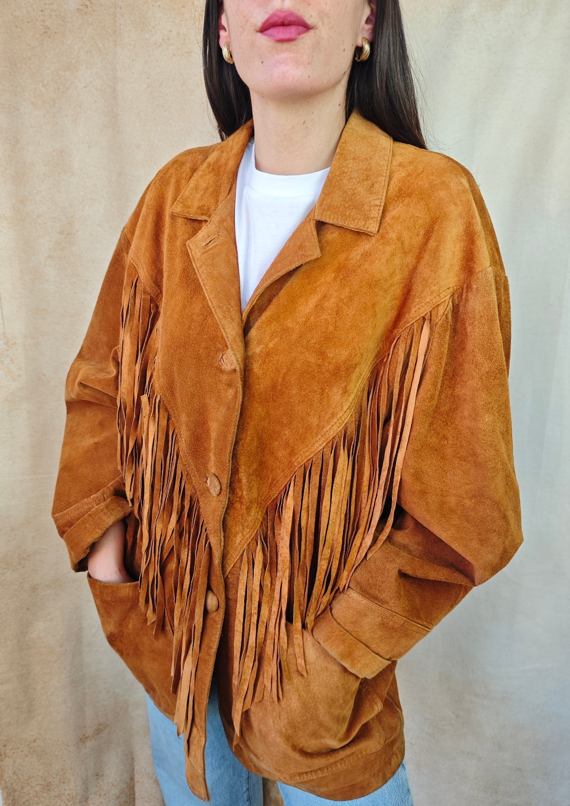 Iconica giacca in vero camoscio color cuoio caldo, impreziosita da lunghe frange in pelle sul davanti e sul retro. Modello oversize dal taglio morbido, con chiusura a bottoni rivestiti e tasche laterali.