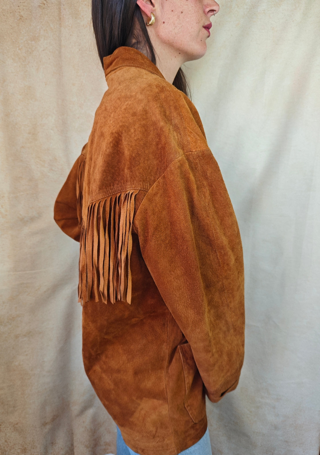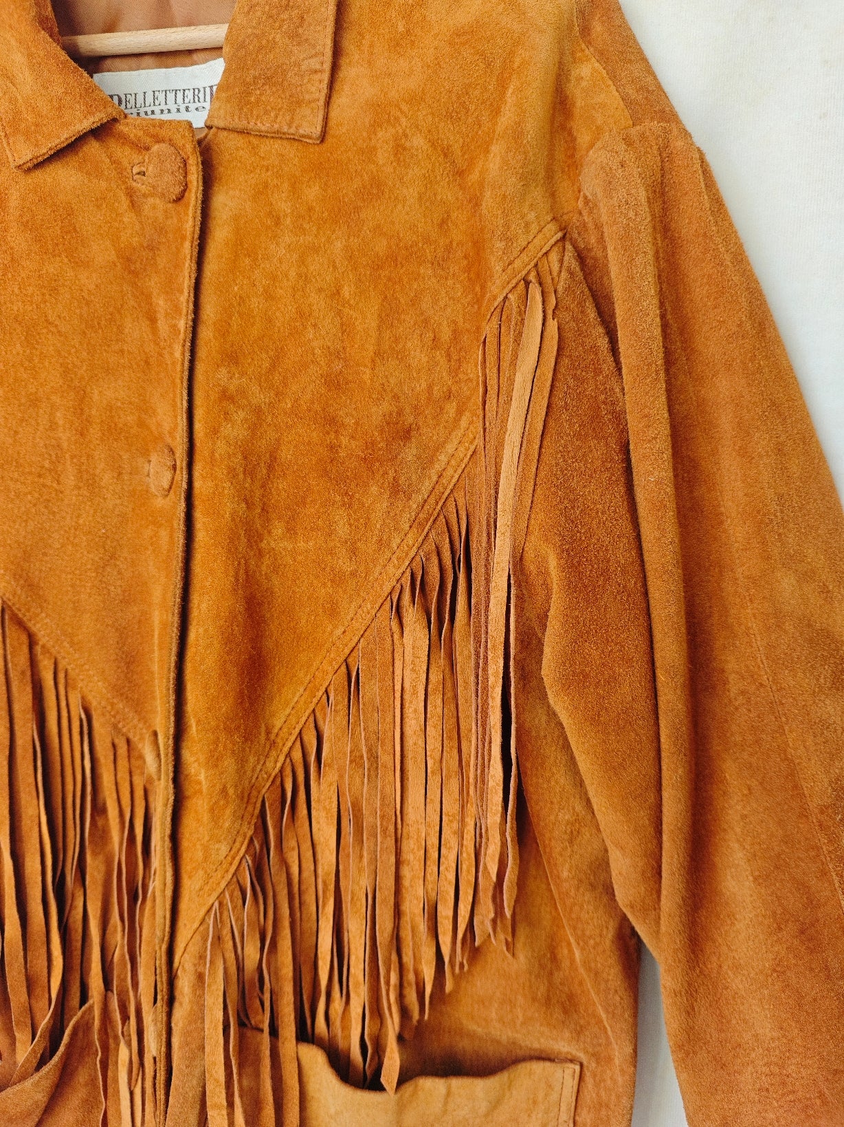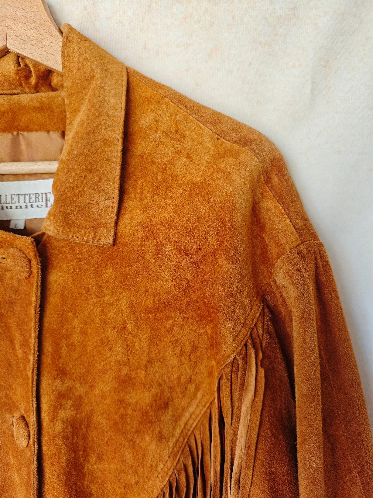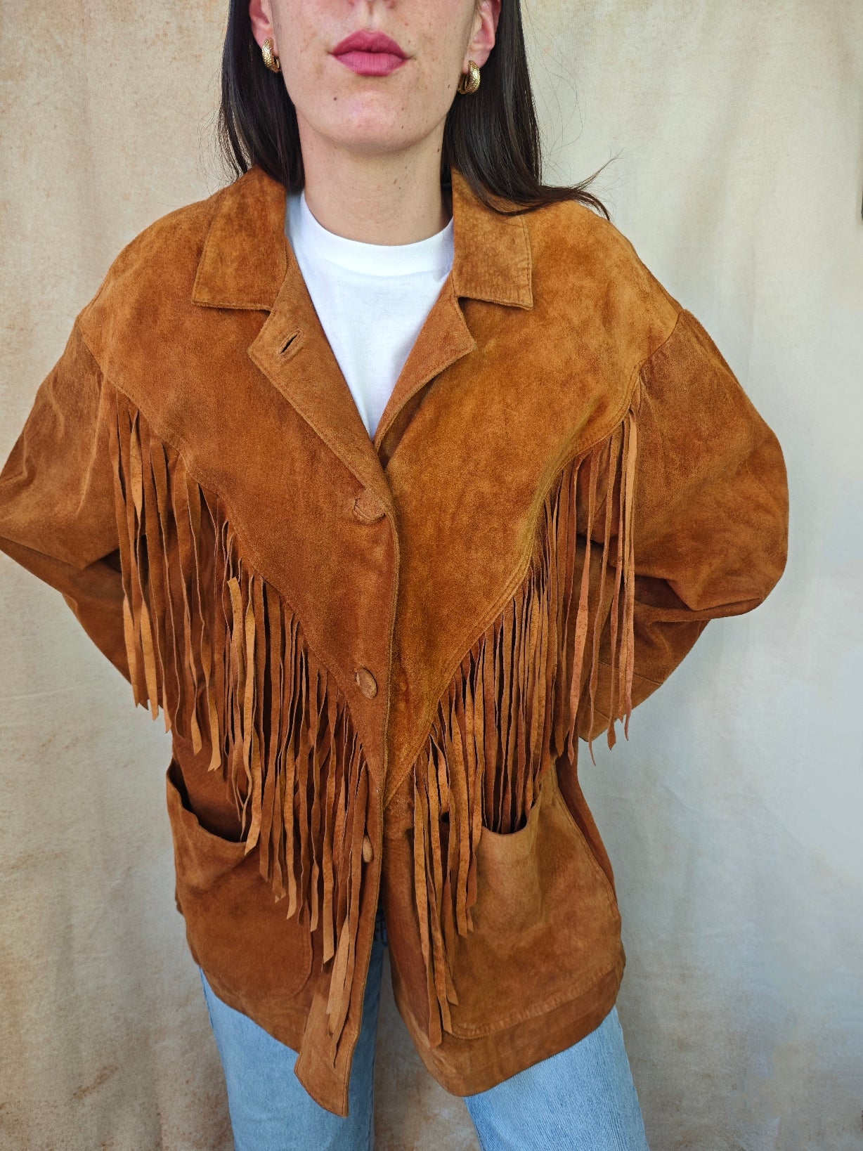 Iconica giacca in vero camoscio color cuoio caldo, impreziosita da lunghe frange in pelle sul davanti e sul retro. Modello oversize dal taglio morbido, con chiusura a bottoni rivestiti e tasche laterali.