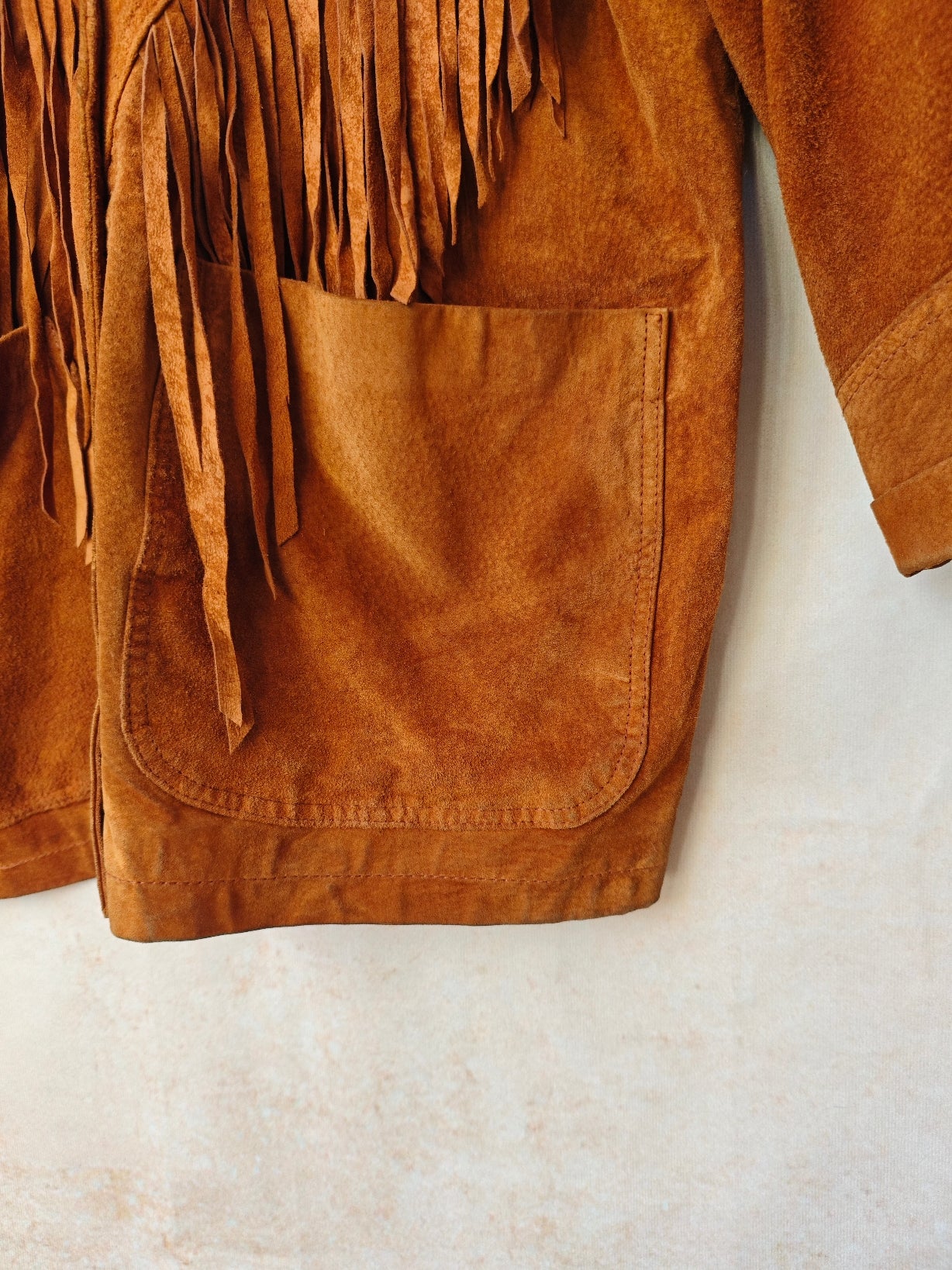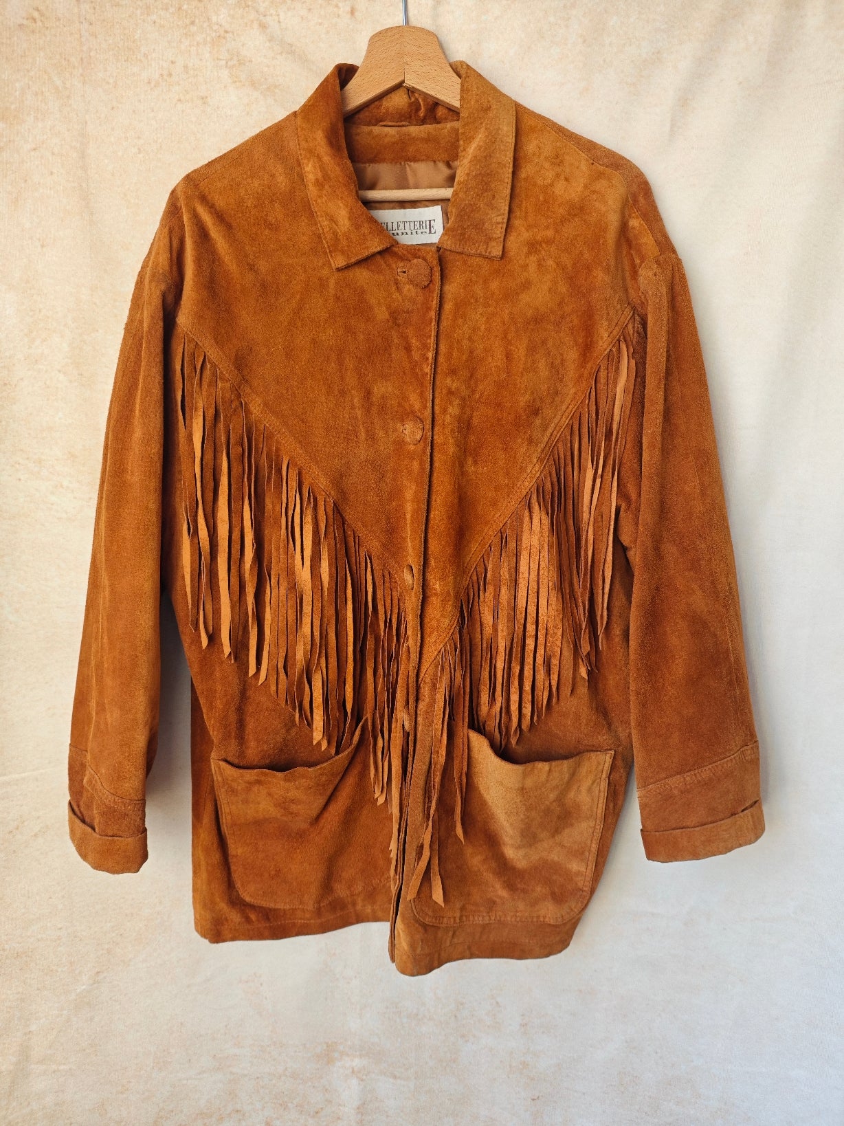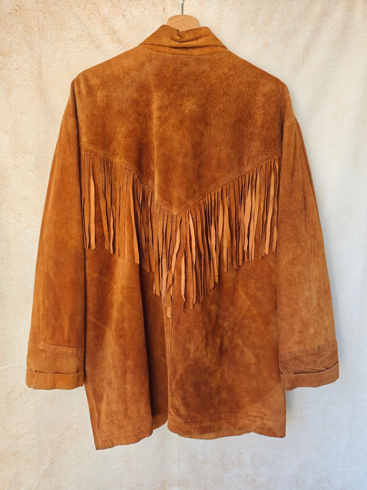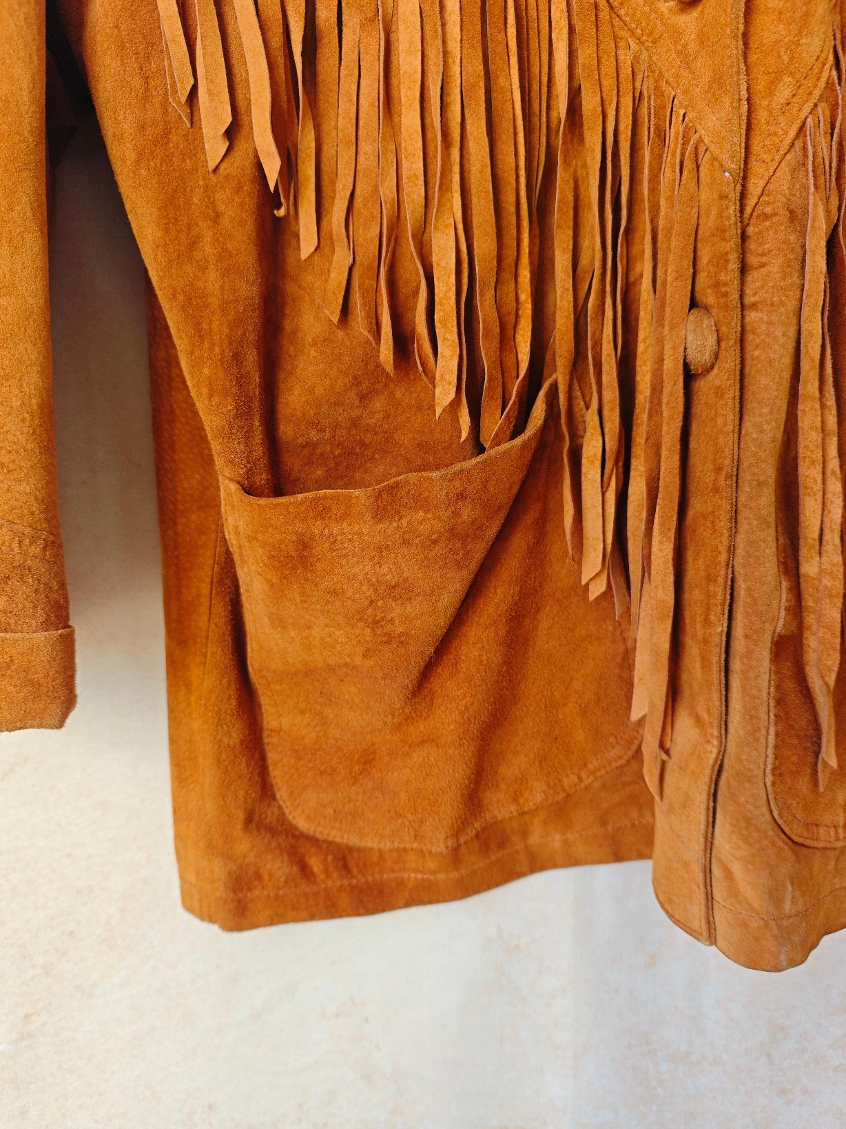 Iconica giacca in vero camoscio color cuoio caldo, impreziosita da lunghe frange in pelle sul davanti e sul retro. Modello oversize dal taglio morbido, con chiusura a bottoni rivestiti e tasche laterali.