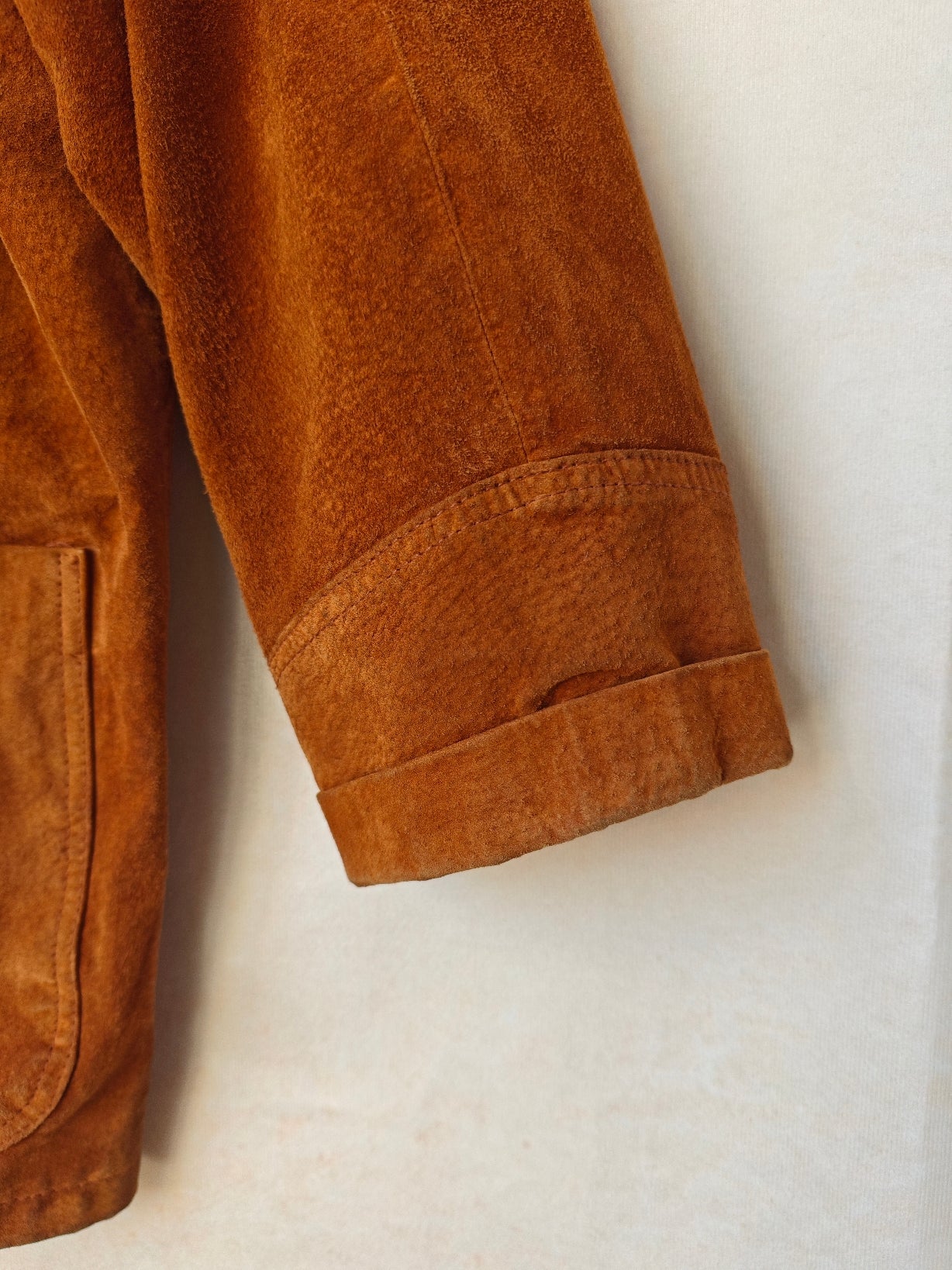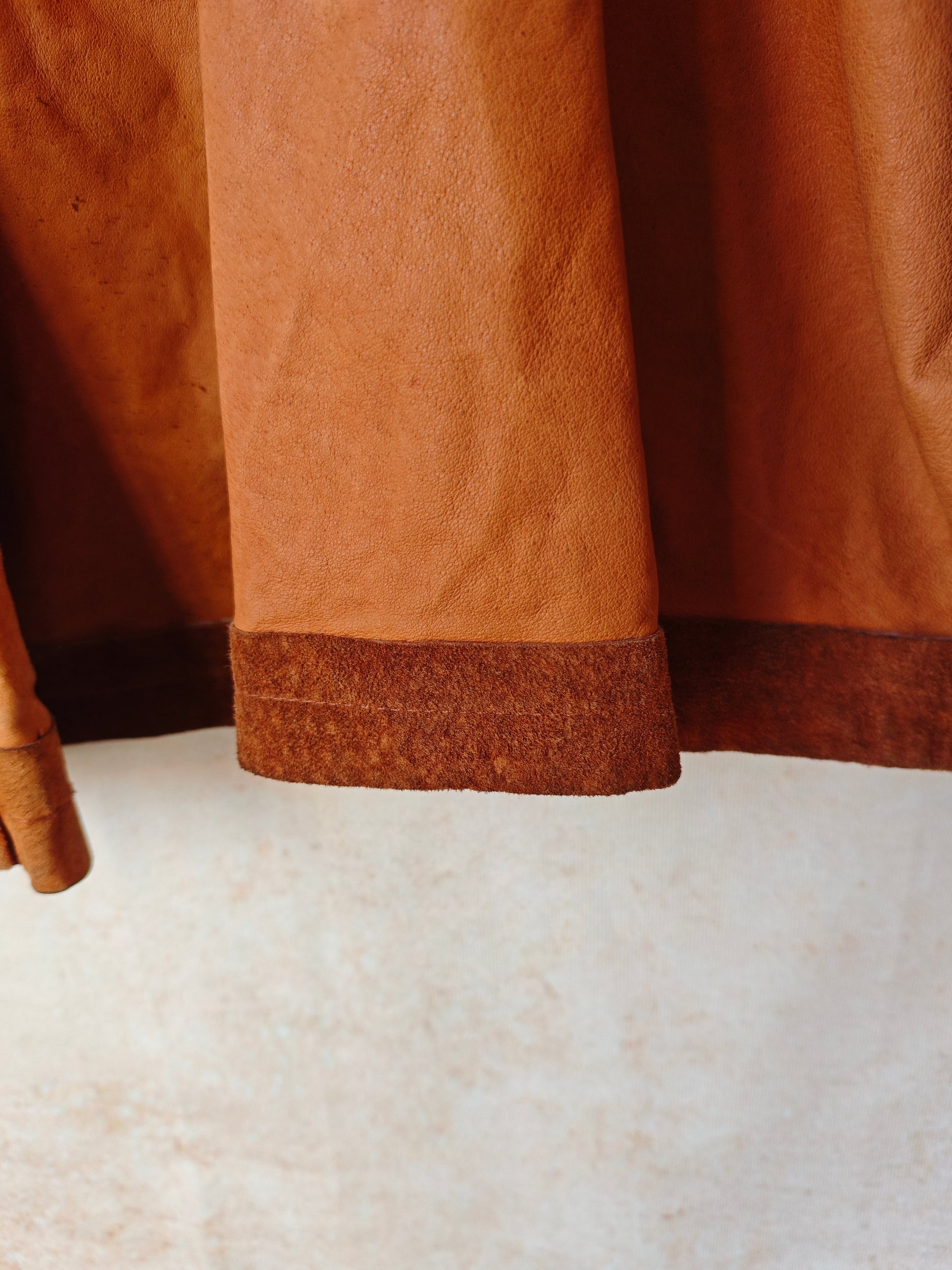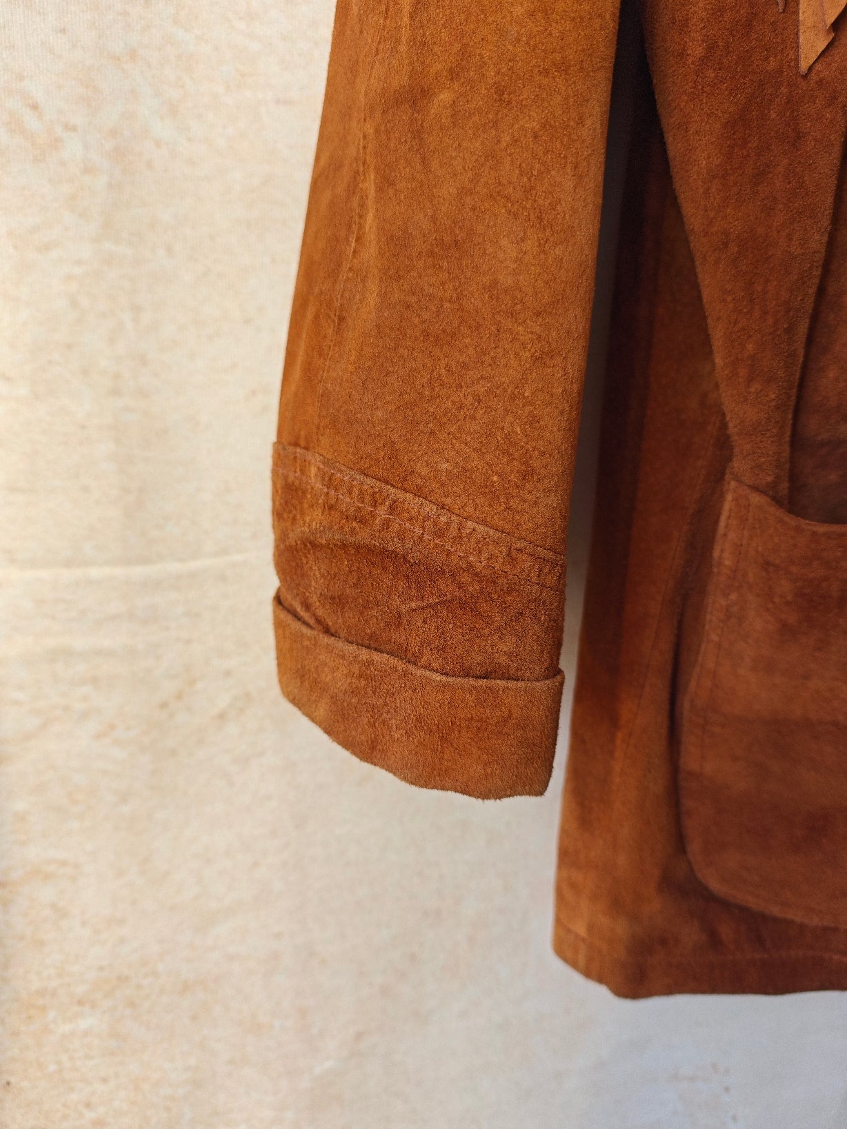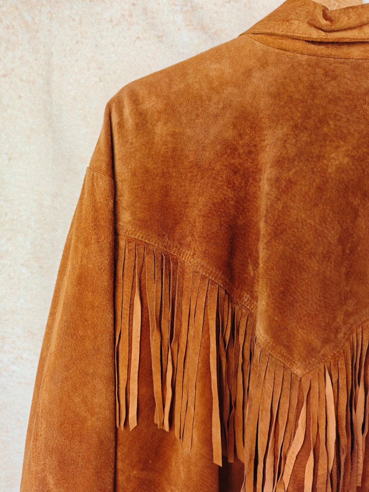 Iconica giacca in vero camoscio color cuoio caldo, impreziosita da lunghe frange in pelle sul davanti e sul retro. Modello oversize dal taglio morbido, con chiusura a bottoni rivestiti e tasche laterali.