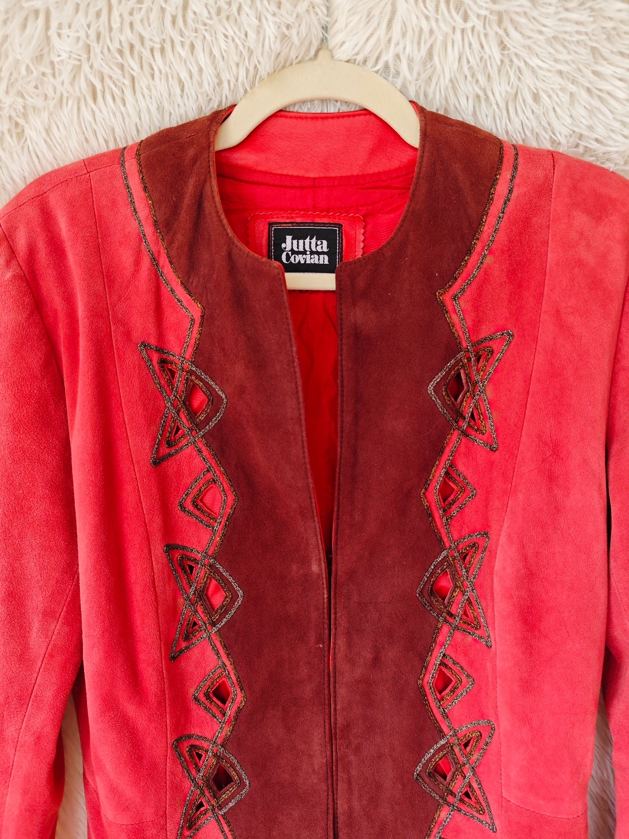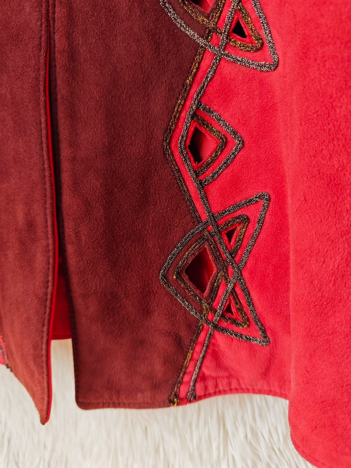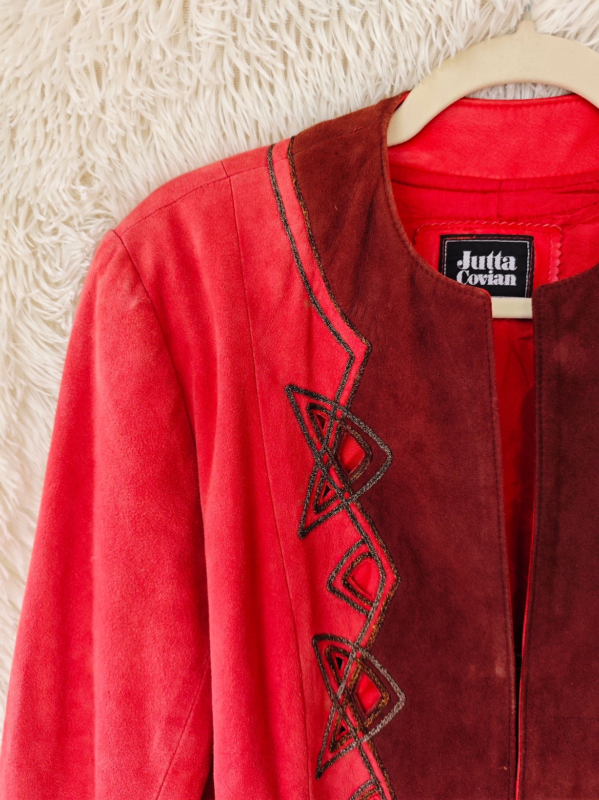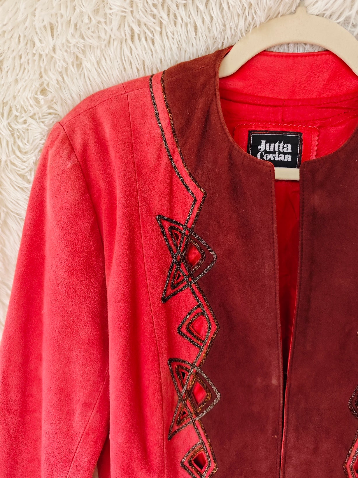 Giacca vintage Jutta Covian in morbido camoscio rosso con pannello centrale in tonalità più scura. Il davanti è decorato da ricami geometrici.