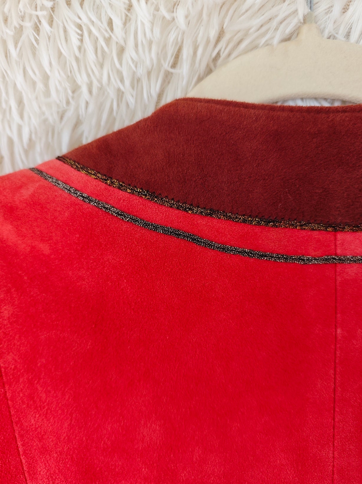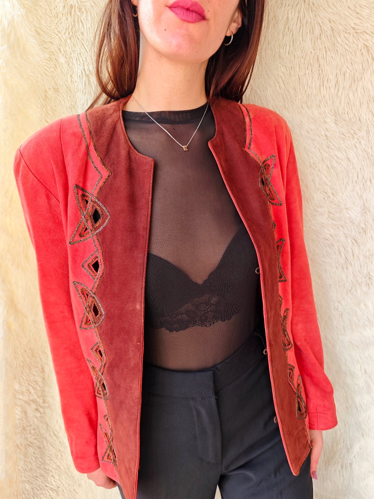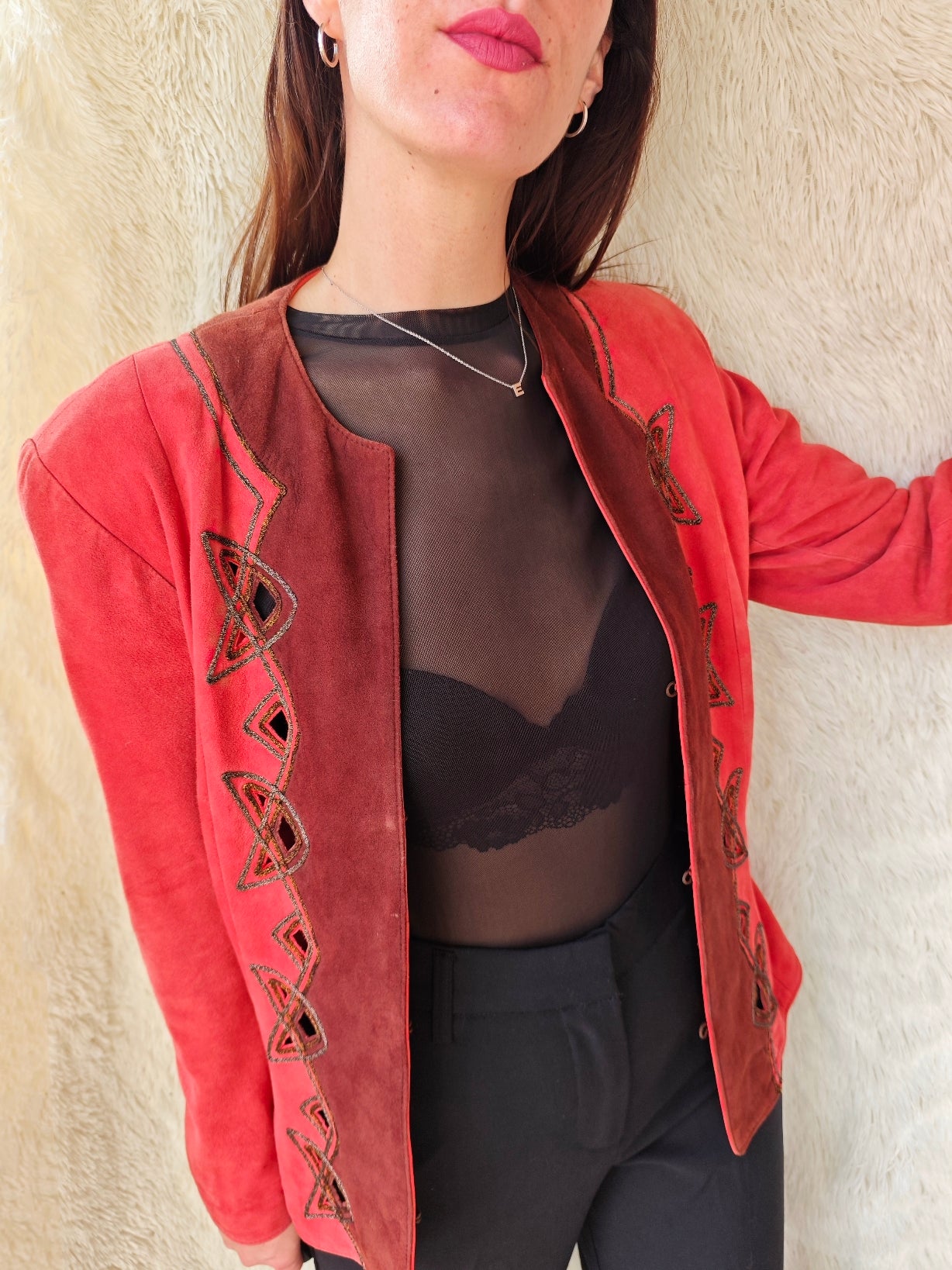 Giacca vintage Jutta Covian in morbido camoscio rosso con pannello centrale in tonalità più scura. Il davanti è decorato da ricami geometrici.