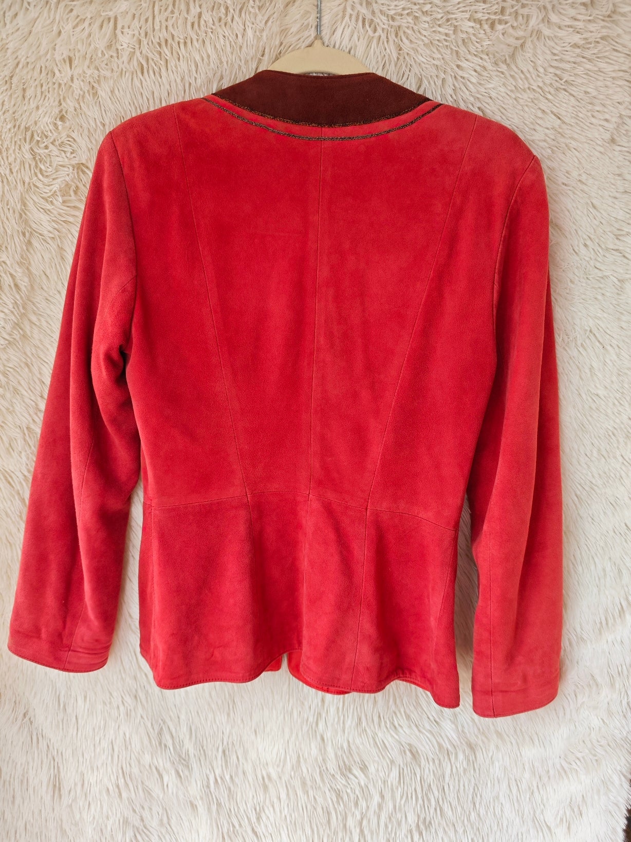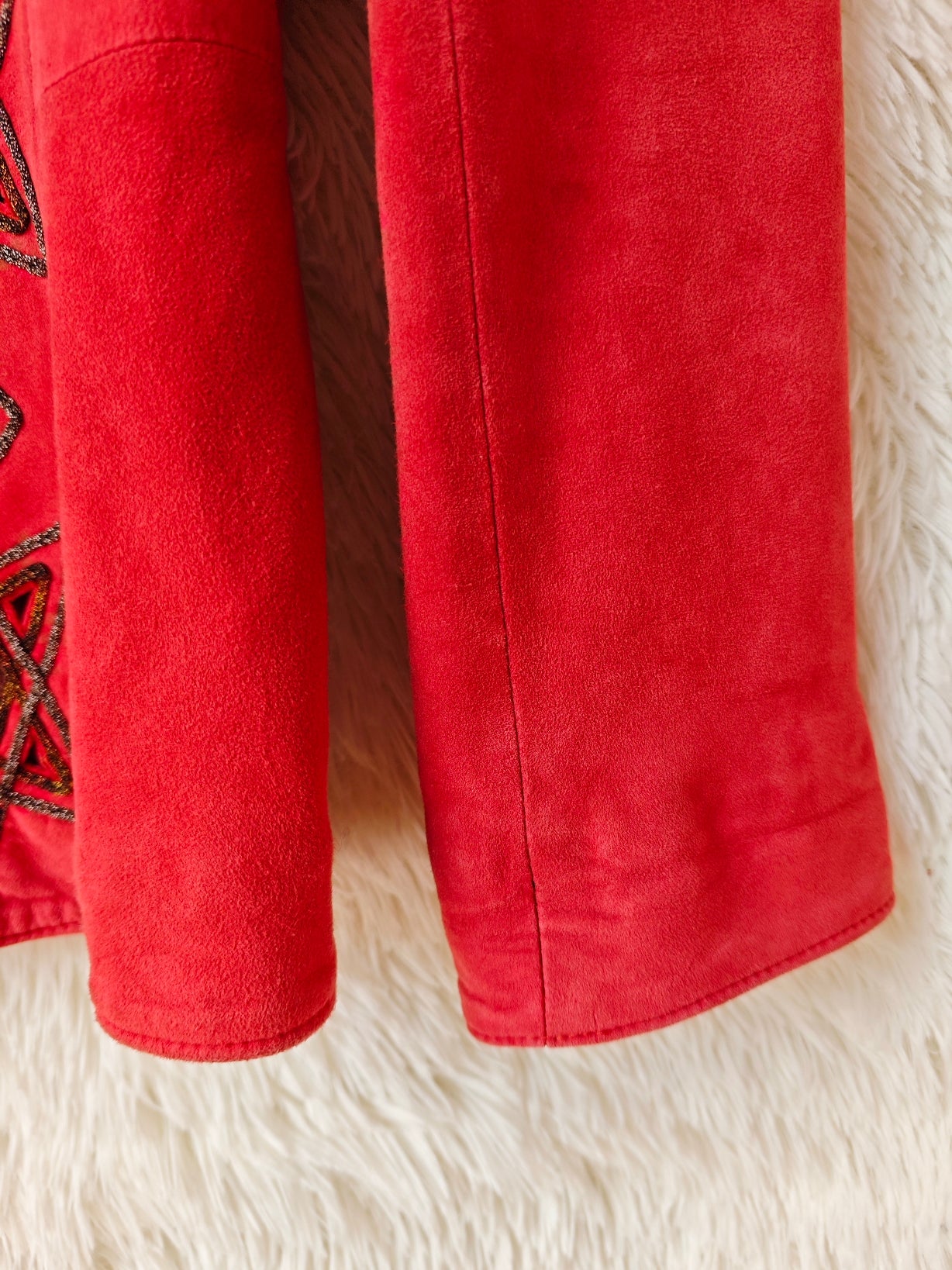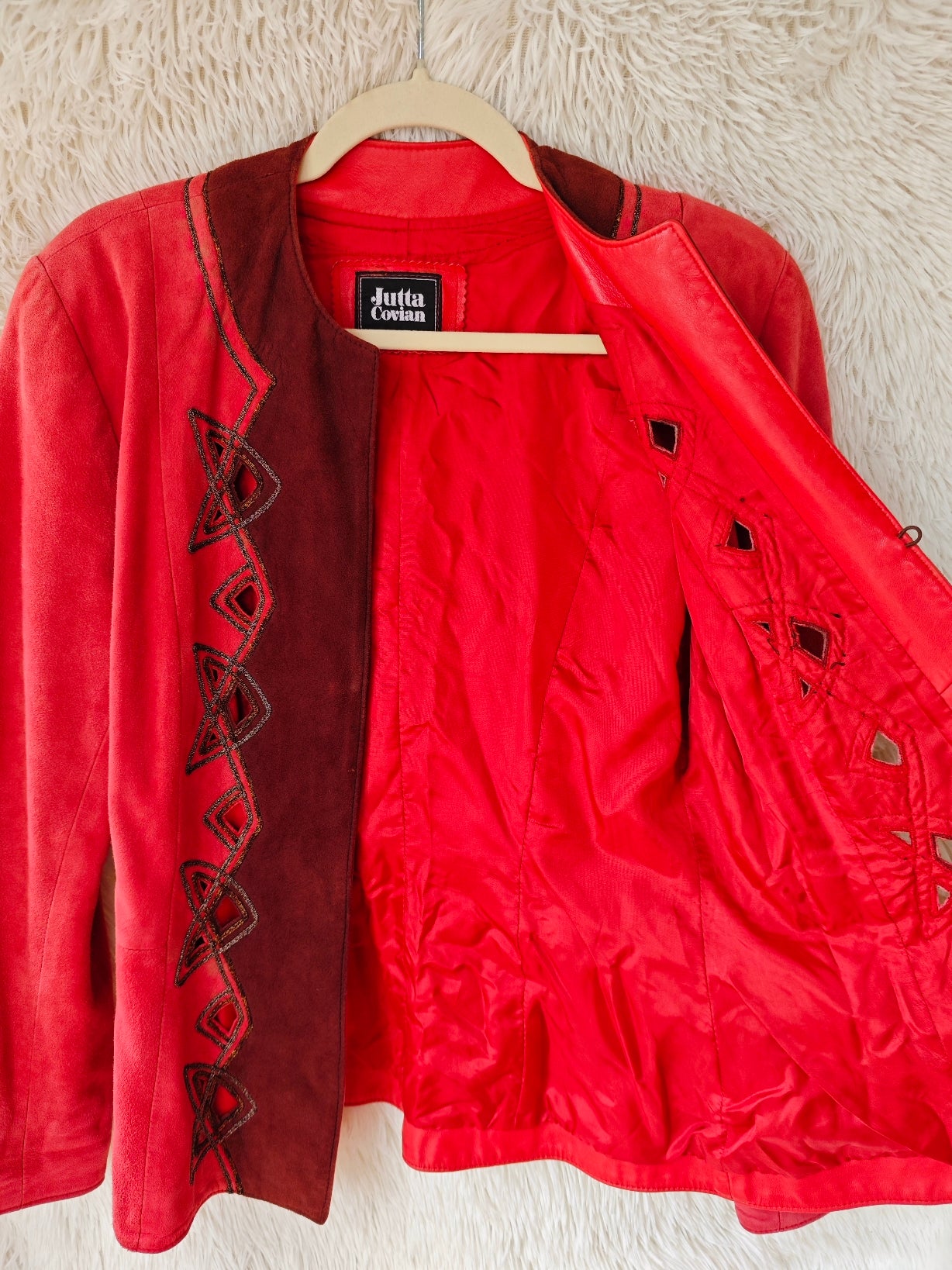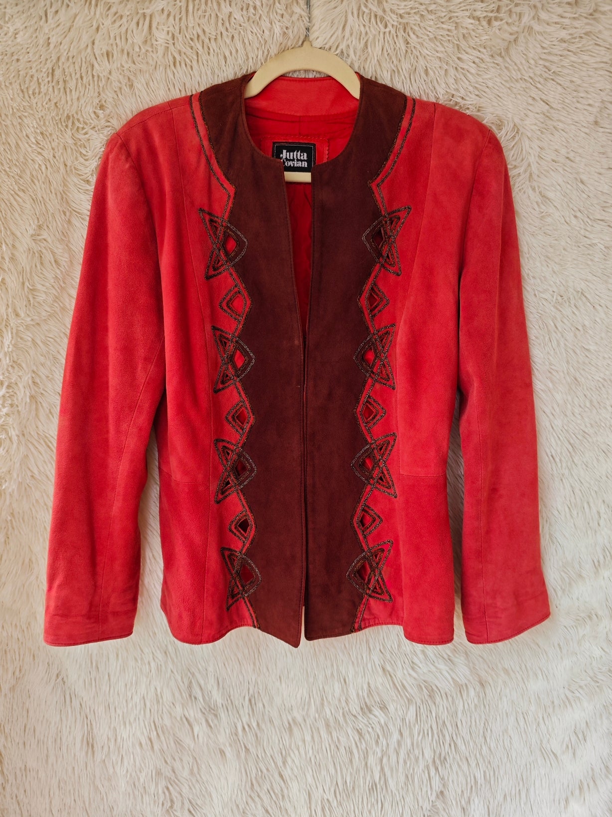Giacca vintage Jutta Covian in morbido camoscio rosso con pannello centrale in tonalità più scura. Il davanti è decorato da ricami geometrici.
