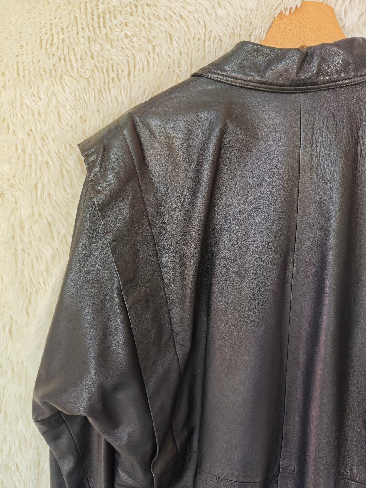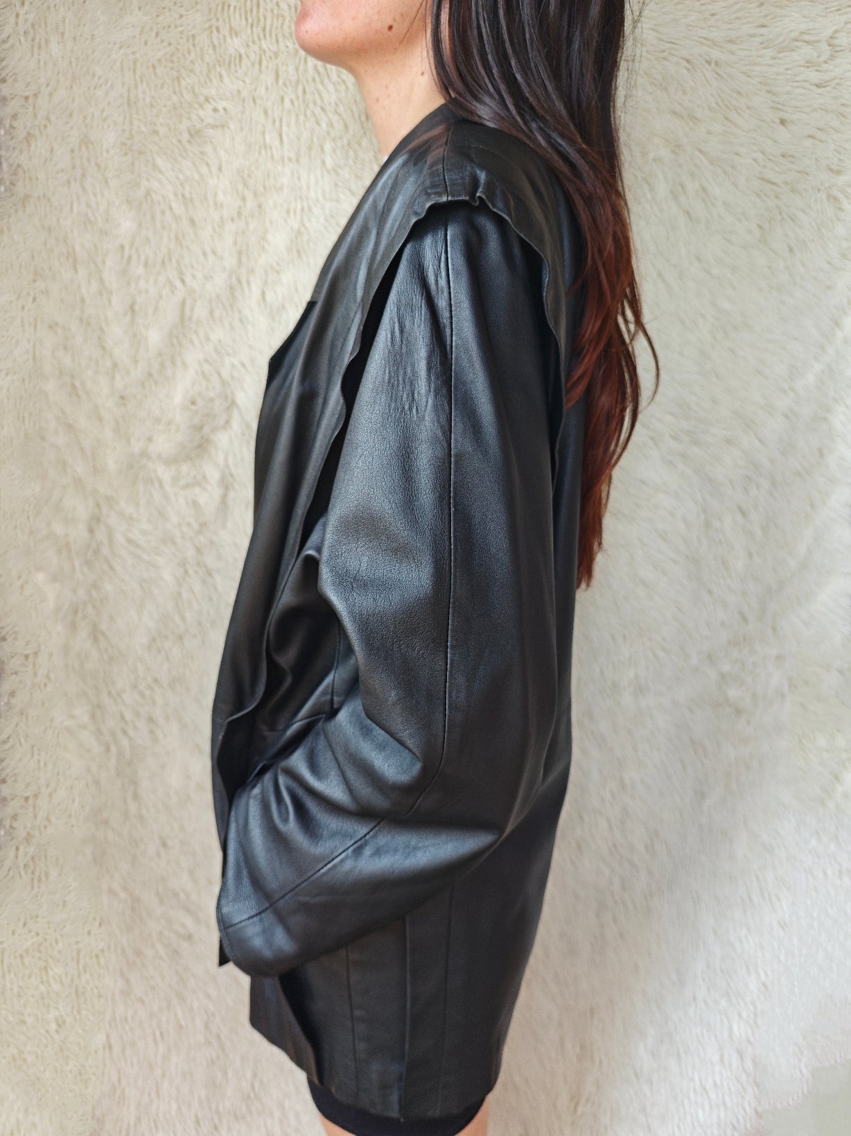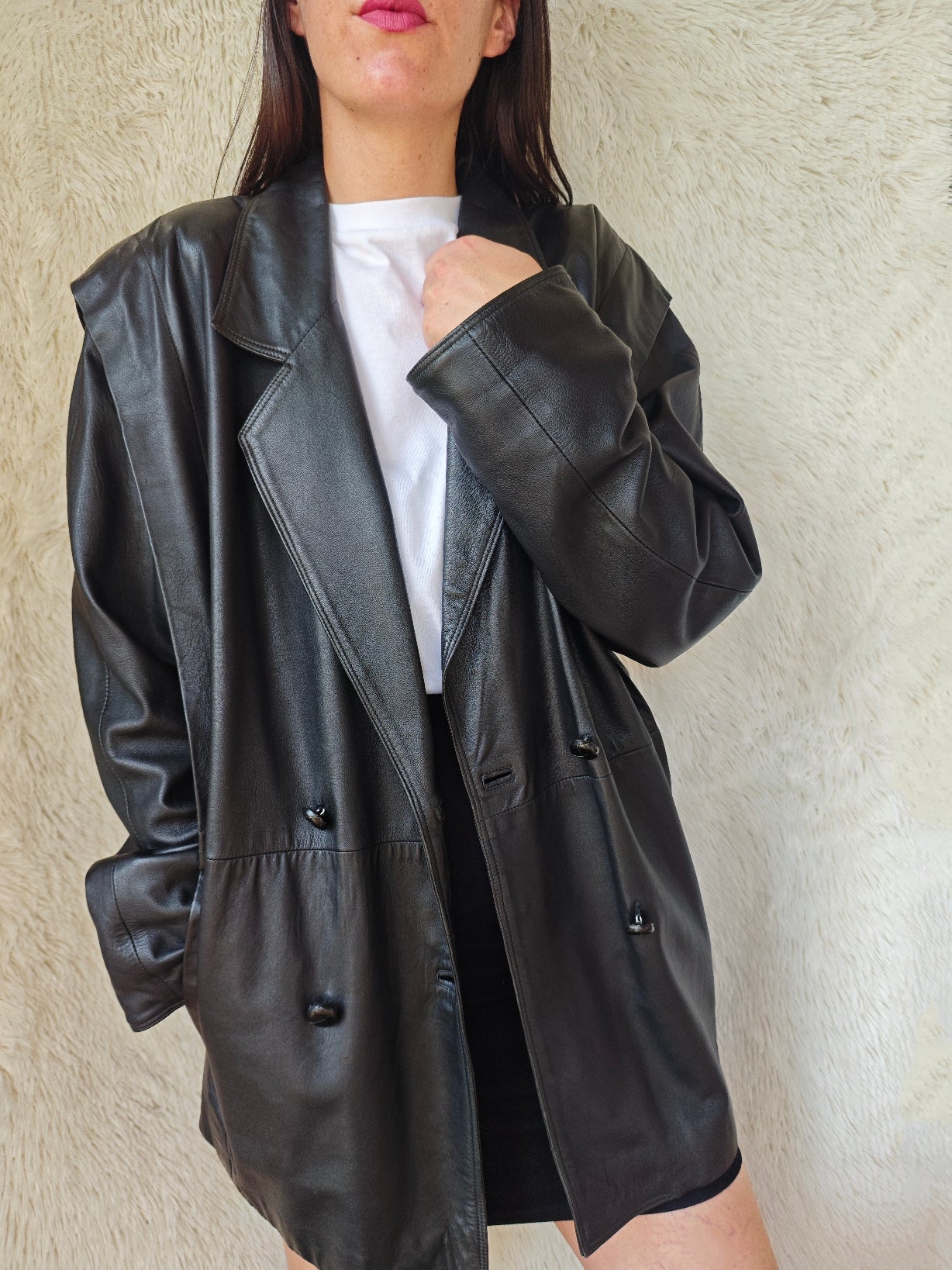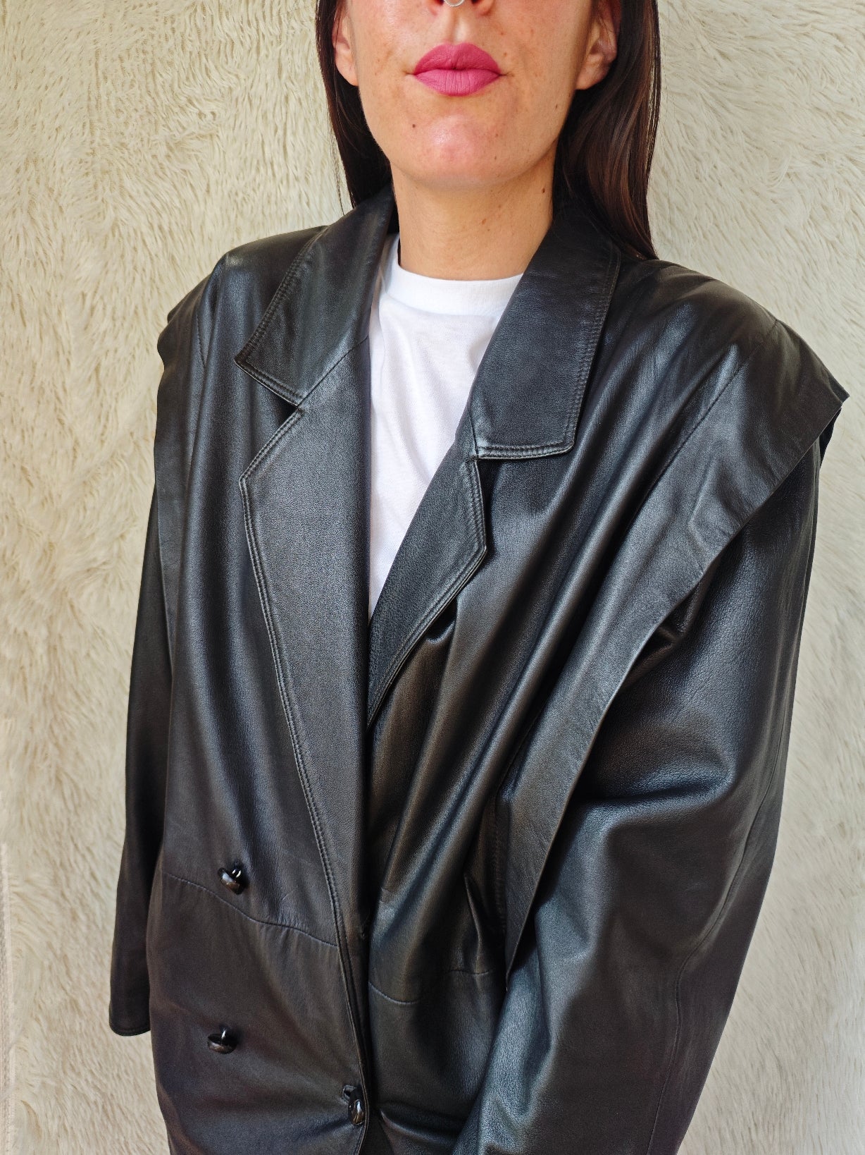 Giacca nera oversize anni ’80/’90 in vera pelle, morbidissima e di qualità eccellente.