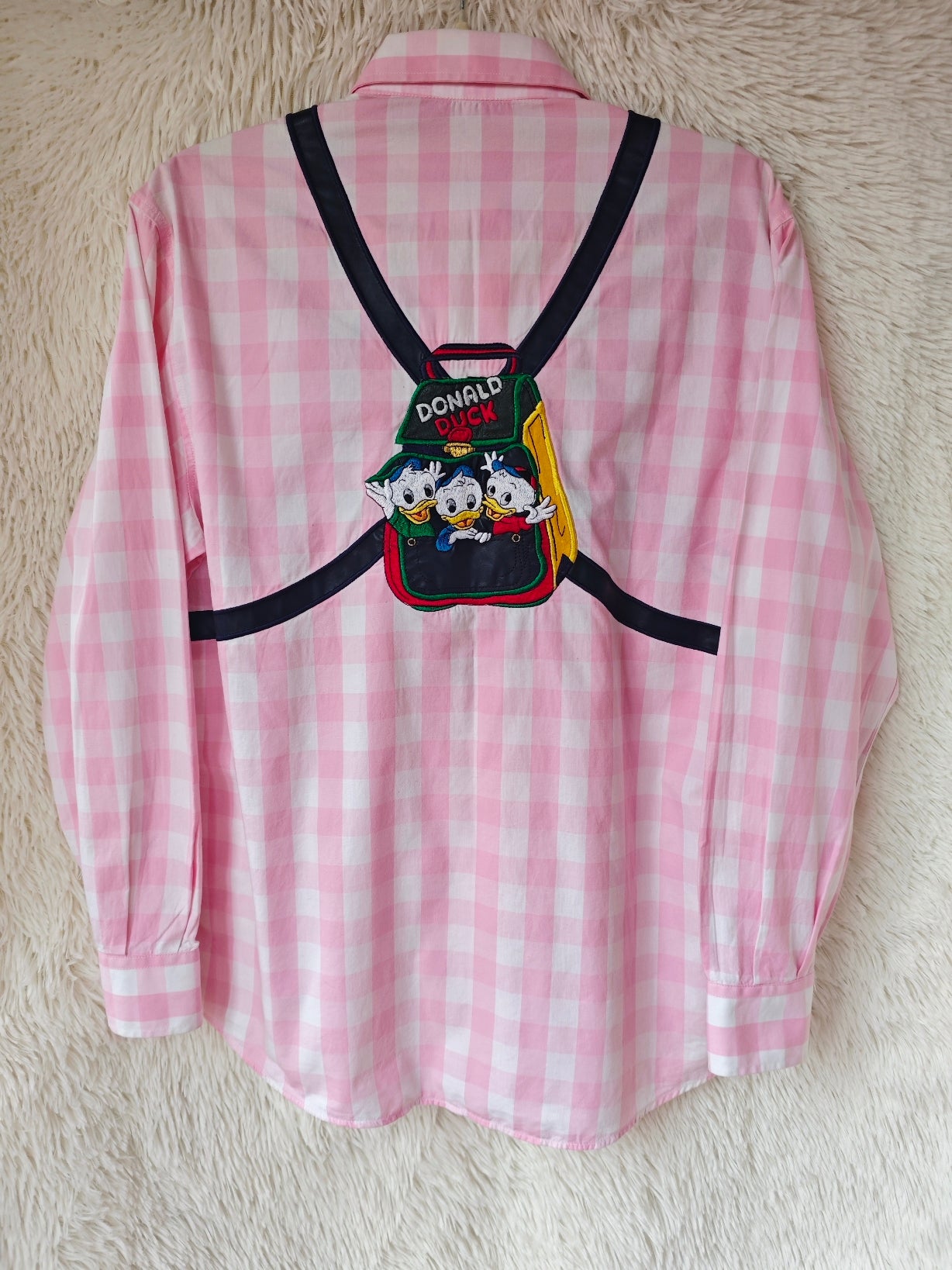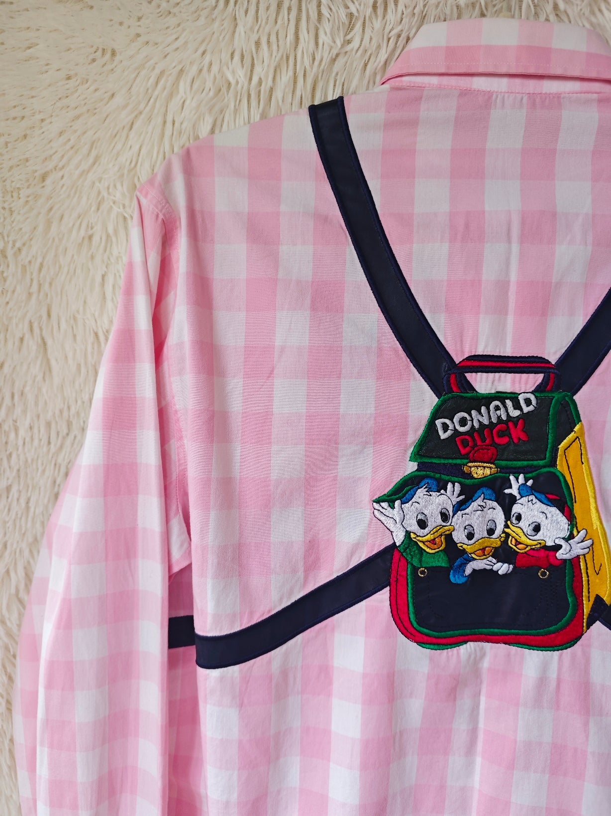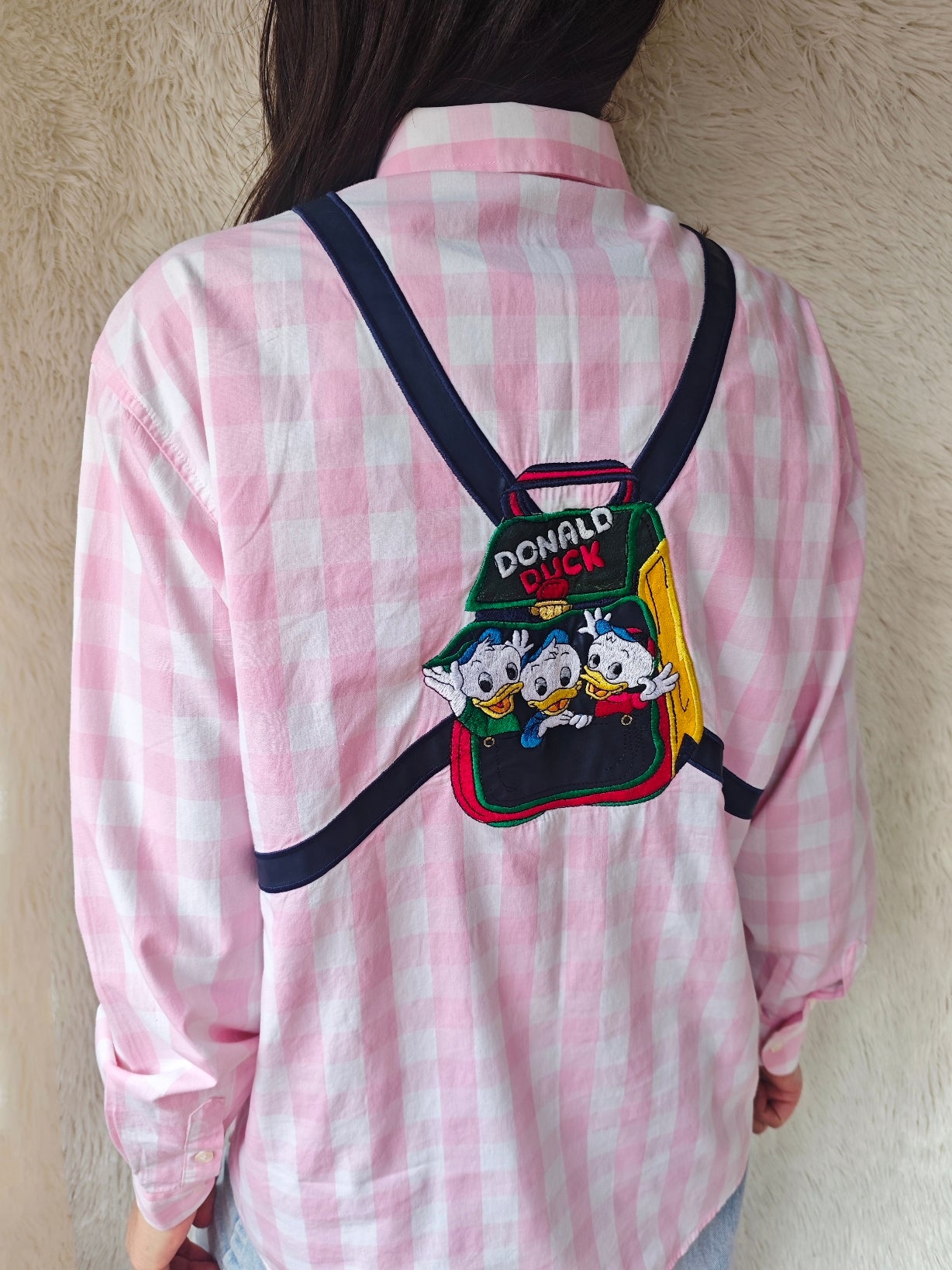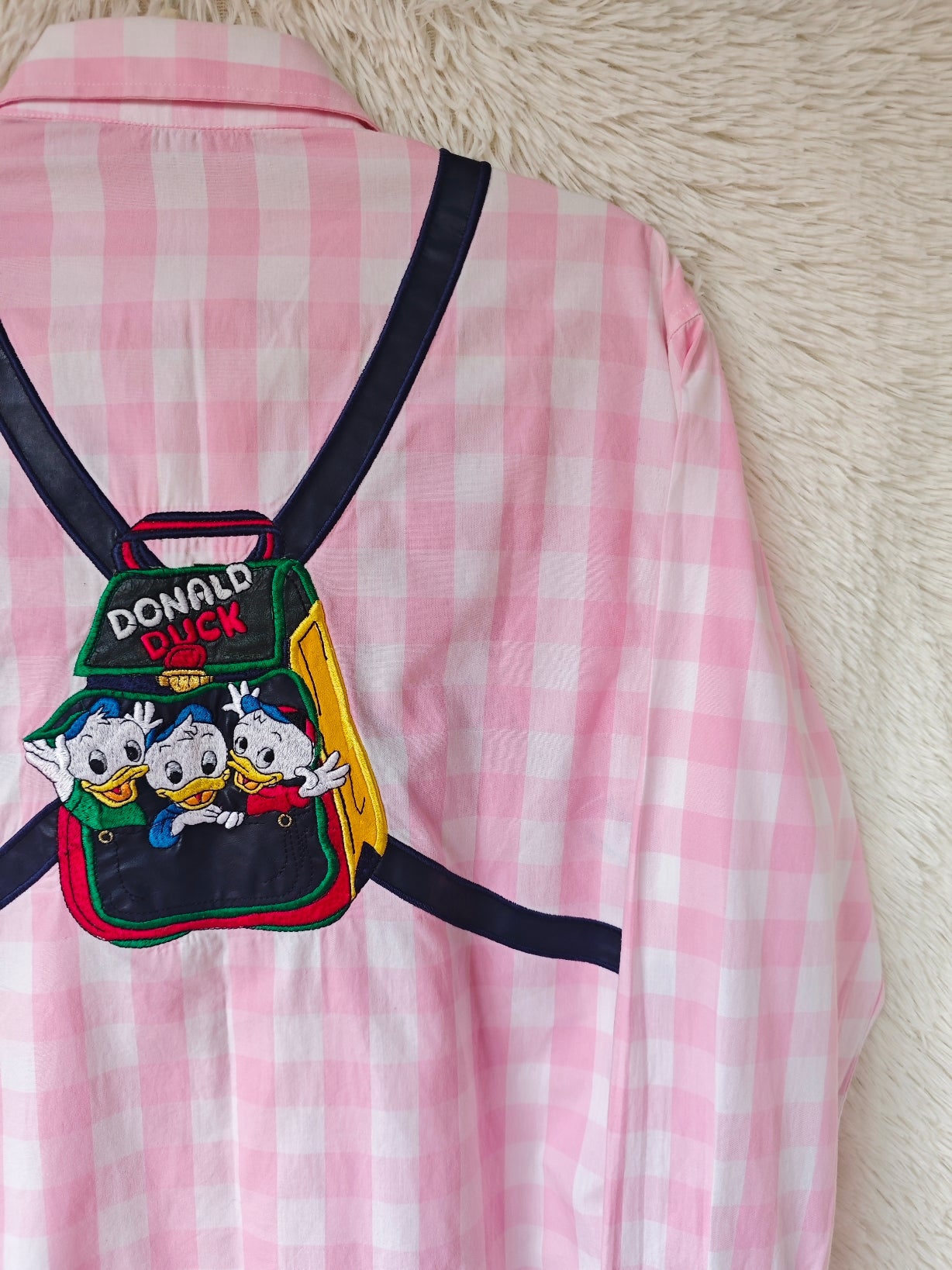 Sul retro, un grande ricamo raffigura i tre nipotini che spuntano da uno zainetto con la scritta “Donald Duck”.