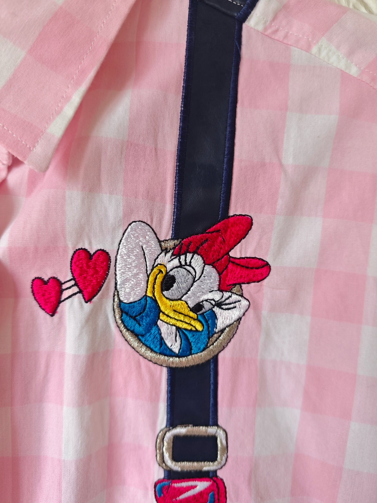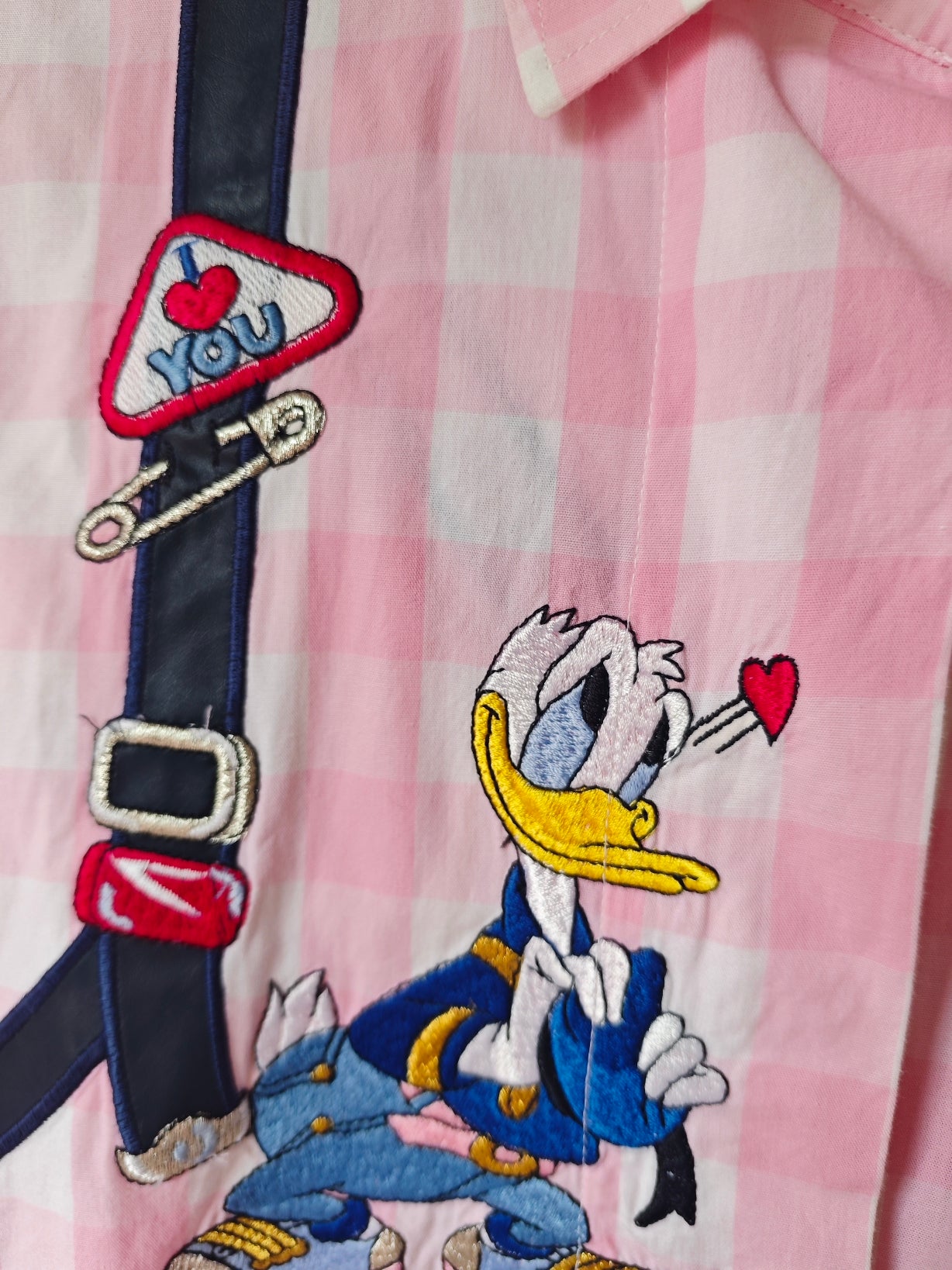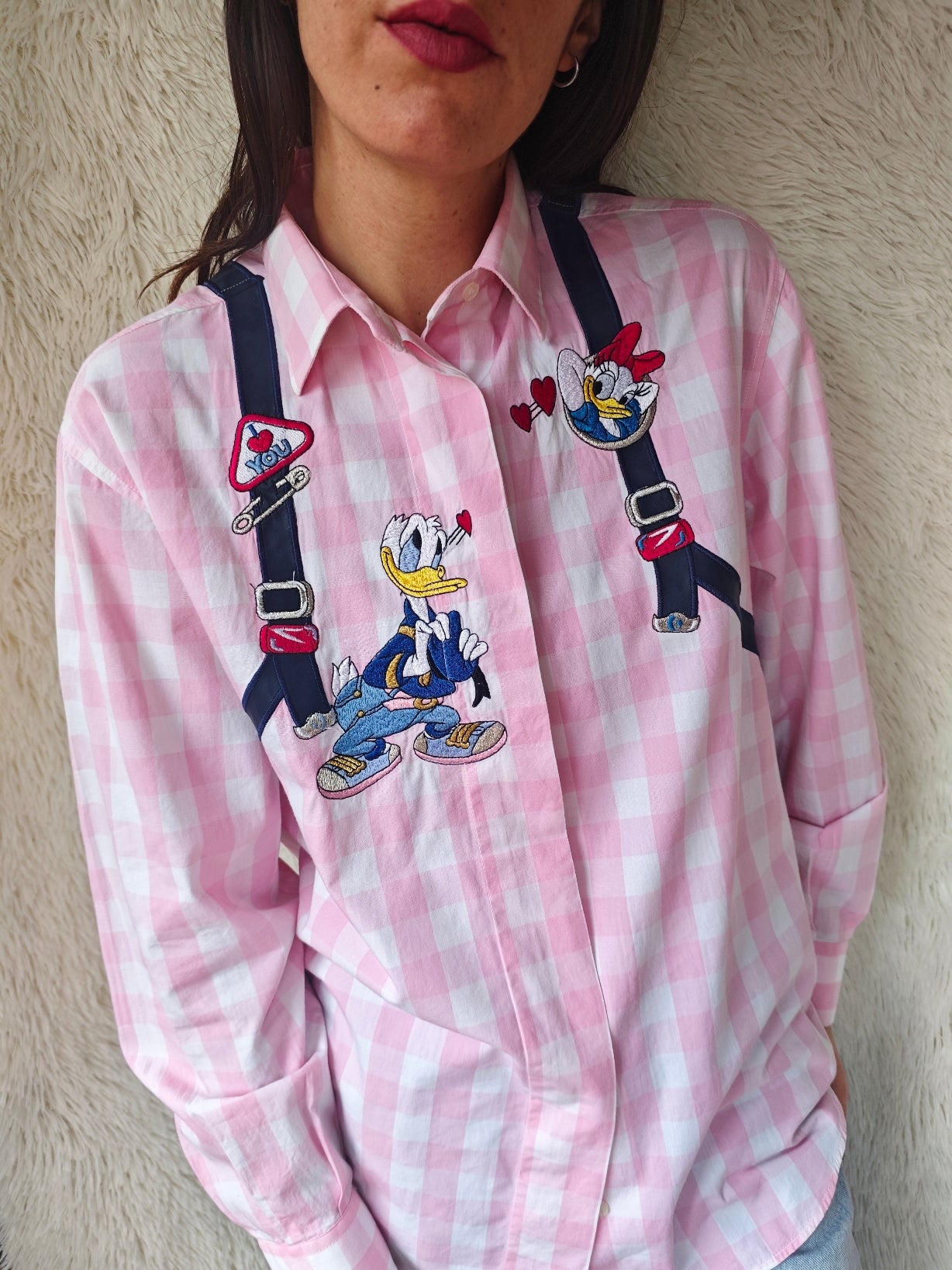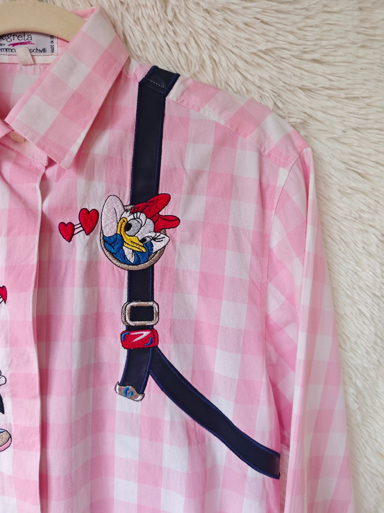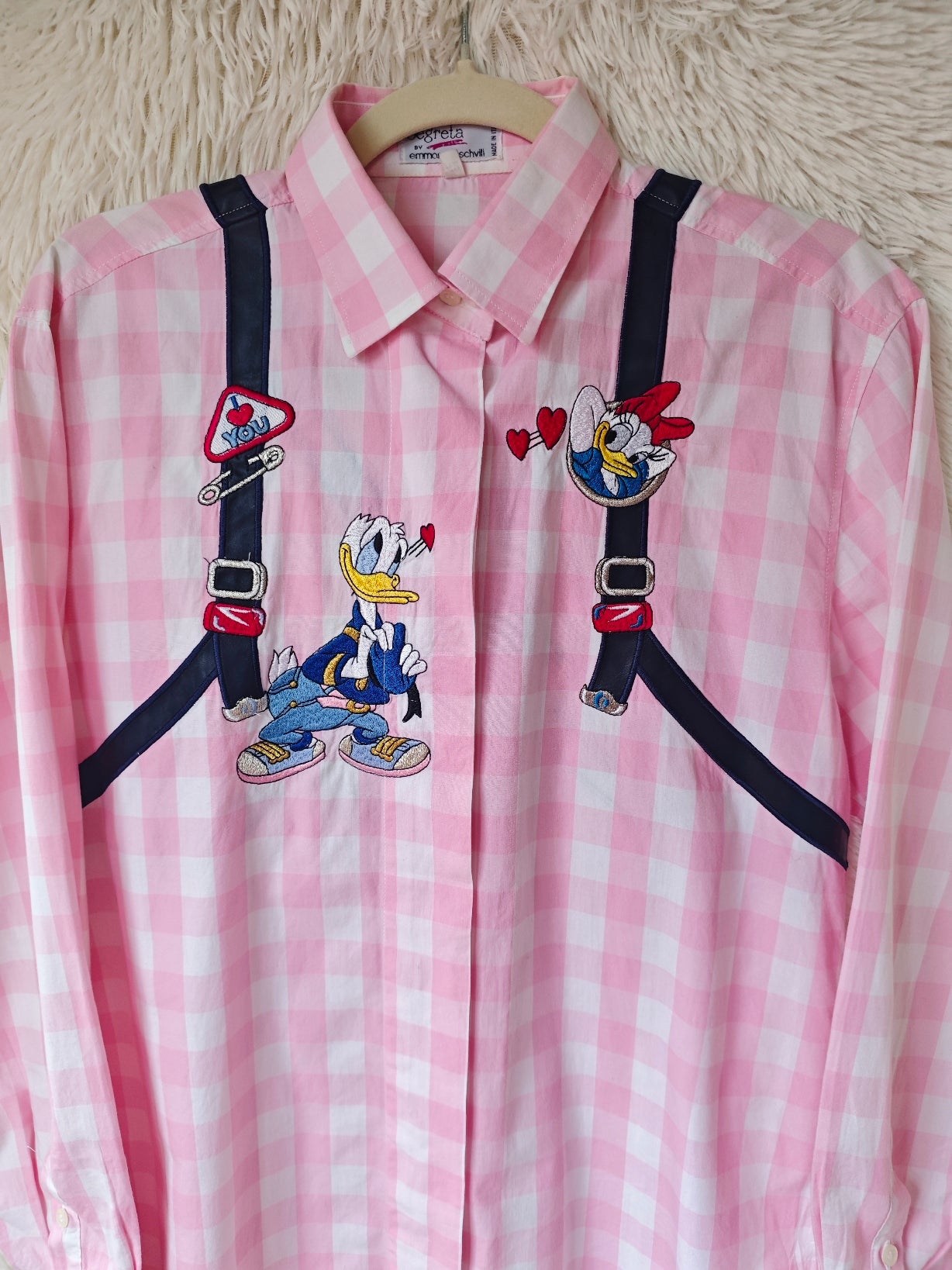 Sul davanti presenta Paperino in pose divertenti, con dettagli come bretelle ricamate e cuoricini rossi.