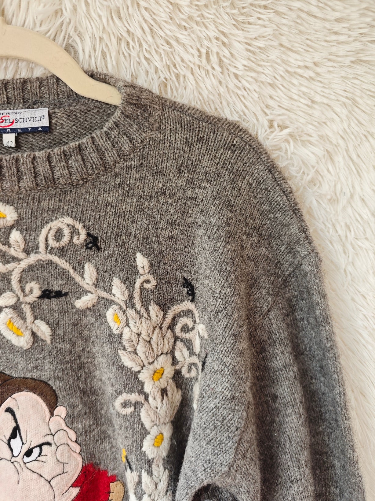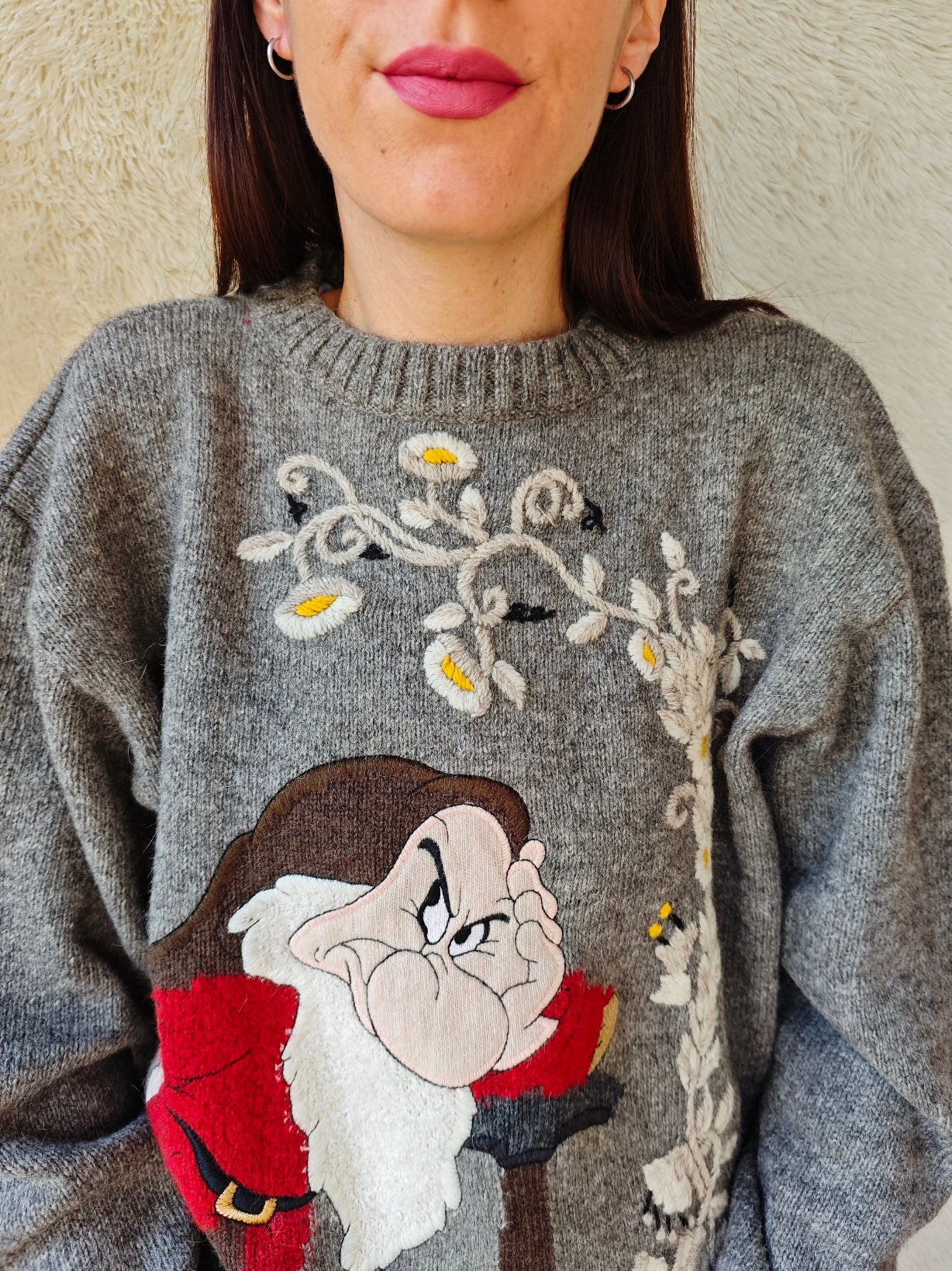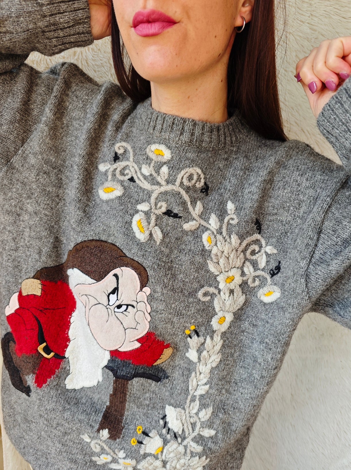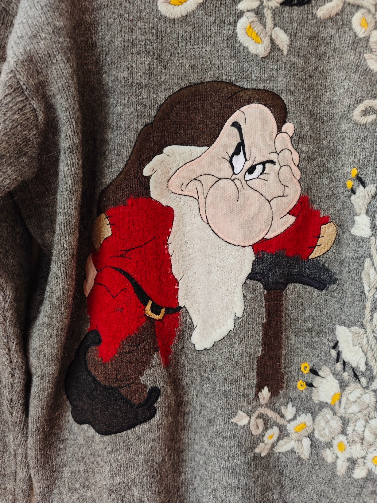 Modello girocollo con ricamo frontale raffigurante Brontolo, realizzato con grande attenzione ai dettagli, incorniciato da raffinati motivi floreali ricamati, con fiori delicati nei toni del bianco e giallo.