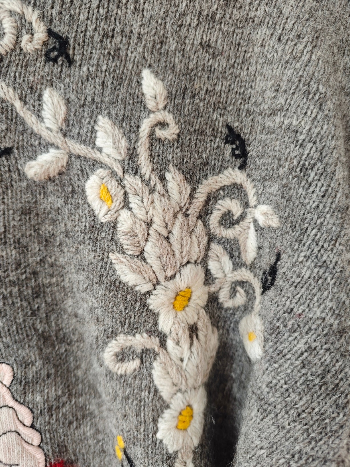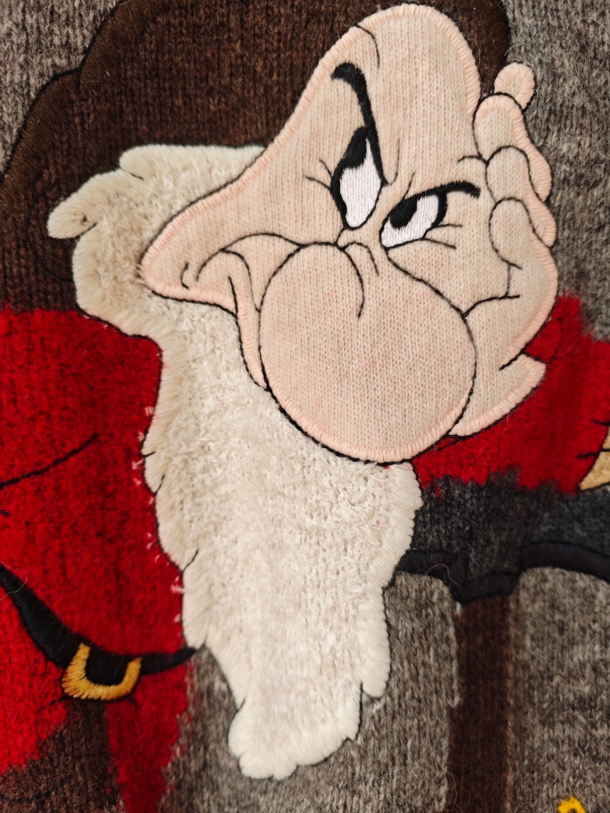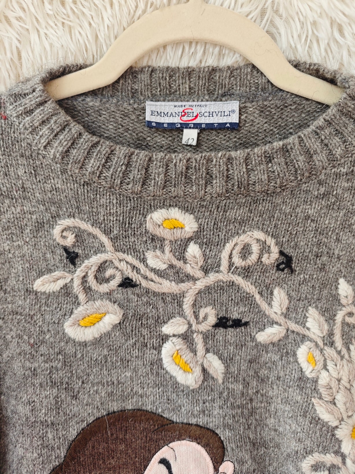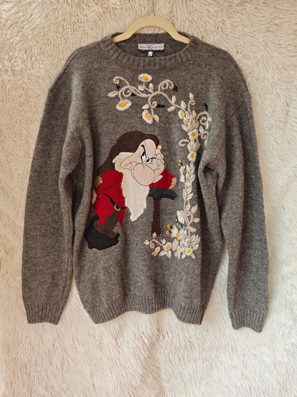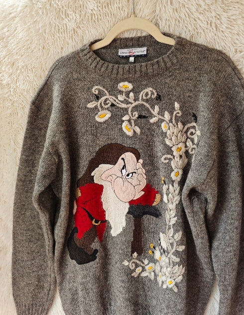Modello girocollo con ricamo frontale raffigurante Brontolo, realizzato con grande attenzione ai dettagli, incorniciato da raffinati motivi floreali ricamati, con fiori delicati nei toni del bianco e giallo.