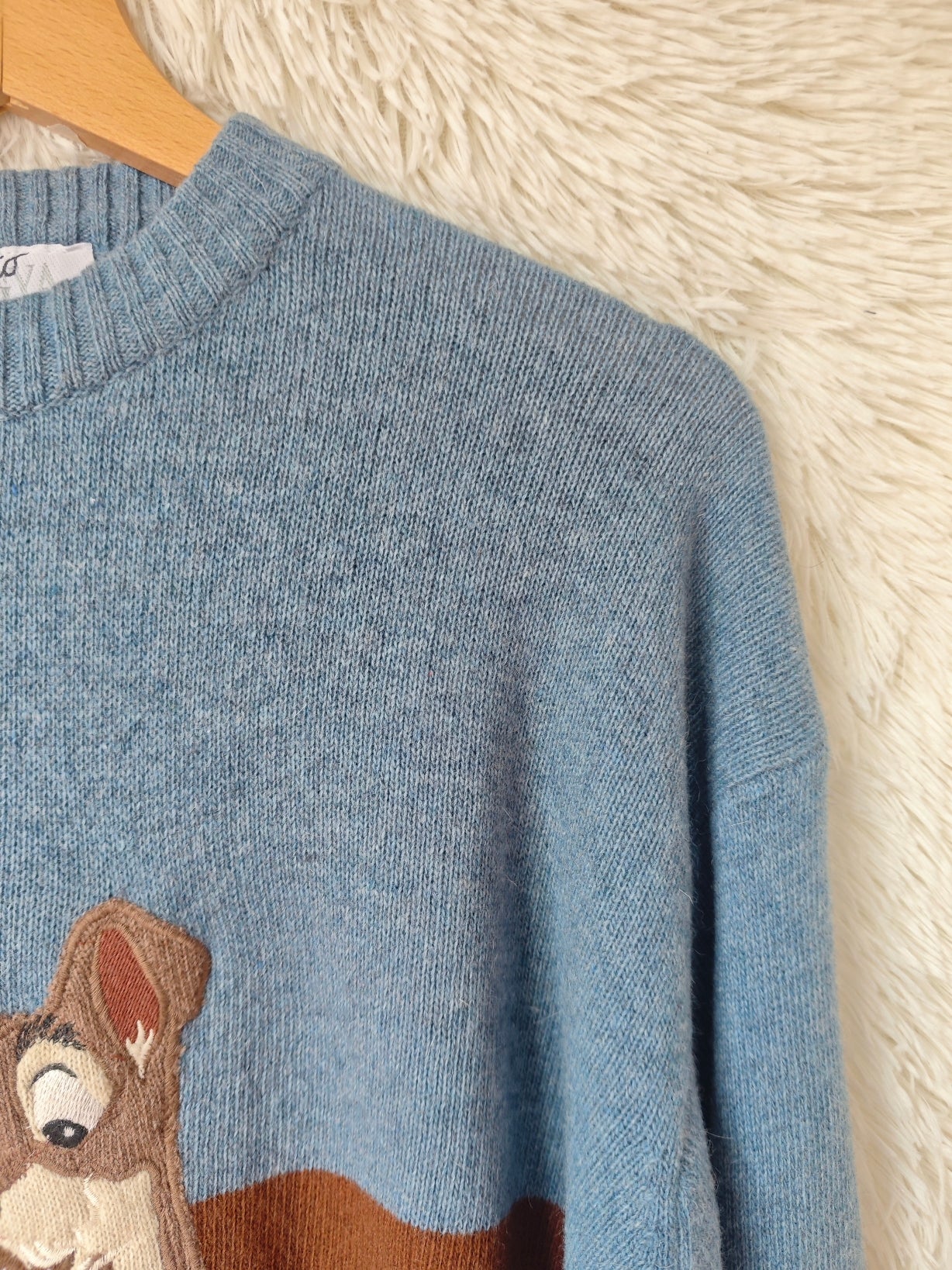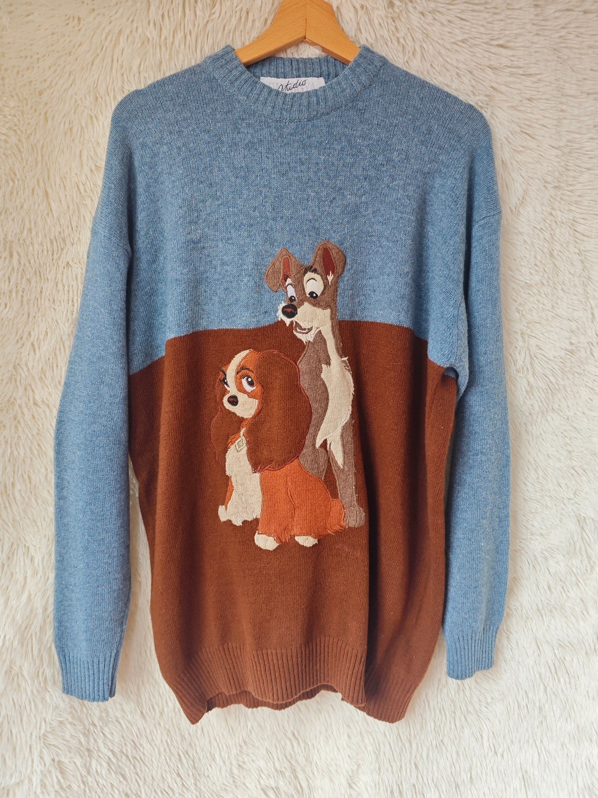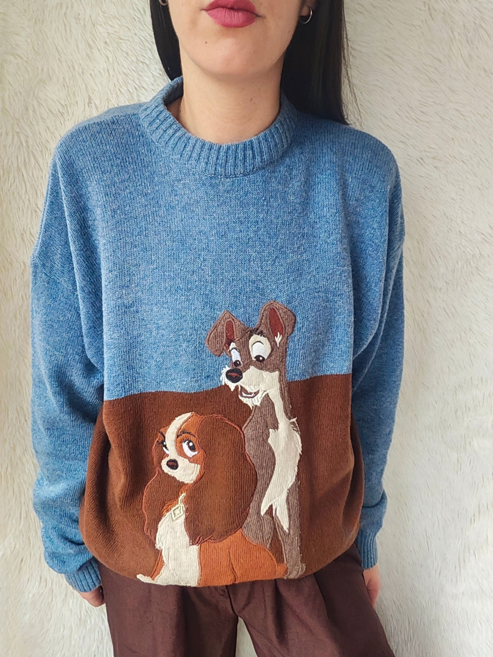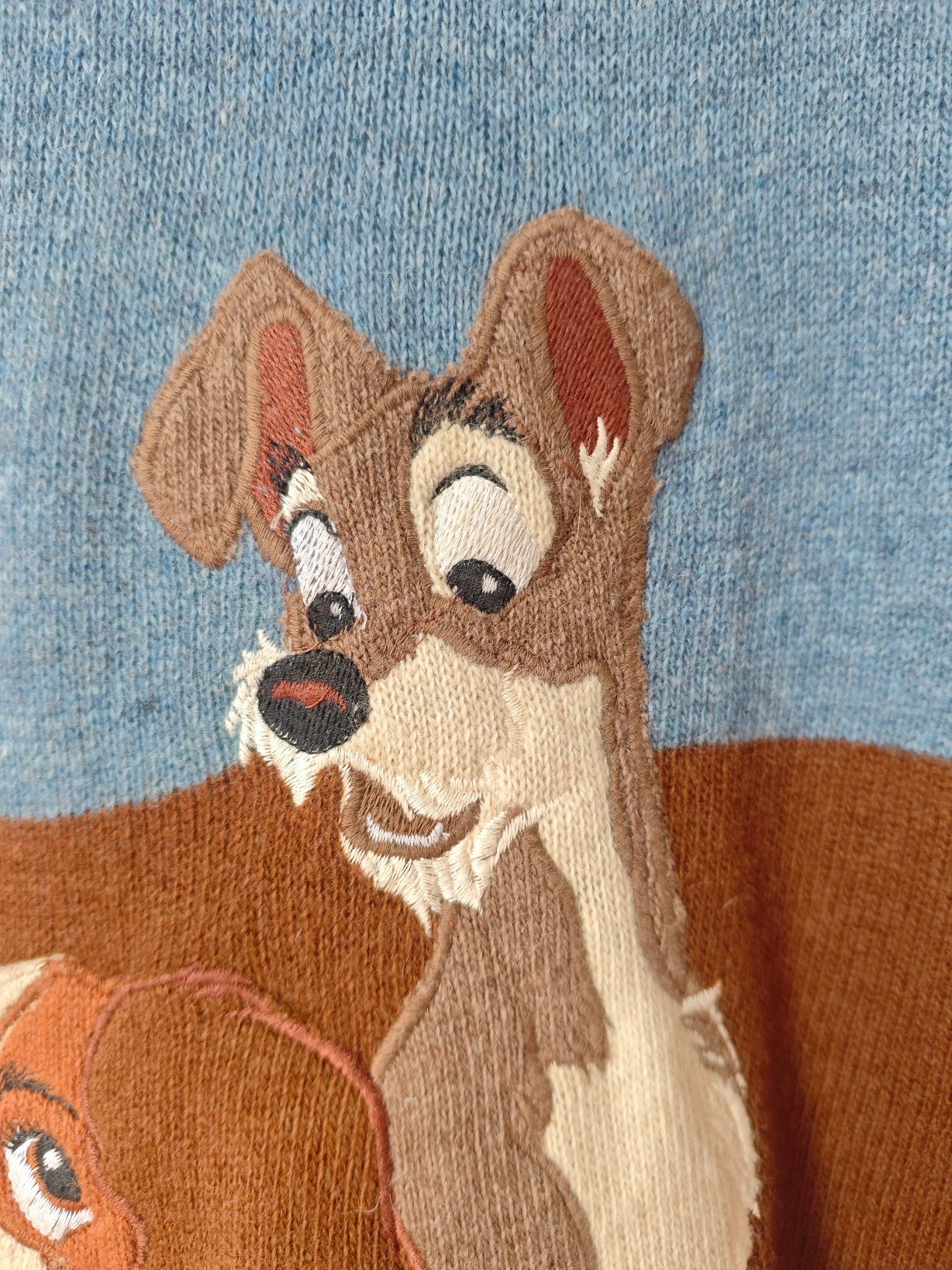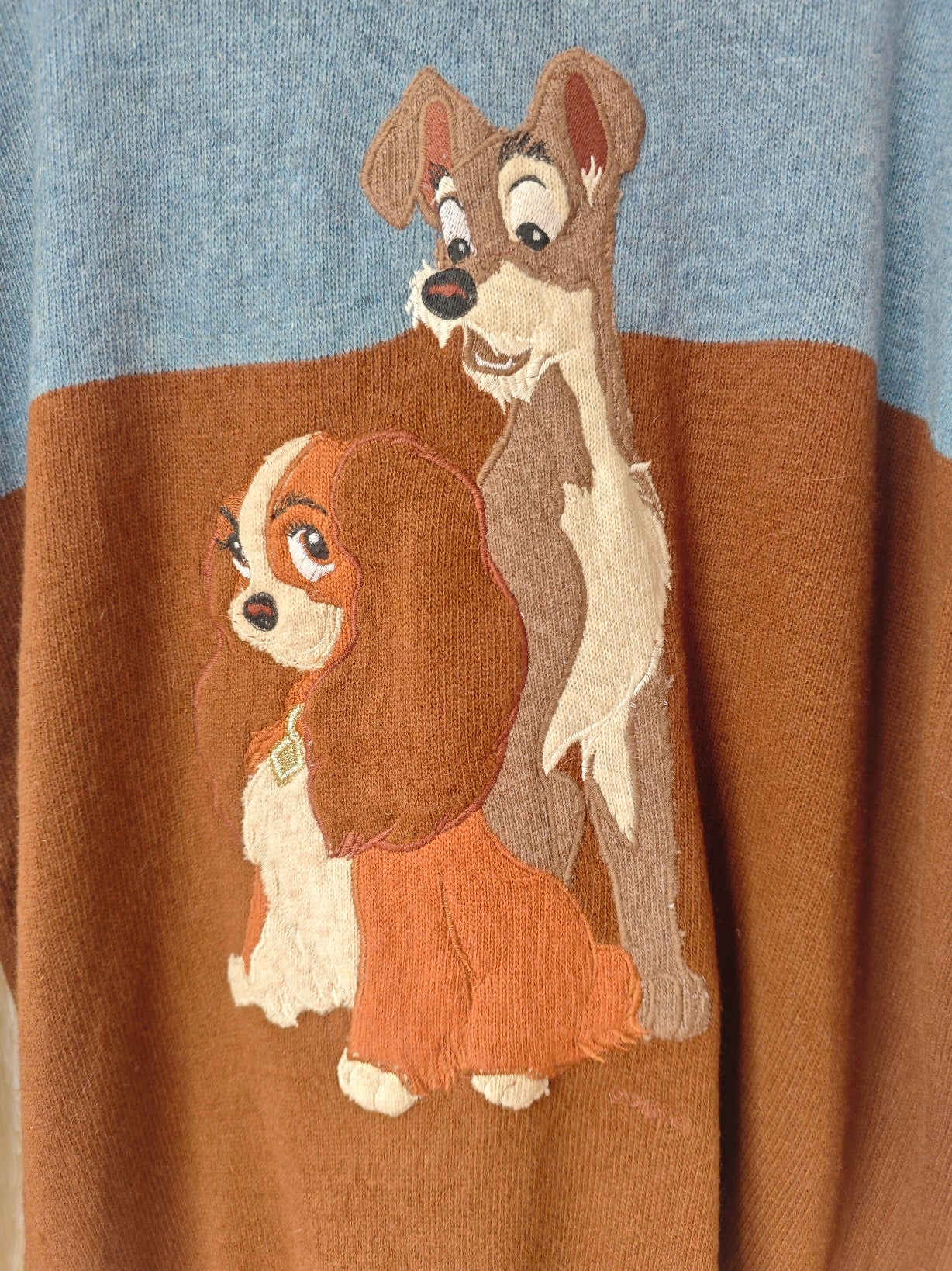 Presenta un ricamo frontale con Lilli e il Vagabondo su fondo bicolore blu denim e marrone caldo.