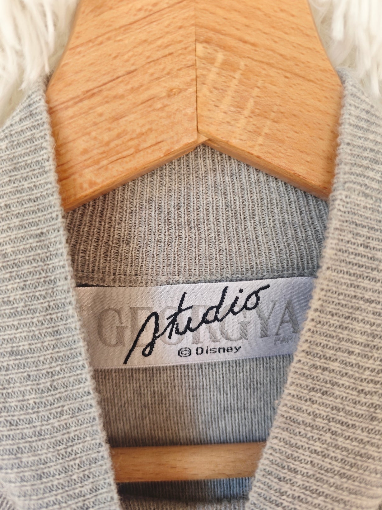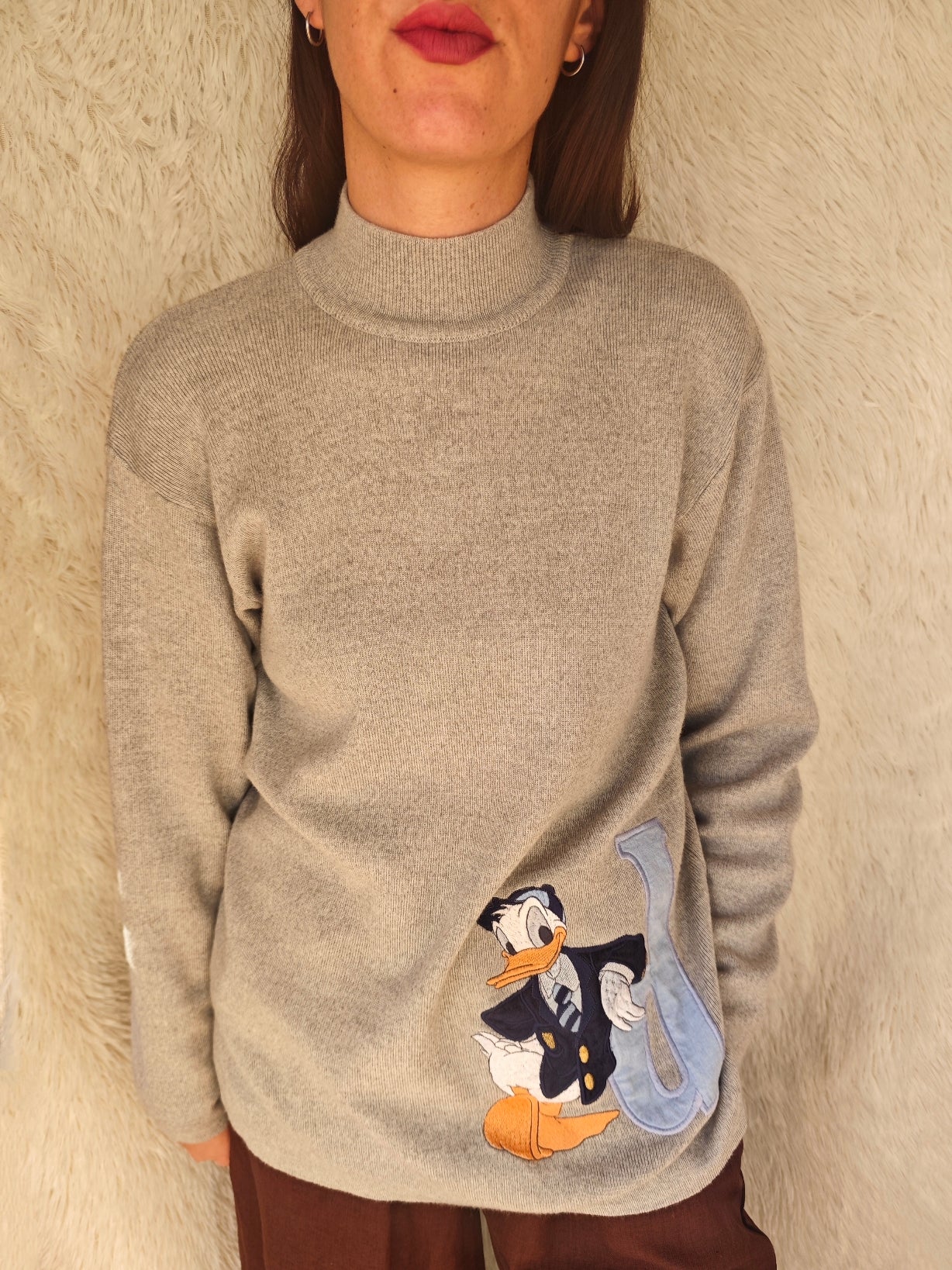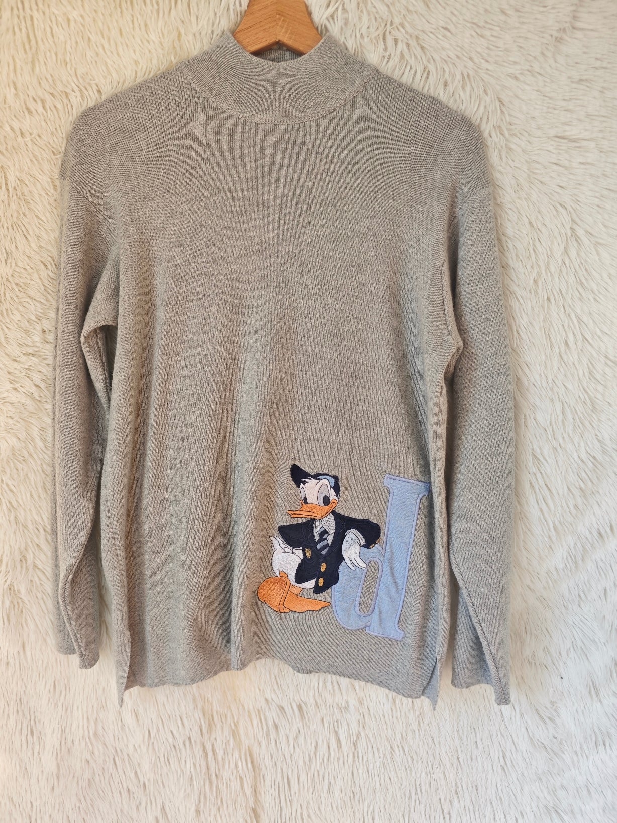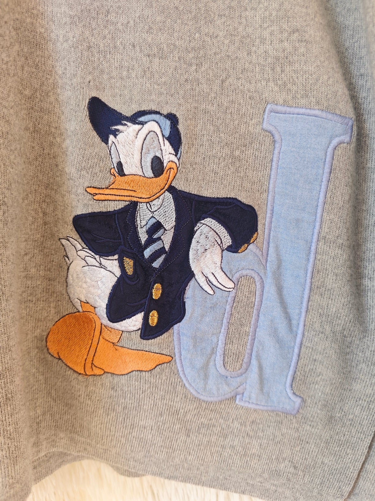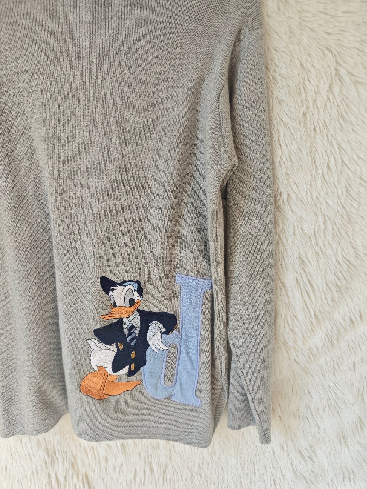Sul davanti, un grande ricamo di paperino in giacca e cravatta accanto alla lettera azzurra “D”, come un vero stemma da campus.