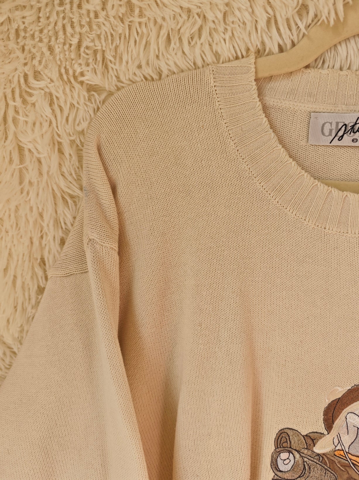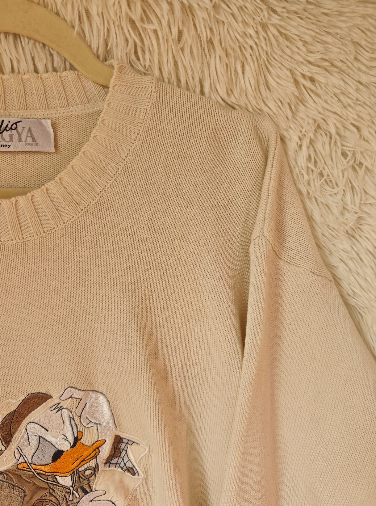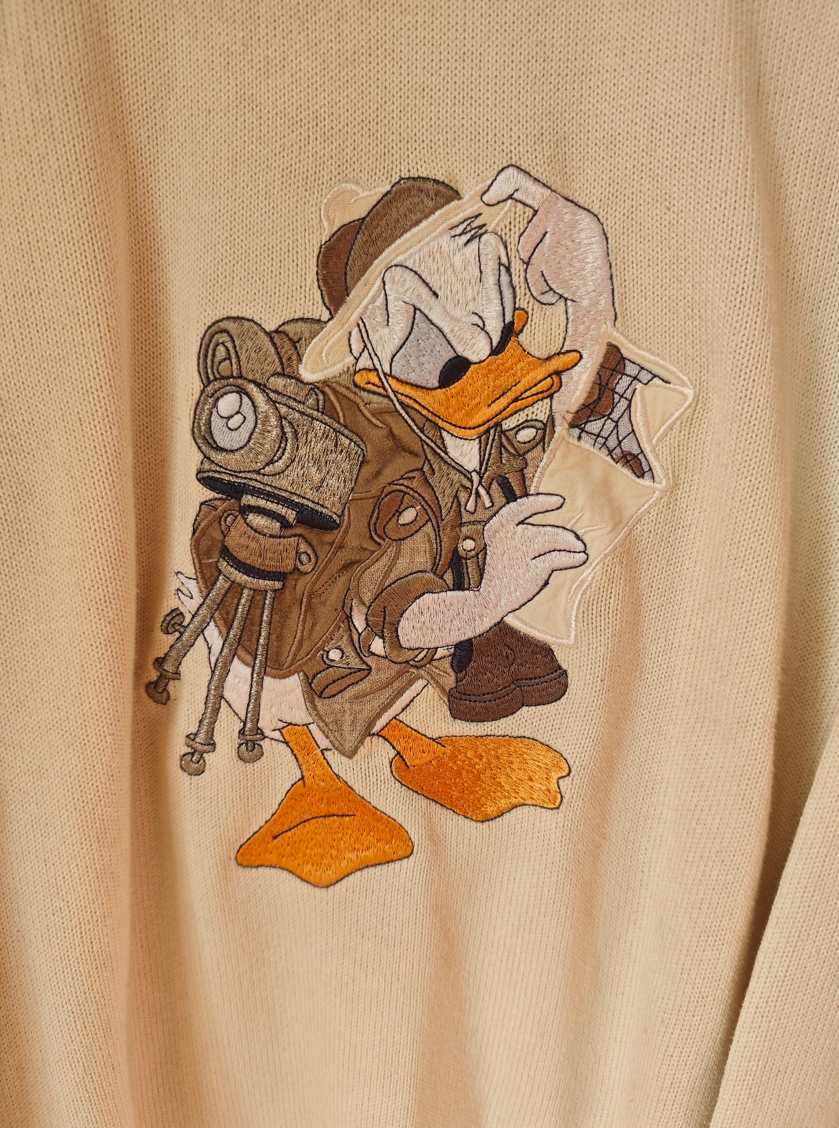 Morbido pull in cotone 100% firmato Georgya Studio, con grande ricamo centrale che raffigura Paperino in versione esploratore, con mappa e attrezzatura da viaggio.