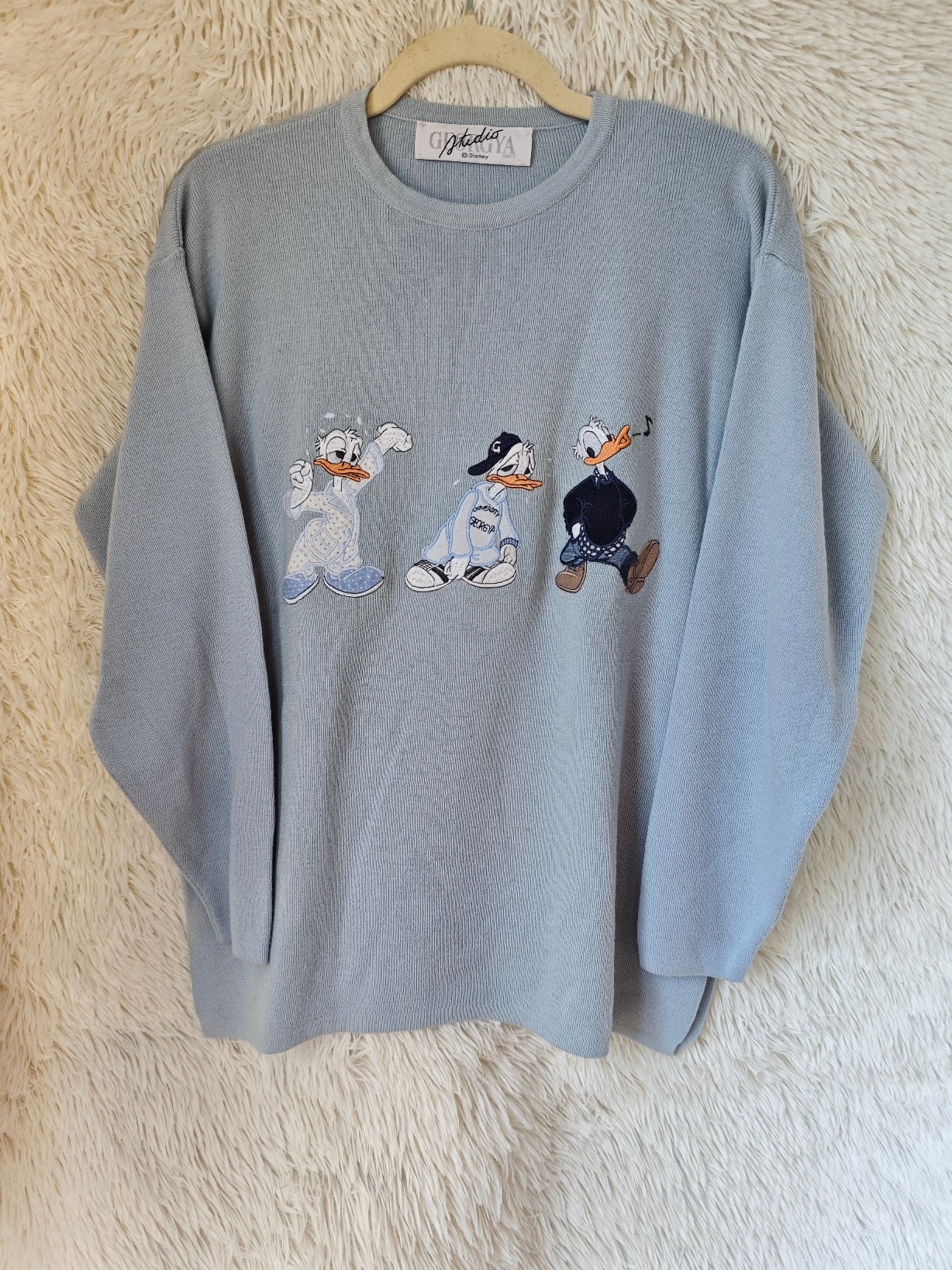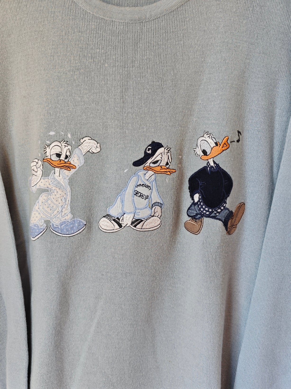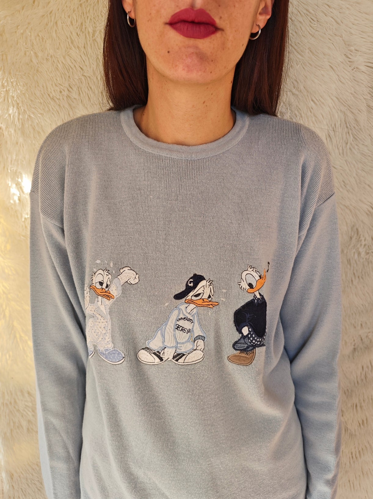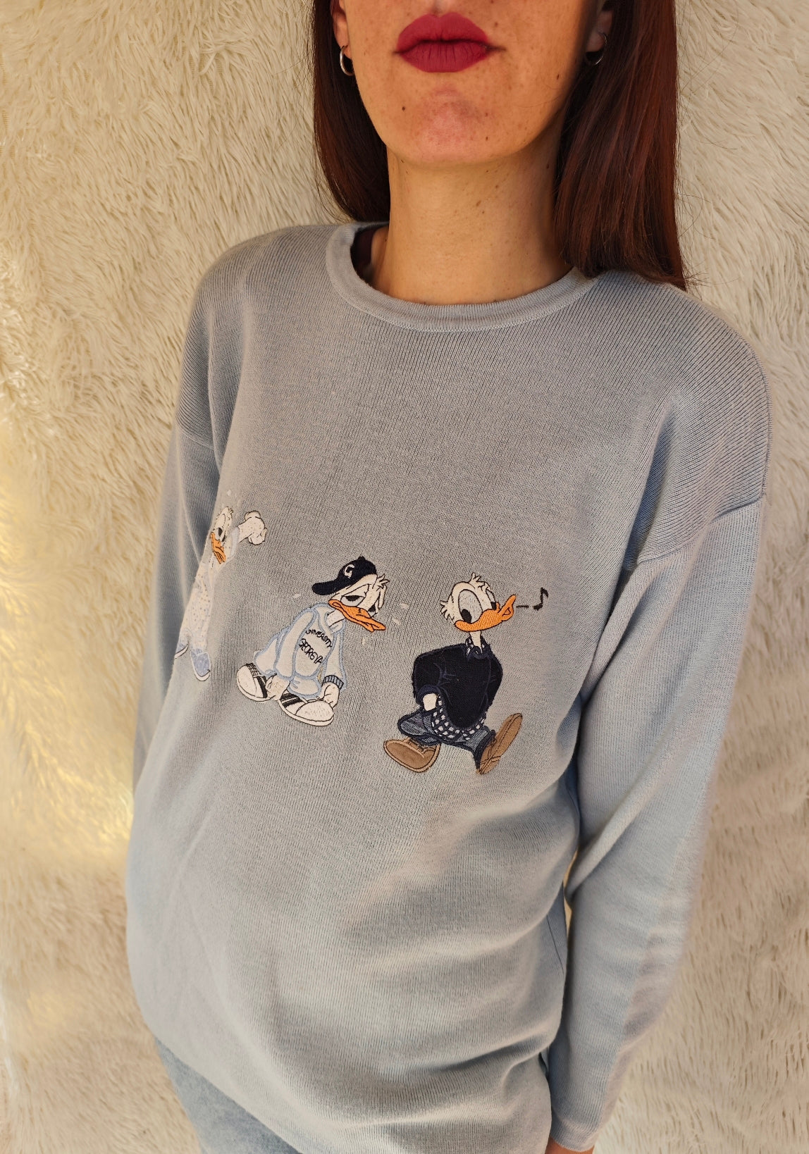 Pull girocollo vintage azzurro polvere firmato Georgya Studio con ricamo frontale di Paperino in tre versioni dal mood streetwear anni ’90. Il capo ha un taglio comodo e morbido.