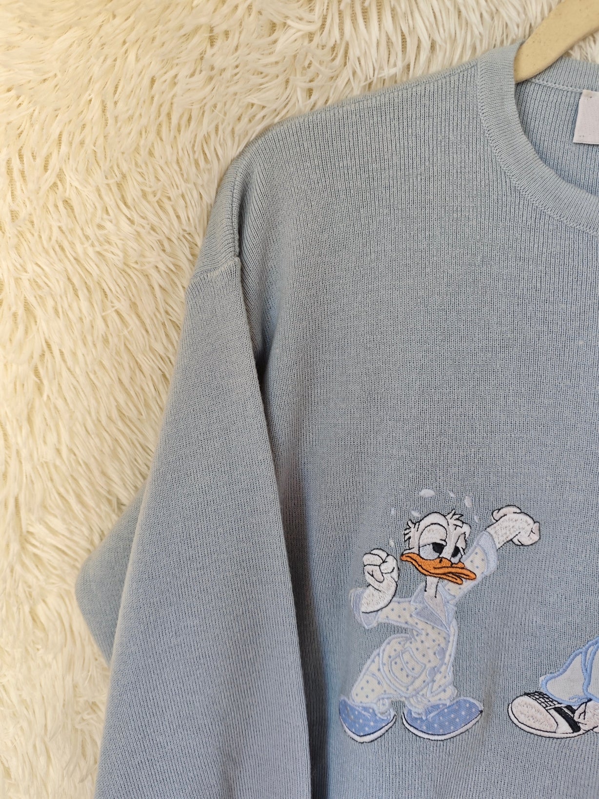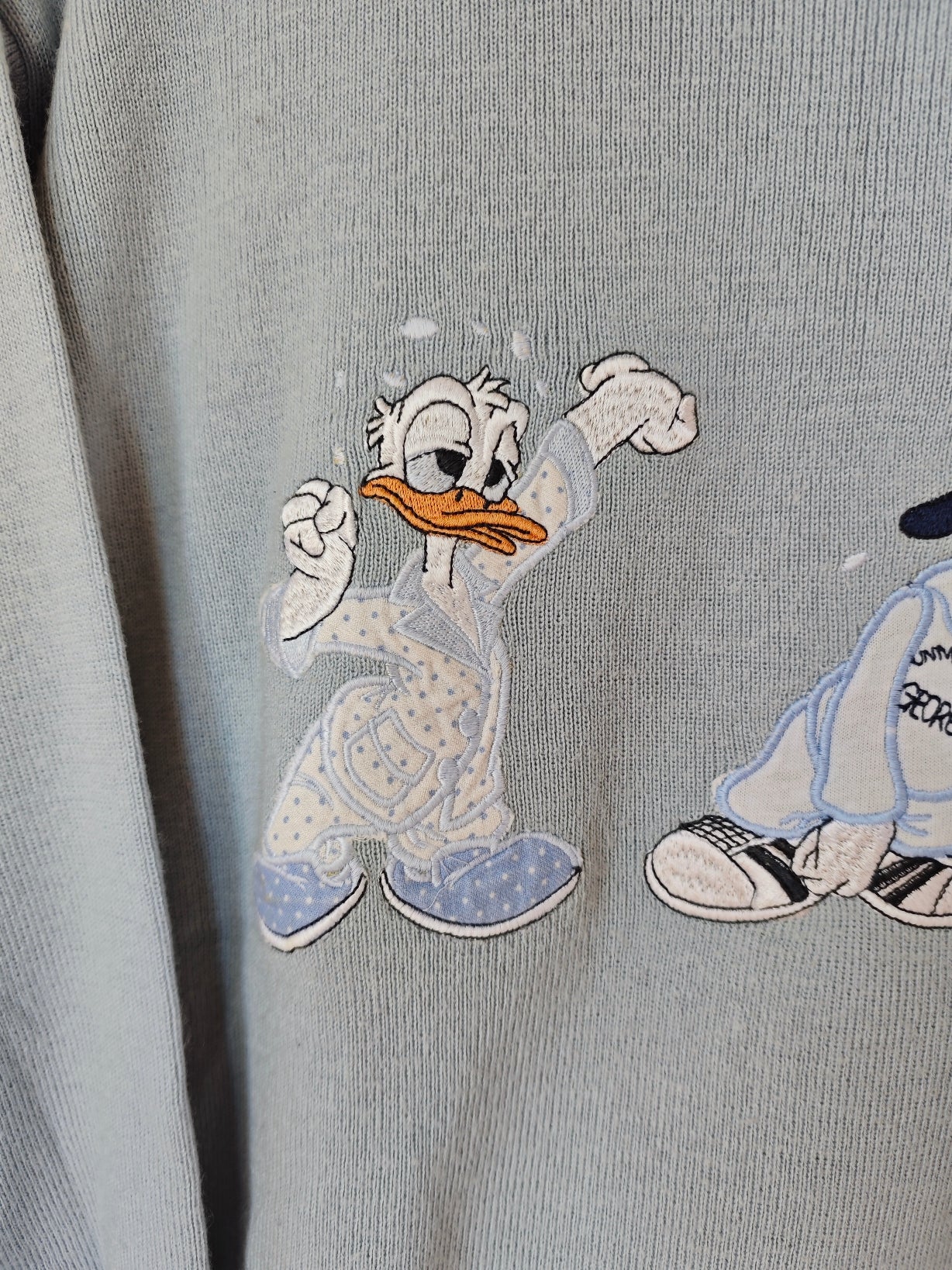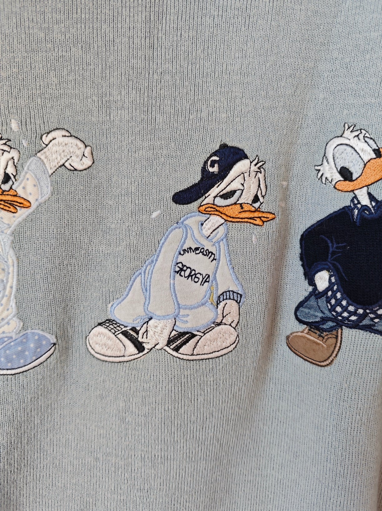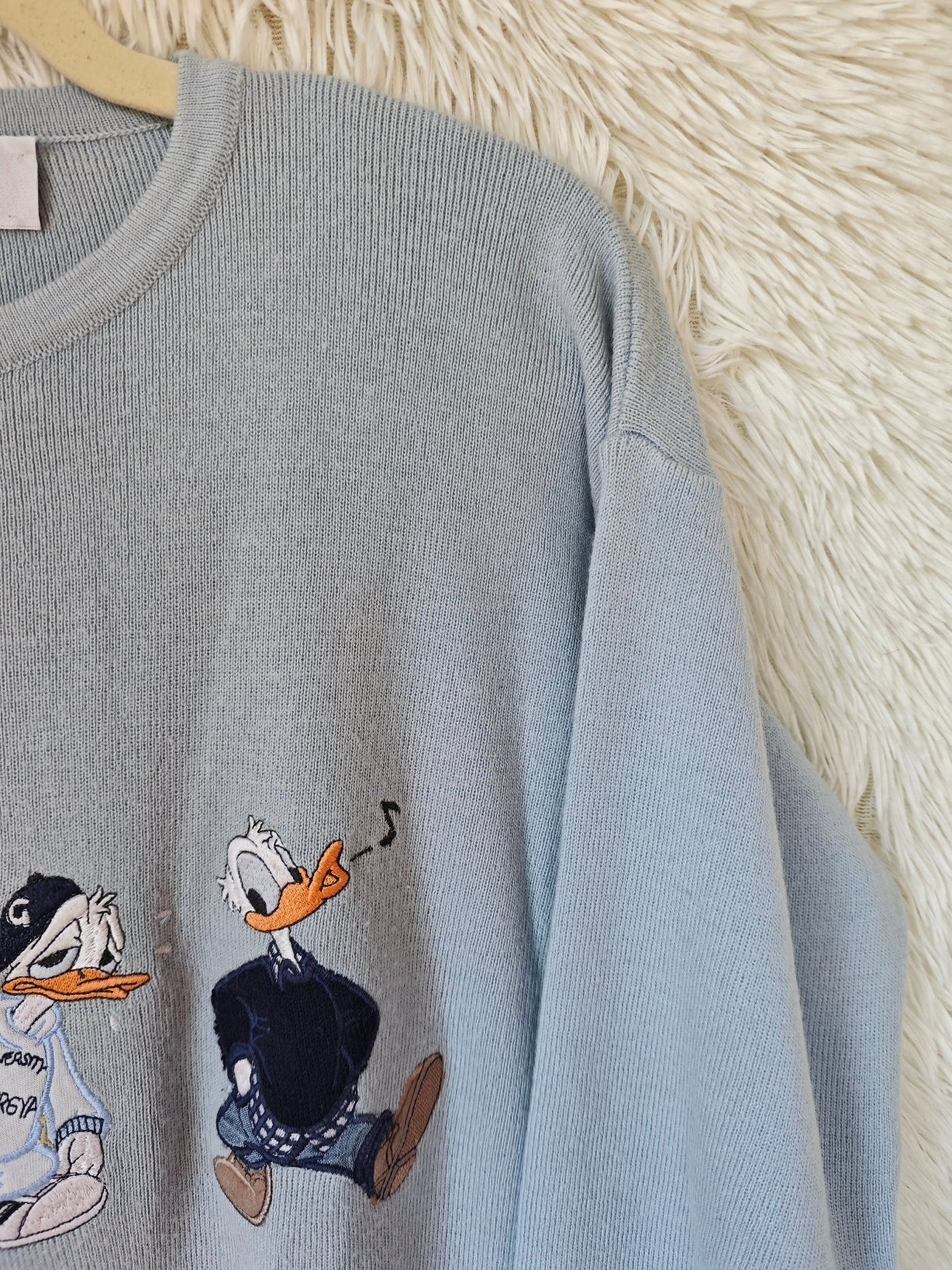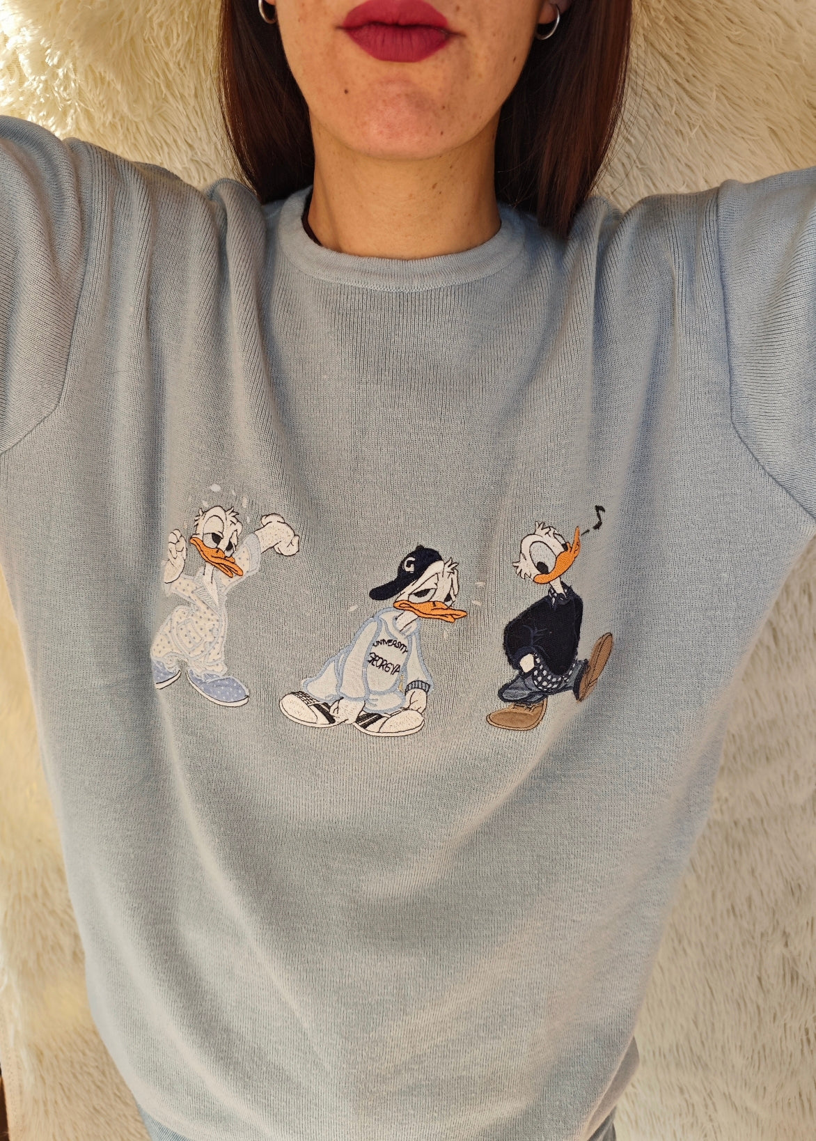 Pull girocollo vintage azzurro polvere firmato Georgya Studio con ricamo frontale di Paperino in tre versioni dal mood streetwear anni ’90. Il capo ha un taglio comodo e morbido.