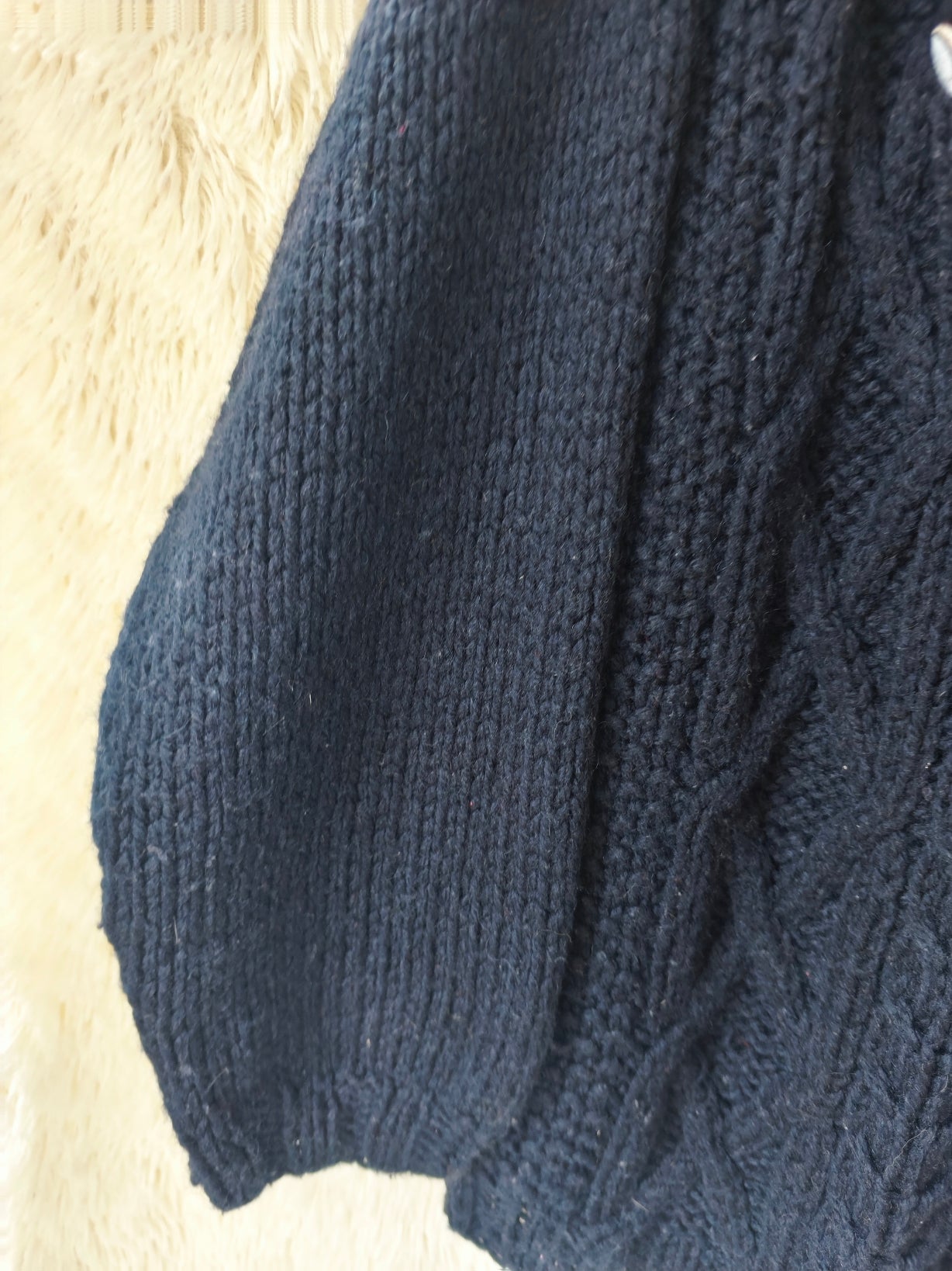 Modello con spalle raglan e lavorazione a trecce e nido d’ape sul davanti.